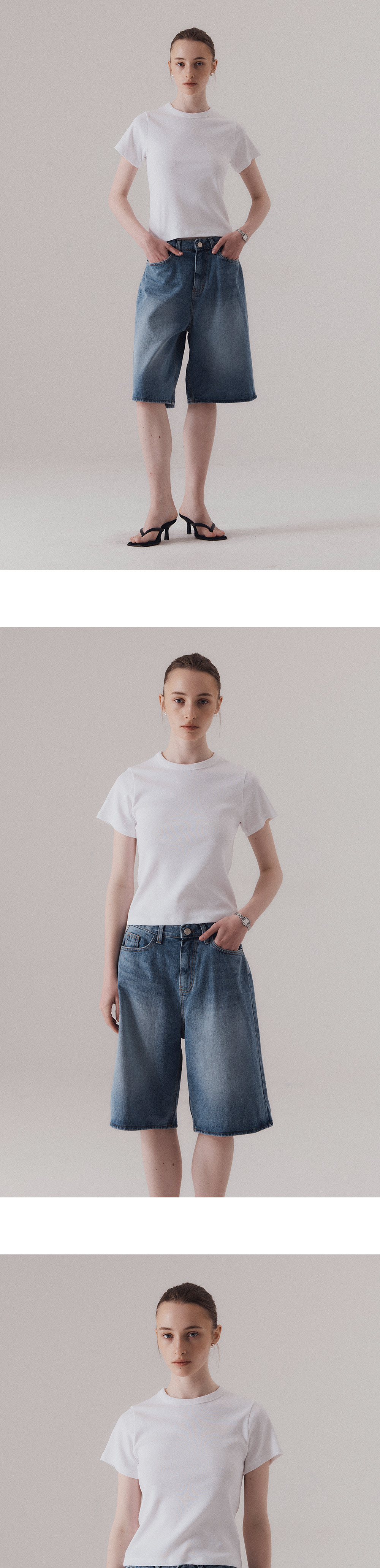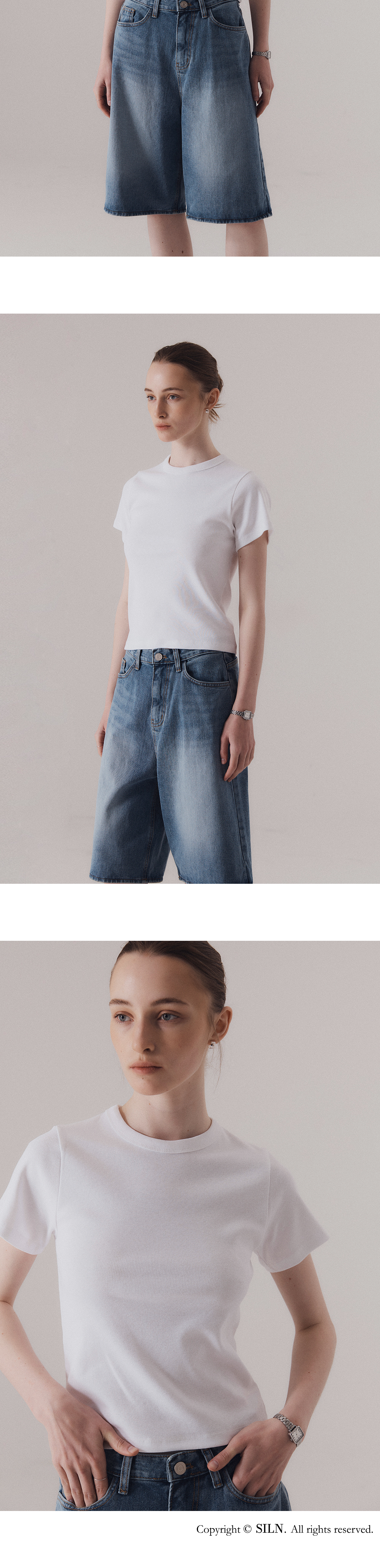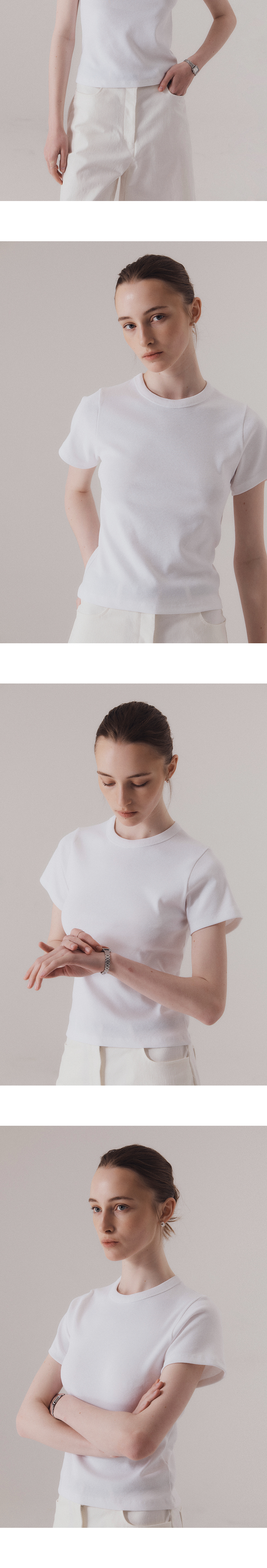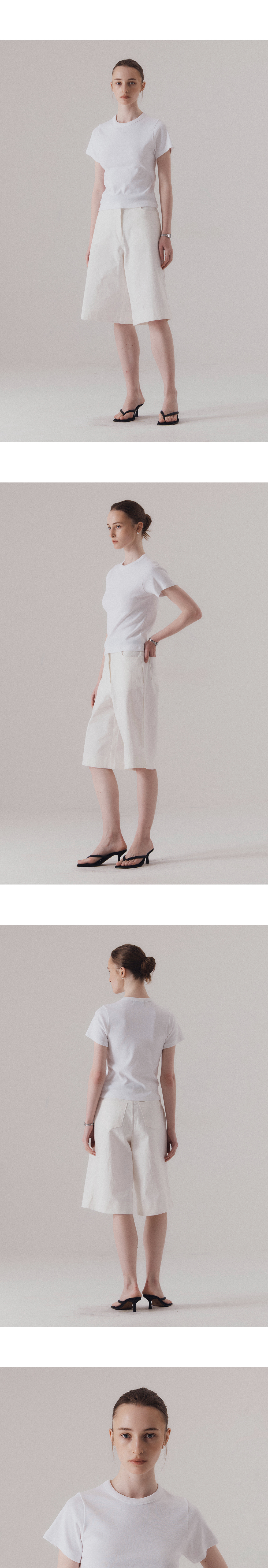 클래식 캐주얼 스타일에서 영감을 얻은 티셔츠입니다. 신축성이 좋은 후라이스 소재를 사용하여 높은 탄력성과 편안한 착용감을 선사합니다. 탄탄한 넥 라인을 위해 제 원단 바인딩 작업을 하였습니다. 하의 Classic contour bermuda pants (WHITE), Washed bermuda denim shorts (BLUE)를 착용하였습니다.