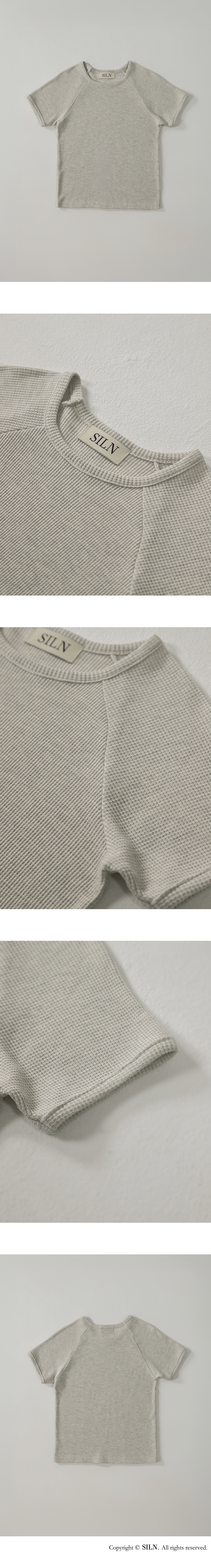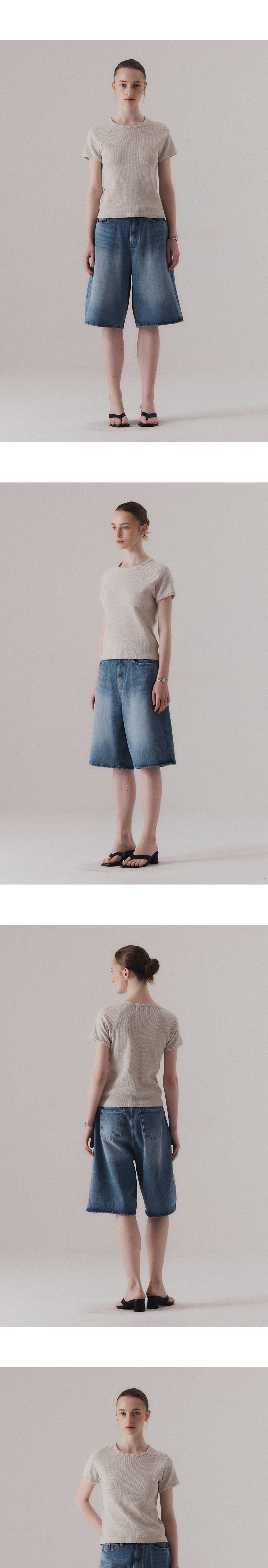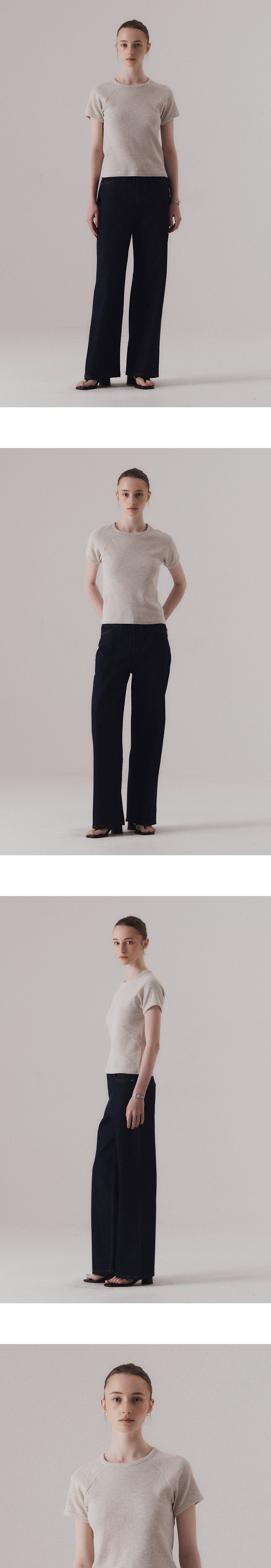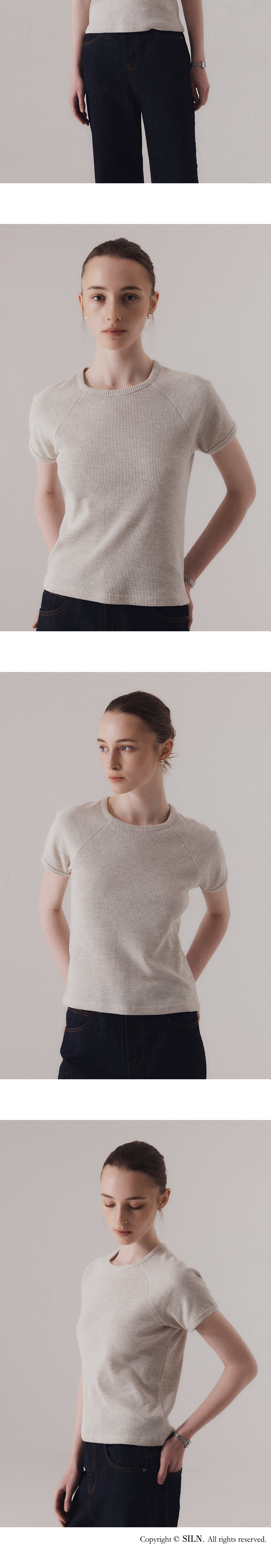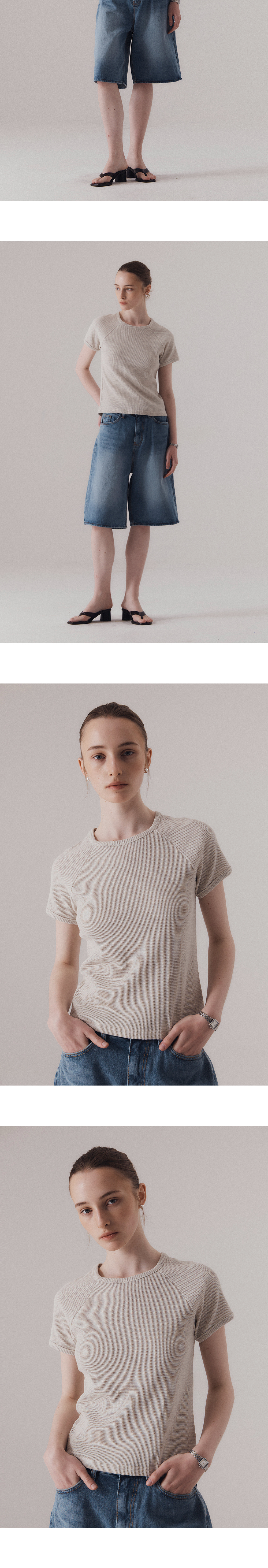 텍스처감 있는 와플 조직의 원단입니다. 단단한 짜임과 유연한 텐션감이 동시에 느껴지는 소재로, 착용 시 몸에 닿는 촉감이 쾌적합니다. 래글런 소매로 어깨선이 자연스럽게 흐르며, 전체적으로 여유로운 실루엣이 특징입니다. 탄탄한 넥 라인과 소매라인을 위해 제 원단 바인딩 작업을 하였습니다. 하의 Washed bermuda denim shorts (BLUE), Non-fade classic indigo wide denim (INDIGO)를 착용하였습니다.