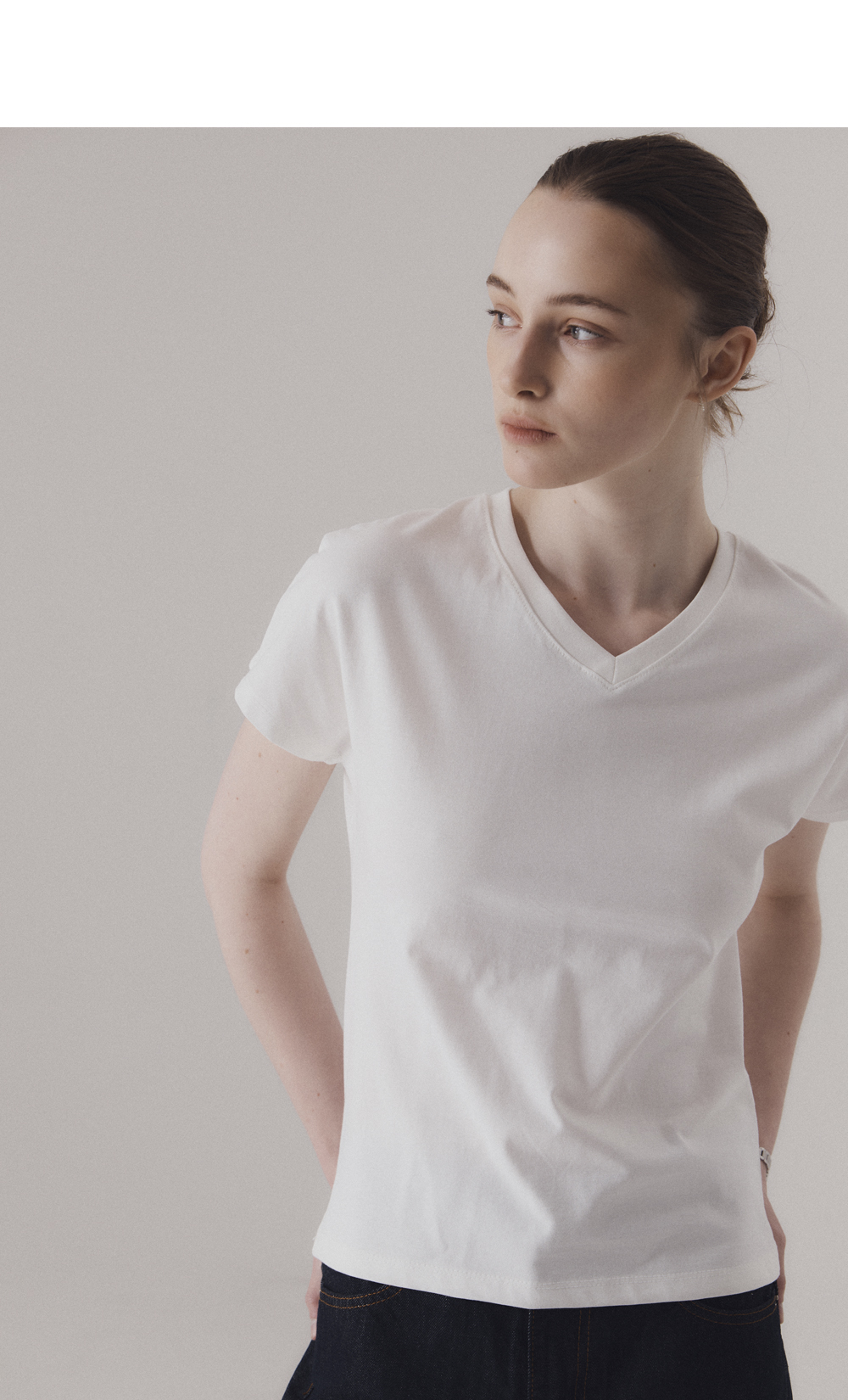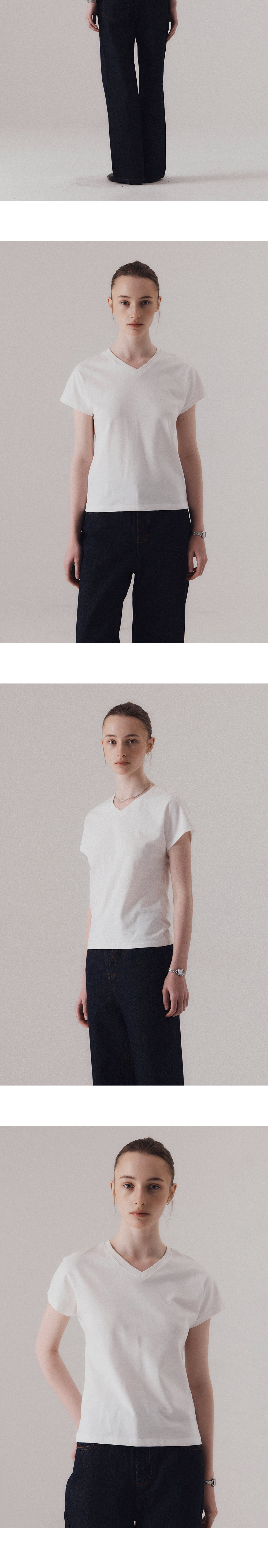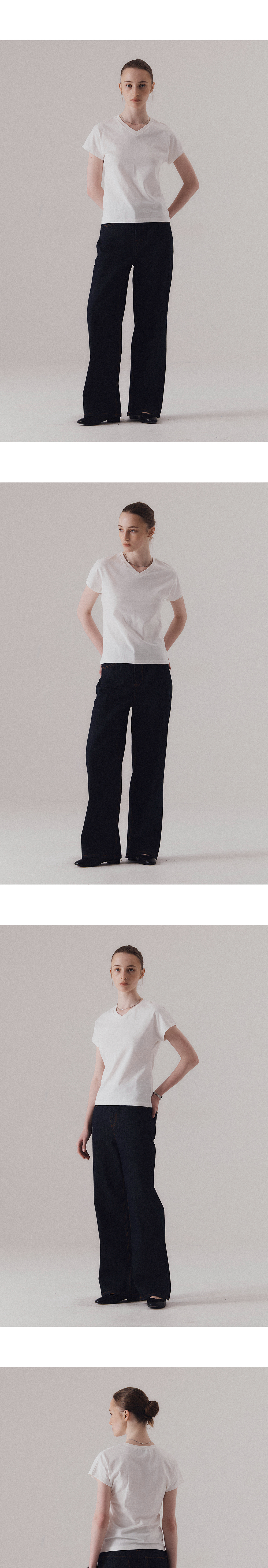 탄탄한 조직감의 면 원단으로 제작된 브이넥 티셔츠입니다. 돌먼 소매 특유의 어깨선이 없이 자연스럽게 이어지는 실루엣이 특징입니다. 적당한 깊이감의 브이넥 라인이 얼굴선을 시원하게 드러내면서 캐주얼한 무드를 더해줍니다. 하의 Non-fade classic indigo wide denim (INDIGO)를 착용하였습니다.