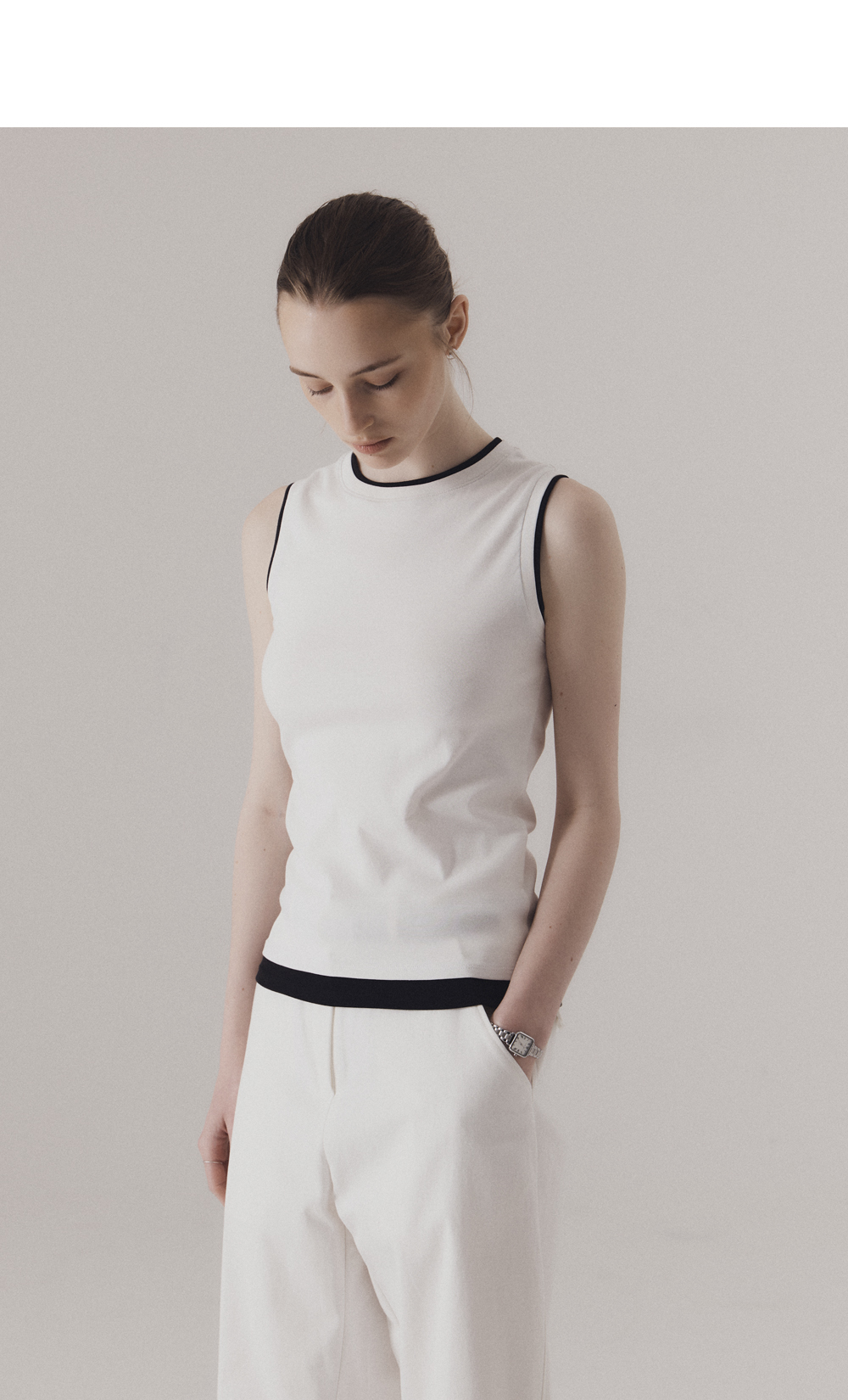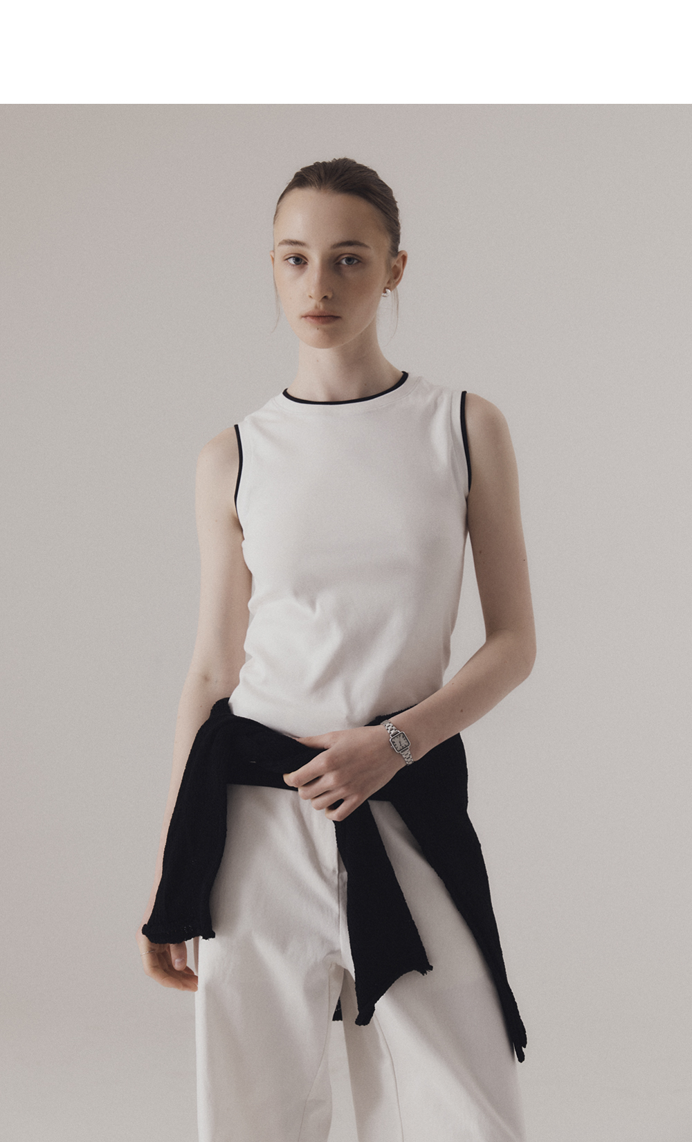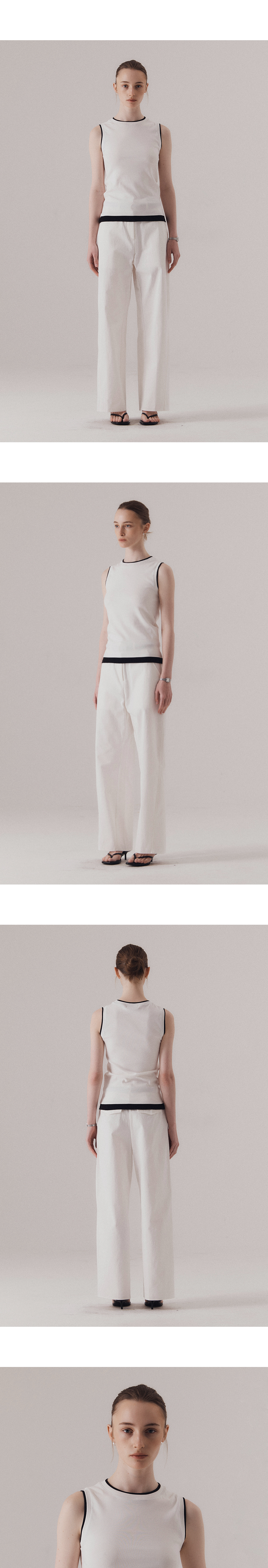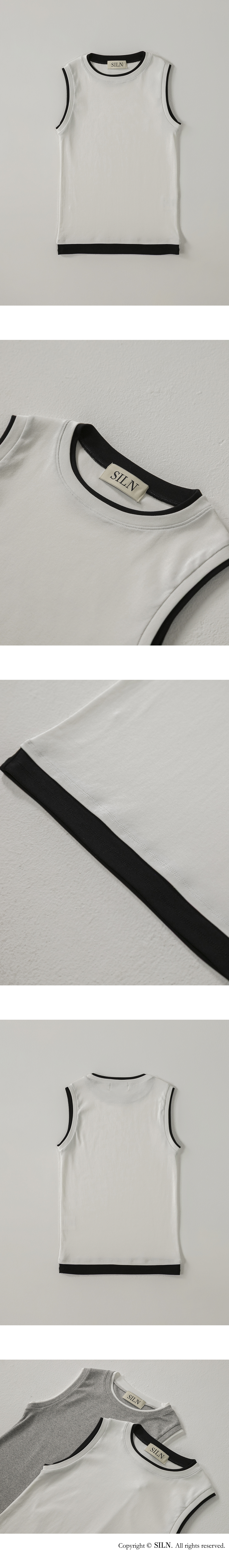 베이직한 실루엣에 감각적인 레이어 디테일을 더한 슬리브리스입니다. 네크라인, 소매단, 밑단에 덧대어진 배색 원단이 마치 이너를 레이어드한듯한 효과를 주며, 단정하면서도 위트 있는 포인트를 완성합니다. 탄탄하면서도 부드러운 후라이스 원단으로 편안한 착용감을 선사하며, 다양한 룩에 데일리로 활용하기 좋은 아이템입니다. 하의 Structure cotton chino pants (WHITE)를 착용하였습니다.