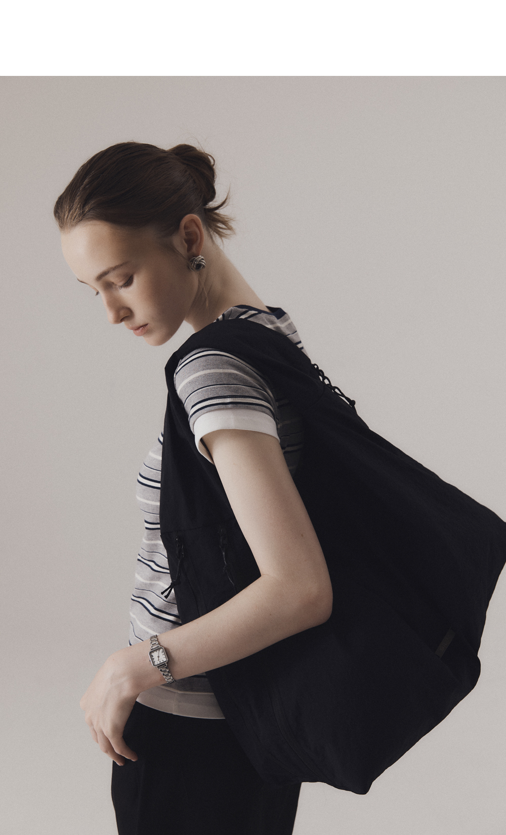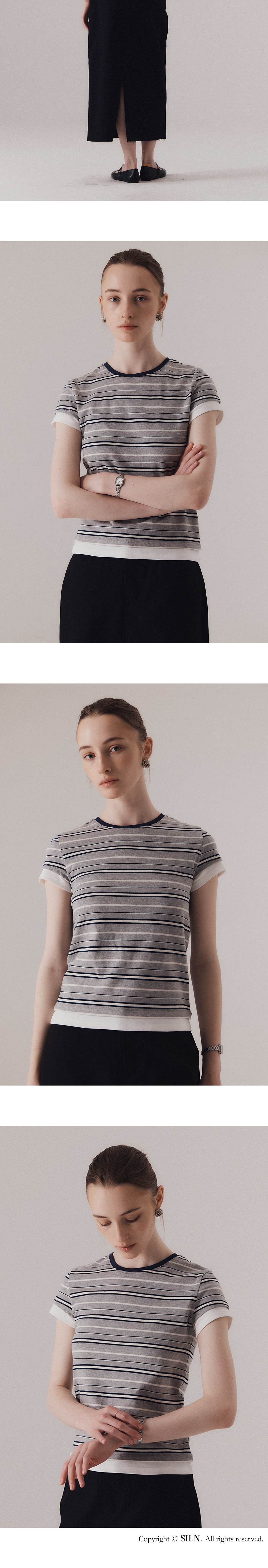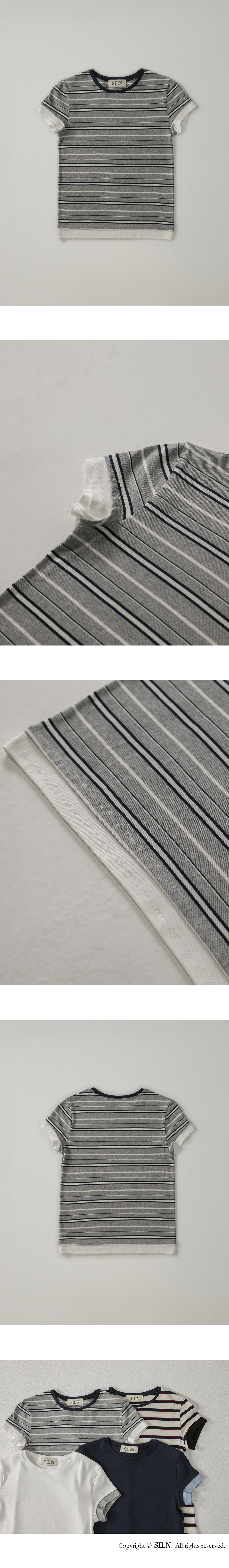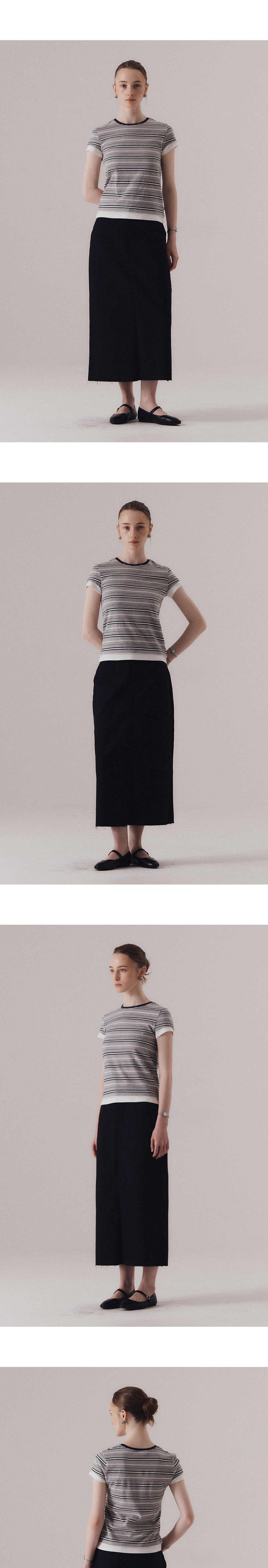 클래식한 스트라이프에 감각적인 레이어드 디테일을 더한 반팔 티셔츠입니다. 탄탄한 코튼 소재로 제작되어 일상 속 편안한 착용감을 선사하며, 소매, 밑단에 덧대어진 배색이 이중으로 입은 듯한 시각적 포인트를 줍니다. 베이직하지만 평범하지 않은 실루엣으로, 단독으로도, 이너로도 활용도 높게 스타일링할 수 있습니다. 하의 Frayed hem cotton skirt (BLACK)를 착용하였습니다.