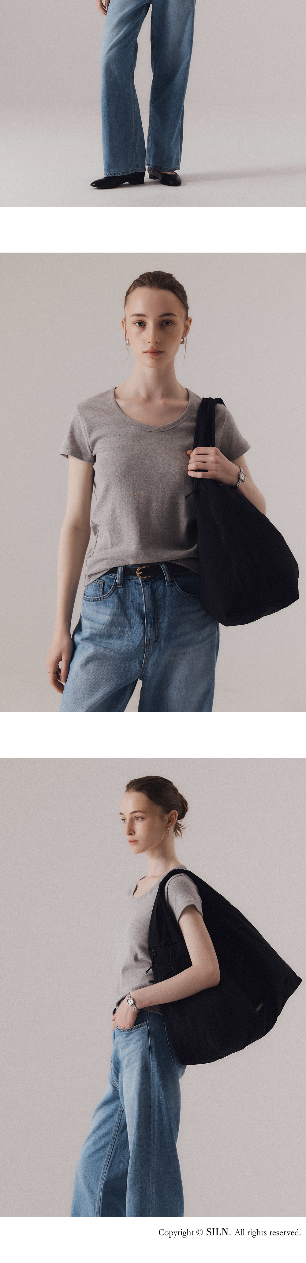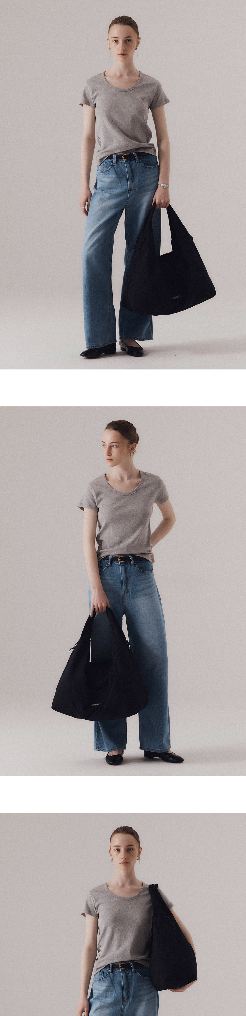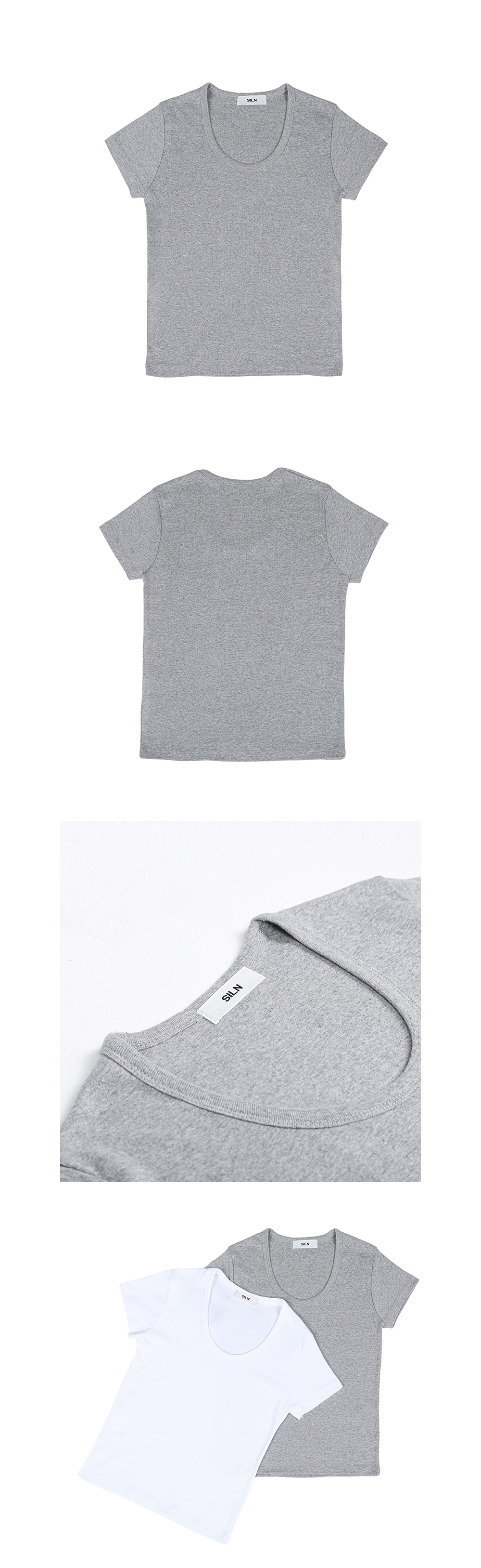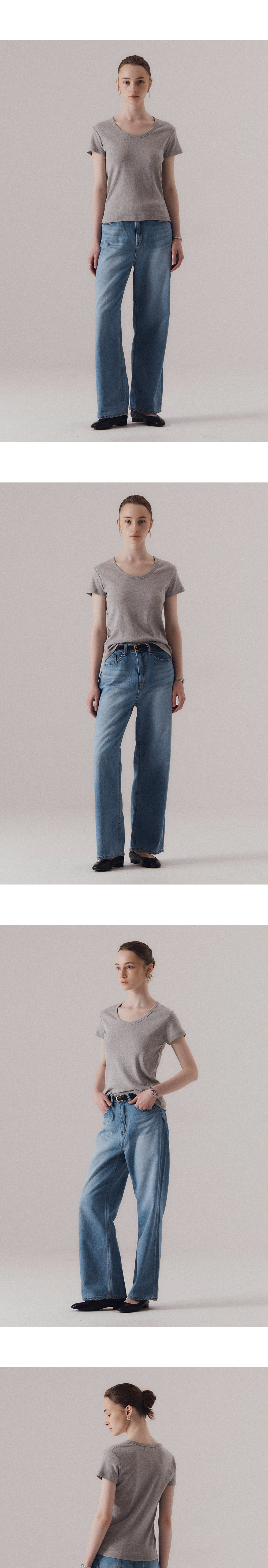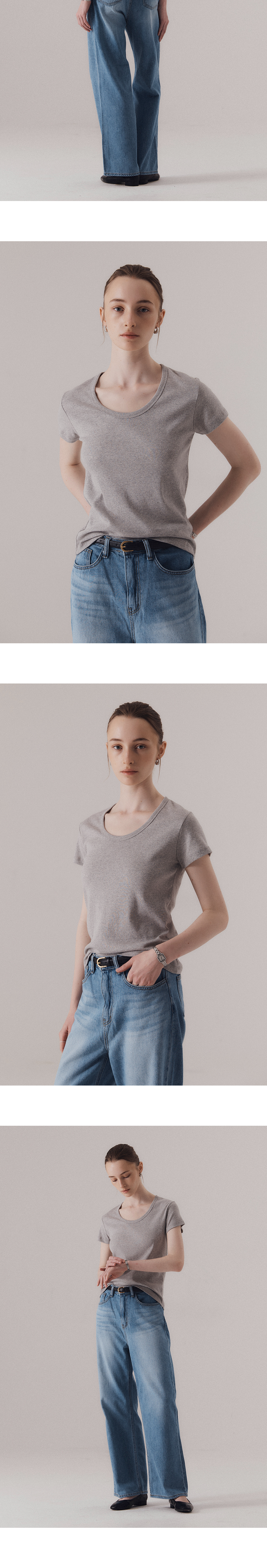 90년대 캐주얼 스타일에서 영감을 얻은 U넥 티셔츠입니다. 신축성이 좋은 후라이스 원단을 사용하여 높은 탄력성과 편안한 착용감을 선사합니다. 탄탄한 넥 라인을 위해 제 원단 바인딩 작업을 하였습니다. 하의 High-waist classic denim (BLUE)를 착용하였습니다.