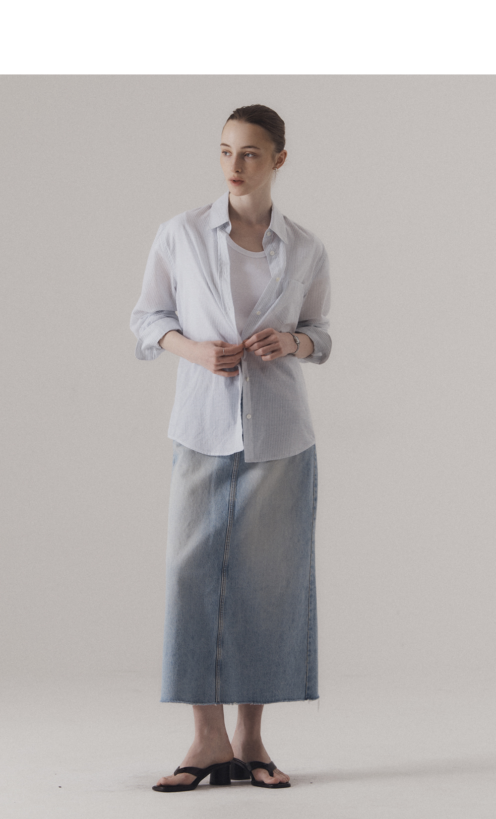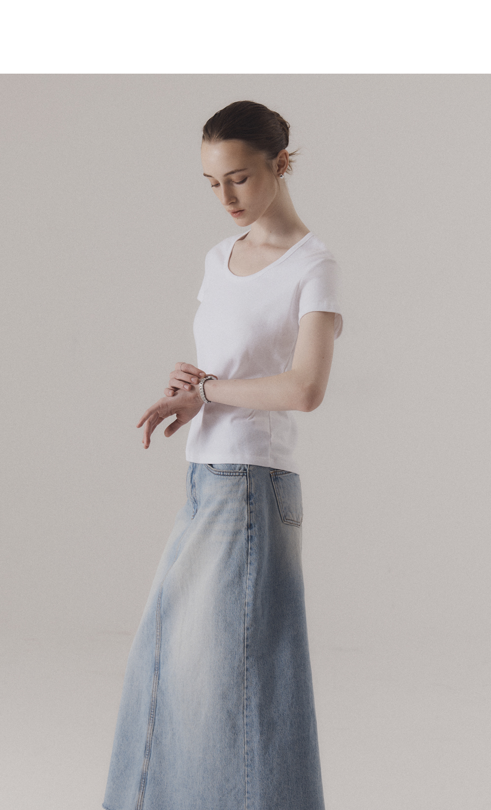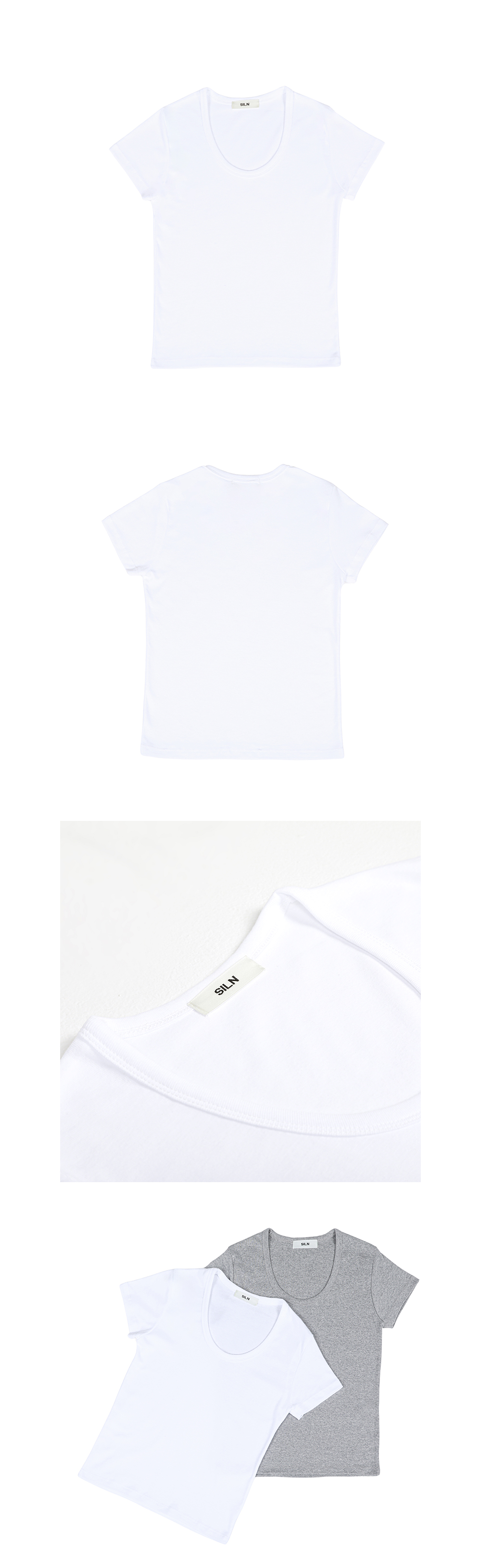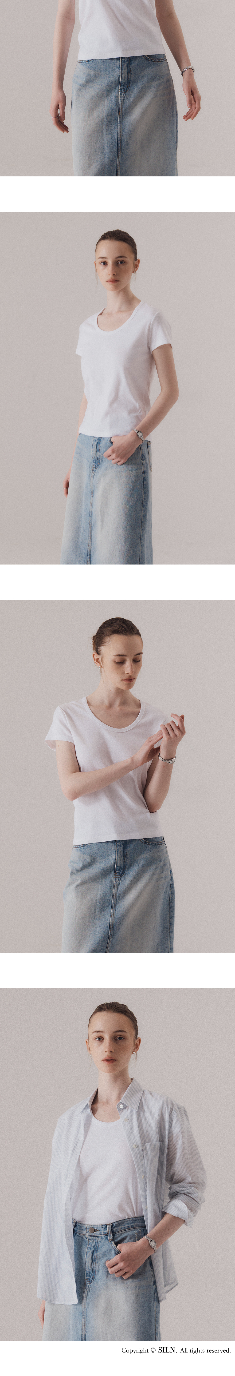 90년대 캐주얼 스타일에서 영감을 얻은 U넥 티셔츠입니다. 신축성이 좋은 후라이스 원단을 사용하여 높은 탄력성과 편안한 착용감을 선사합니다. 탄탄한 넥 라인을 위해 제 원단 바인딩 작업을 하였습니다. 하의 Raw edge classic denim skirt (BLUE)를 착용하였습니다.
