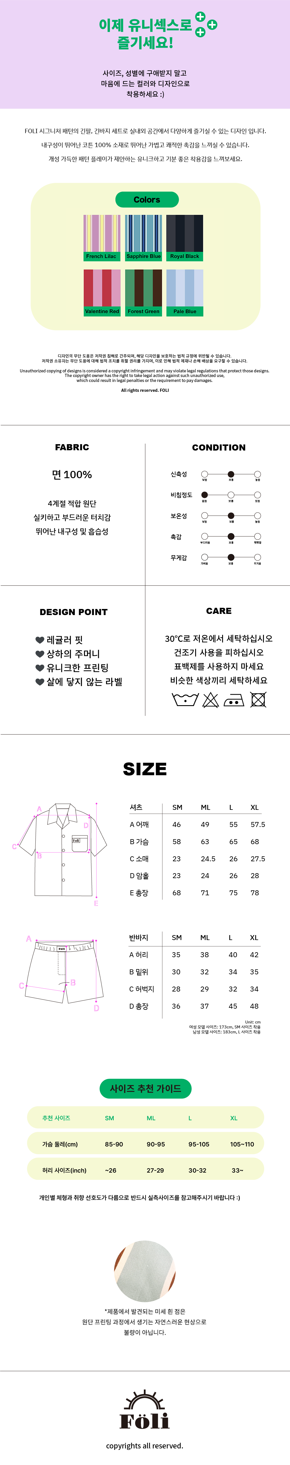 폴리 유니섹스 페일 블루 반팔/반바지 파자마세트