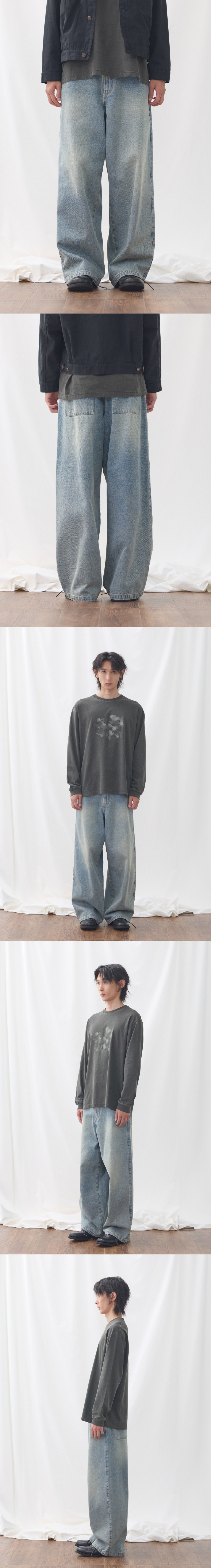 데일리로 활용가능한 빈티지 와이드 데님 팬츠입니다. 바이오 스톤 워싱으로 캐주얼 하면서 빈티지한 무드의 데님 컬러를 연출했습니다. 샌드브러쉬 워싱으로 포인트를 주어 워싱 디테일 추가하였습니다. 택션지는 워싱 후가공 처리하여 이스트서비스샵만의 무드를 제공합니다. 지퍼는 YKK사의 4.5호 금속 지퍼를 사용하였습니다. Shell : Cotton 71% Polyester 29% 46 : 총장 106.5, 허리단면 38, 엉덩이단면 53, 허벅지단면 37.6, 밑위길이 34.2, 밑단단면 28 48 : 총장 108.5, 허리단면 40.5, 엉덩이단면 55.5, 허벅지단면 39, 밑위길이 35, 밑단단면 29 50 : 총장 110.5, 허리단면 43, 엉덩이단면 58, 허벅지단면 40.4, 밑위길이 35.8, 밑단단면 30 Model (Men1) : 184cm, 상의 M사이즈 하의 48 착용 Model (Men2) : 183cm, 상의 M사이즈 하의 48 착용