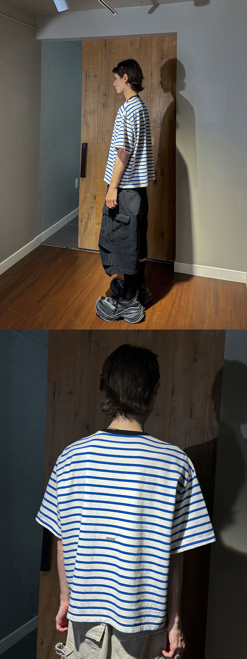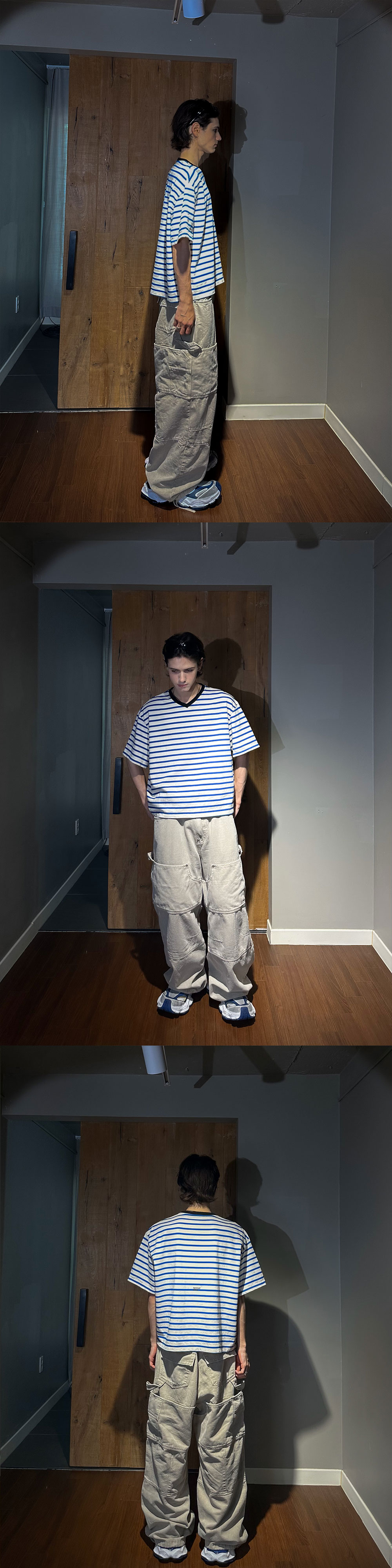 논노드 크롭 브이넥 티셔츠 블루 스트라이프