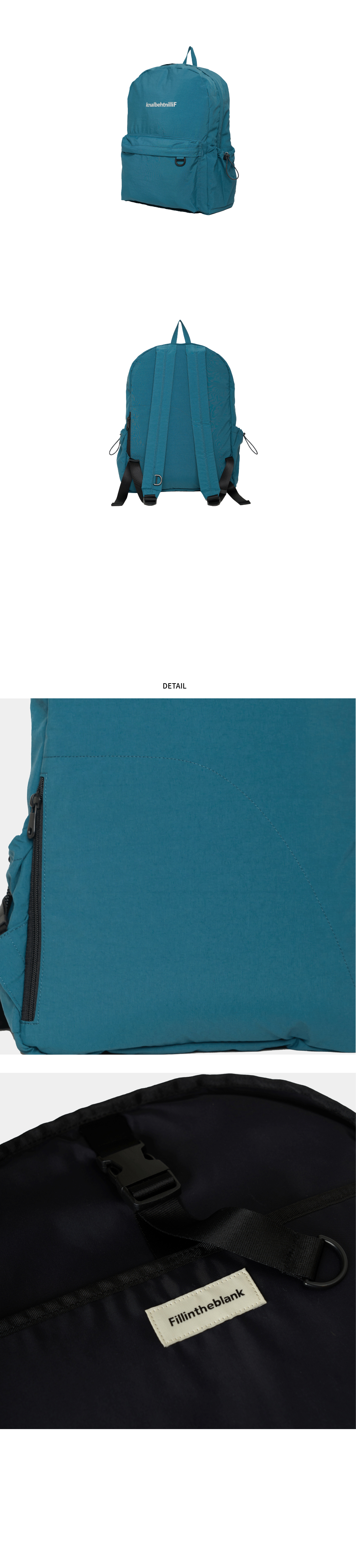 가볍고 실용적인 나일론 소재의 데일리 경량 백팩 · 15인치 노트북 전용 내부 수납 칸 · 후면에 실용적인 히든 포켓 추가 · 넉넉한 전면 포켓 · 키링등 연출 가능한 전면부 포켓 위 D링 디테일 · 실용성과 스타일 연출이 가능한 스트랩 D링 디테일