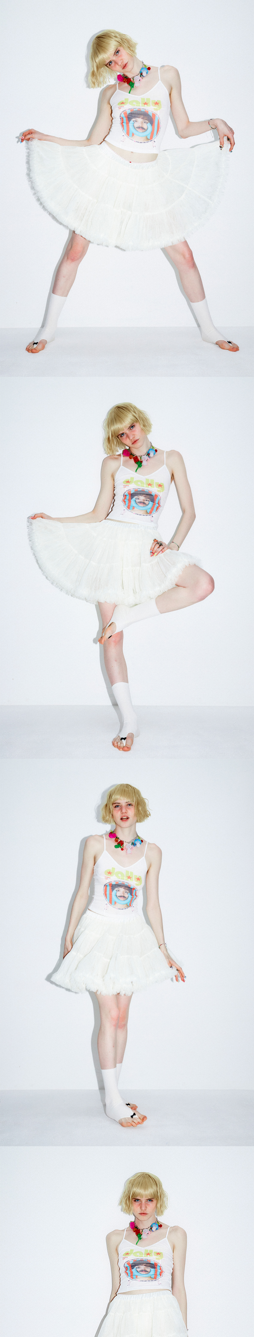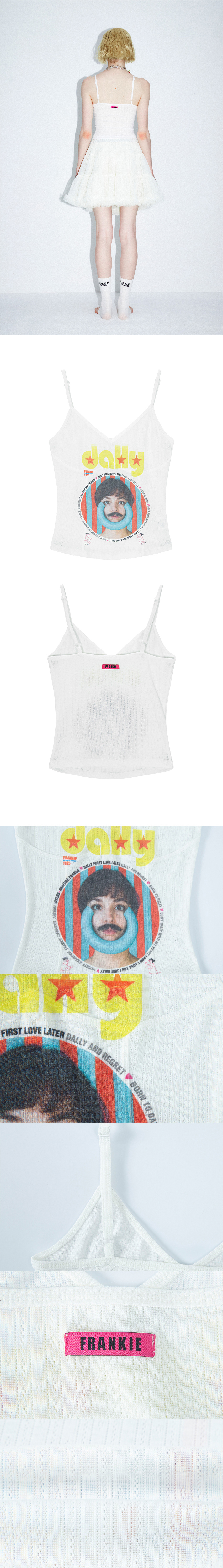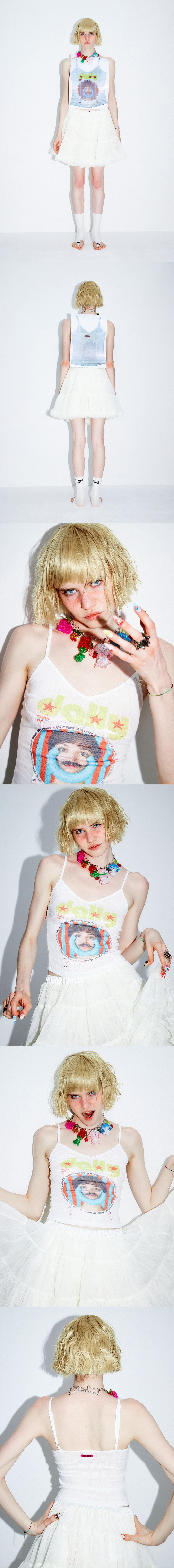사이즈 : FREE 어깨: 21cm / 가슴: 29cm / 총장: 30cm/26.5cm 1–3cm 정도의 오차가 있을 수 있음 Natasha : 175cm 51kg 1970년~2016년대 호주와 뉴질랜드 10대 여학생을 대상으로 출간 하던 DOLLY Magazine을 패러디한 아트웍을 전면 중앙에 전사 프린트한 제품입니다 가슴과 몸통을 따라 들어간 다각도 절개선이 착용 시 예쁜 실루엣을 만들어주며 얇고 은은하게 비치는 시스루 소재가 전체적인 룩에 빈티지한 느낌과 성숙한 분위기를 더해줍니다 절개가 가득한 완성품 위에 전사 프린트를 진행하여 개체마다 프린트의 위치 및 헤짐 정도가 일정하지 않습니다 또한 소재의 특성상 프린트가 진하고 선명하지 않습니다 이는 프랭키가 의도한 빈티지한 연출 이기에 위와 같은 사유로 교환및 환불은 불가 합니다 -혼용률- 폴리에스테르 70% 레이온 25% 스판 5% -주의- 옷을 뒤집어 미지근한 물에 세탁 표백제나 강력한 세제 사용 금지 건조기 사용 금지 Made in KOREA