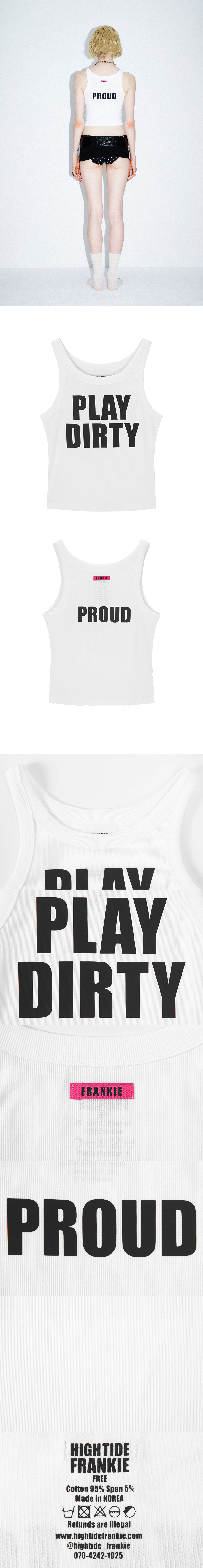 사이즈 : FREE 어깨: 25cm / 가슴: 31.5cm / 총장: 37cm 측정 방법이나 위치에 따라 1–3cm 정도의 오차가 있을 수 있습니다 Natasha : 175cm 51kg 기본 탱크탑 제품으로 촘촘하게 짜인 골지 스판 혼방 원단으로 제작되어 편안한 착용감을 제공합니다 클래식한 실루엣에 앞면에는 "PLAY DIRTY" 뒷면에는 "PROUD" 문구가 프린트되어 있습니다 문구는 폴리우레탄 필름을 정밀하게 커팅한 뒤 열 프레스 방식으로 원단에 부착하는 PU 열전사 공정으로 작업되었습니다 이 공정은 심플한 아이템에 색다른 촉감과 소재의 재미를 더해줍니다 -혼용률- 면 95% 스판 5% -주의- 옷을 뒤집어 미지근한 물에 세탁 표백제나 강력한 세제 사용 금지 건조기 사용 금지 Made in KOREA