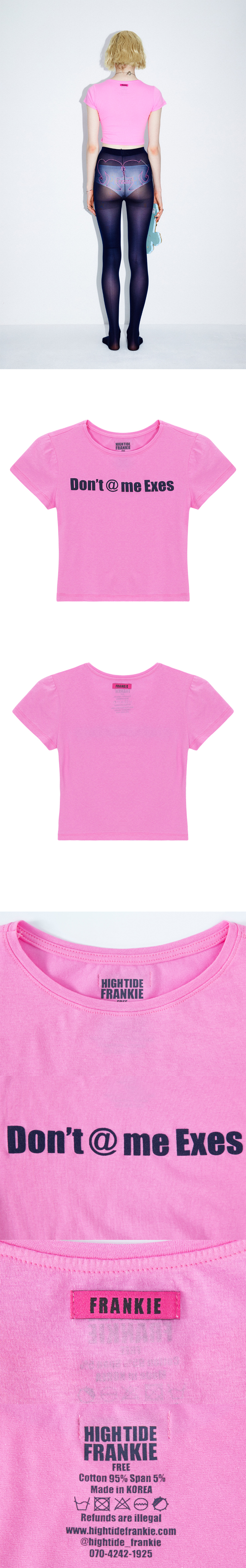 사이즈 : FREE 어깨: 30.5cm / 가슴: 31cm / 소매: 13cm / 총장: 39cm 측정 방법이나 위치에 따라 1–3cm 정도의 오차가 있을 수 있습니다 Natasha : 175cm 51kg 슬림핏 반팔 티셔츠로 스판 혼방 소재로 제작되어 하루 종일 편안하게 착용할 수 있습니다 Don't @ me Exes 을 앞면에 플로킹 공정으로 처리하어 풍부한 텍스처와 시각적 포인트를 더합니다 어떤 스타일에도 자연스럽게 어울리는 기본 아이템으로 데일리로 즐기기 좋은 필수템입니다 -혼용률- 면 95% 스판 5% -주의- 옷을 뒤집어 미지근한 물에 세탁 표백제나 강력한 세제 사용 금지 건조기 사용 금지 Made in KOREA
