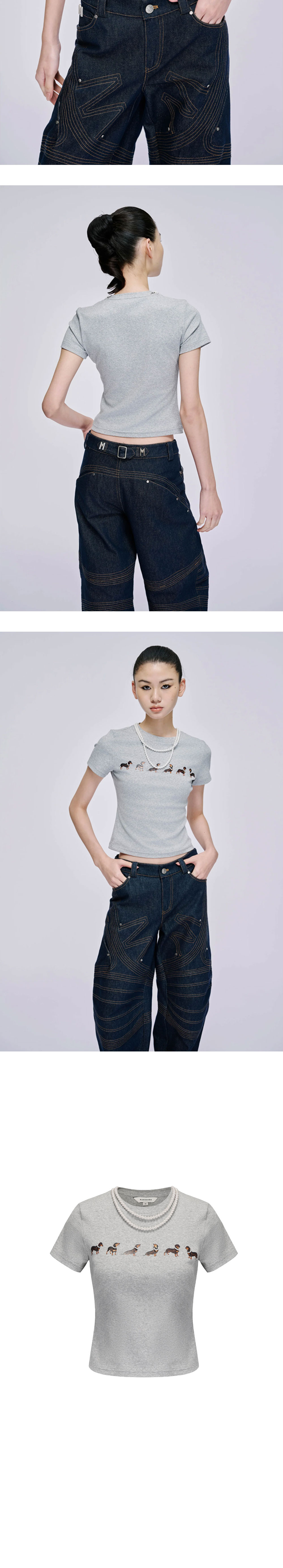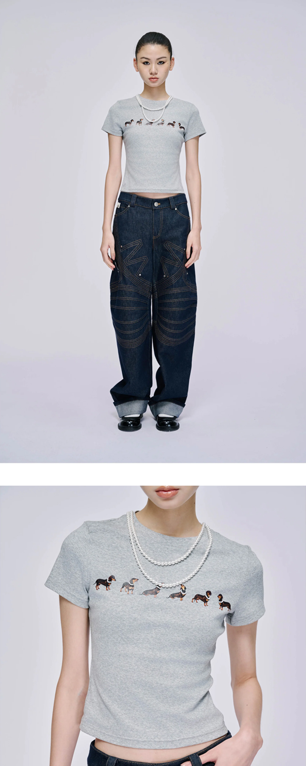 강아지 프린트와 진주 체인 디테일이 매력적인 마크공의 도그 프린트 저지 티셔츠입니다. -신축성 있는 원단 -탈부착 가능한 진주 체인 디테일 -숏 슬리브