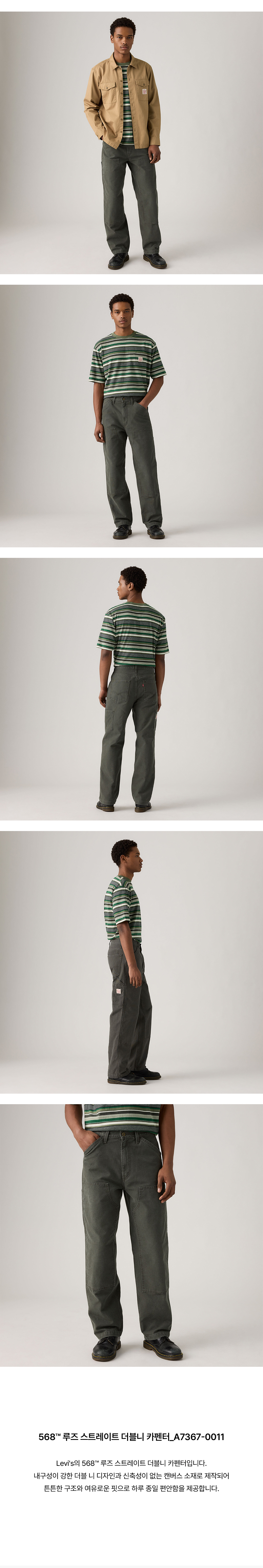 Levi's의 568™ 루즈 스트레이트 더블니 카펜터입니다. 내구성이 강한 더블 니 디자인과 신축성이 없는 캔버스 소재로 제작되어 튼튼한 구조와 여유로운 핏으로 하루 종일 편안함을 제공합니다.