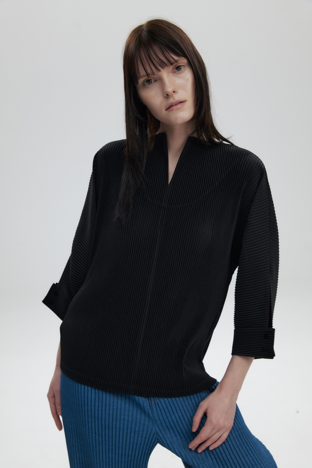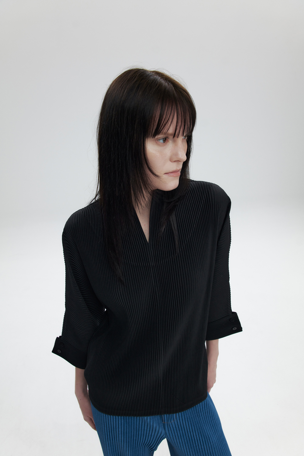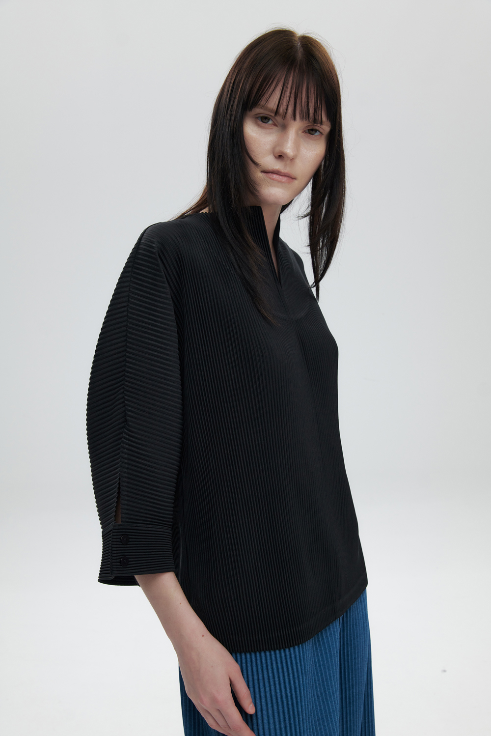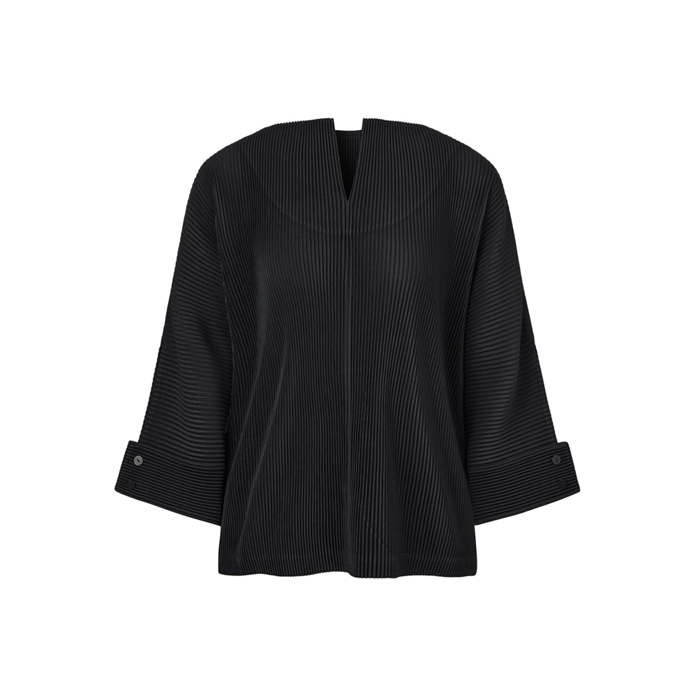 몽플리쎄 여성 오픈 카라 7부 소매 플리츠 블라우스 블랙
