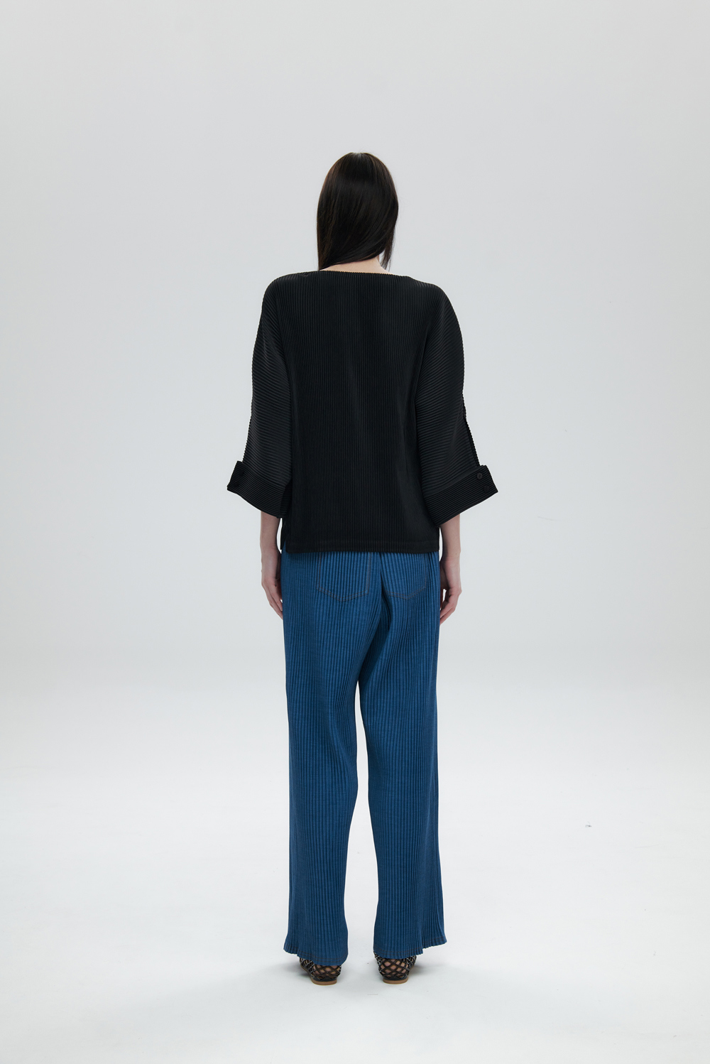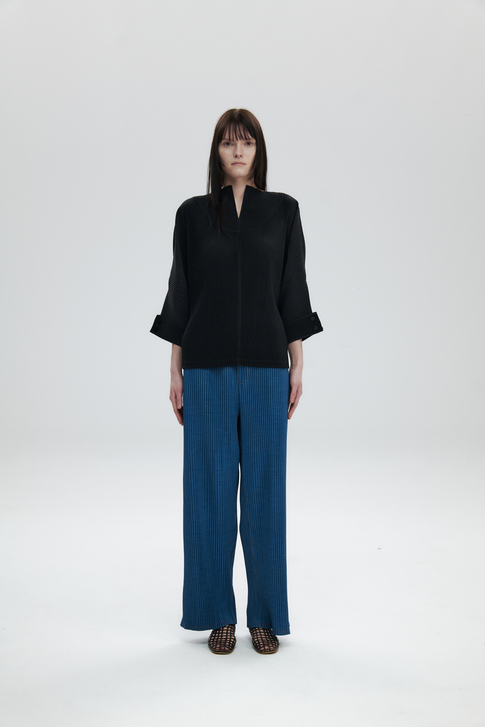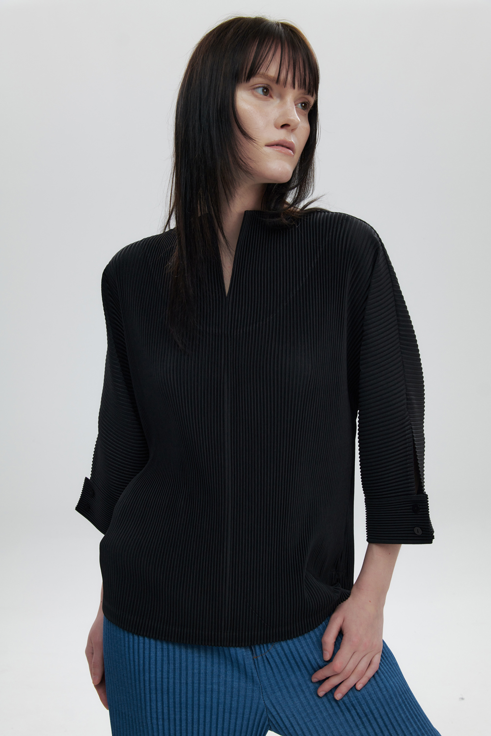 몽플리쎄 여성 오픈 카라 7부 소매 플리츠 블라우스 블랙