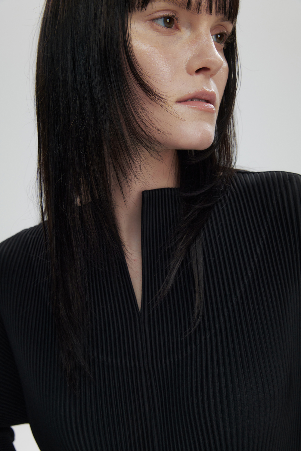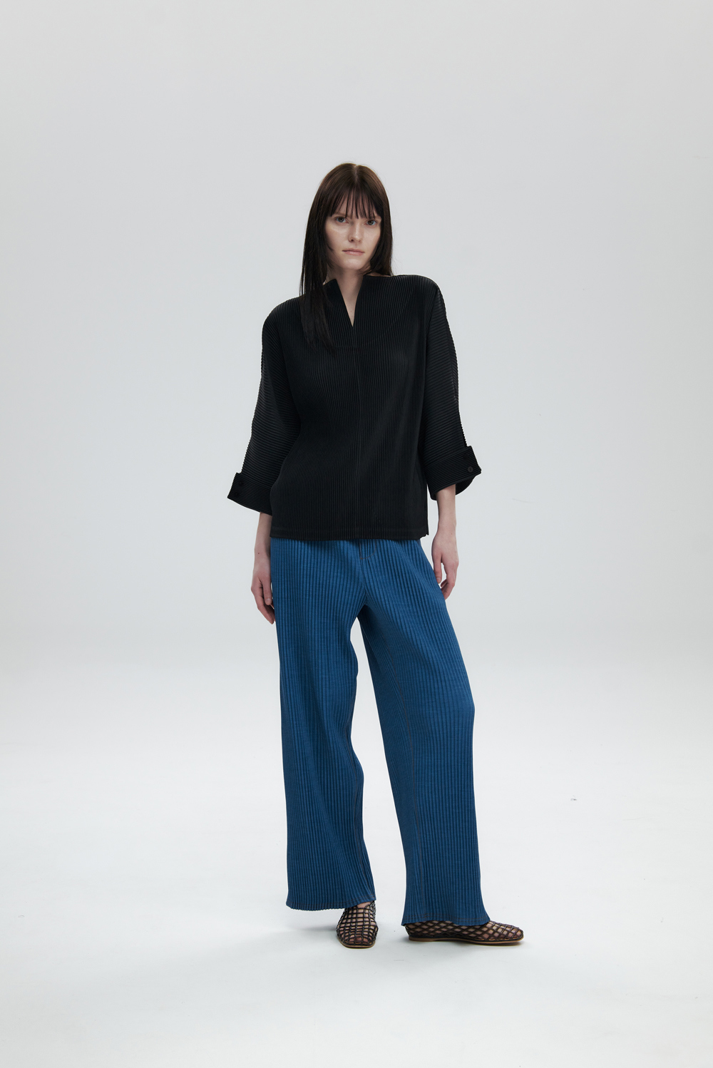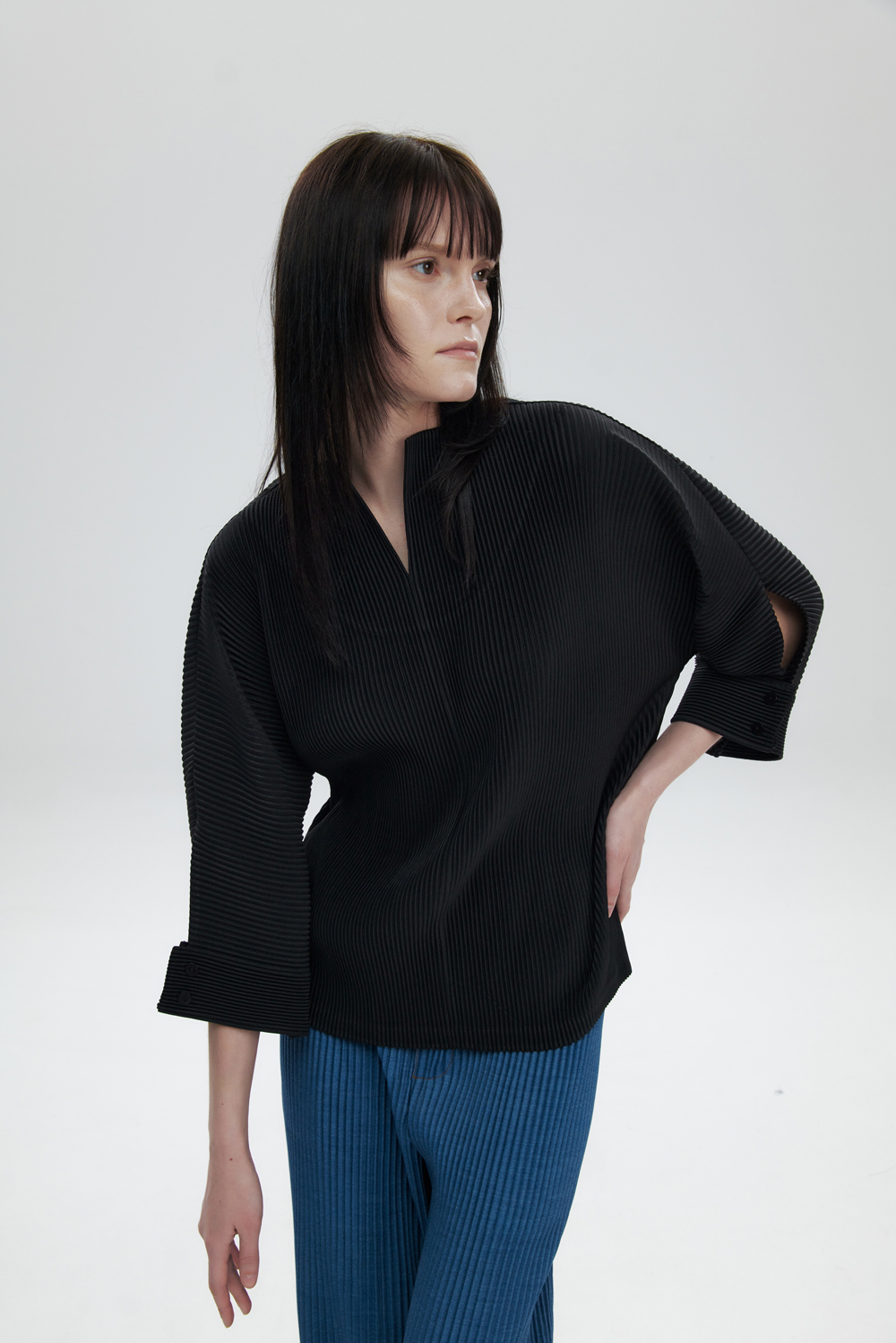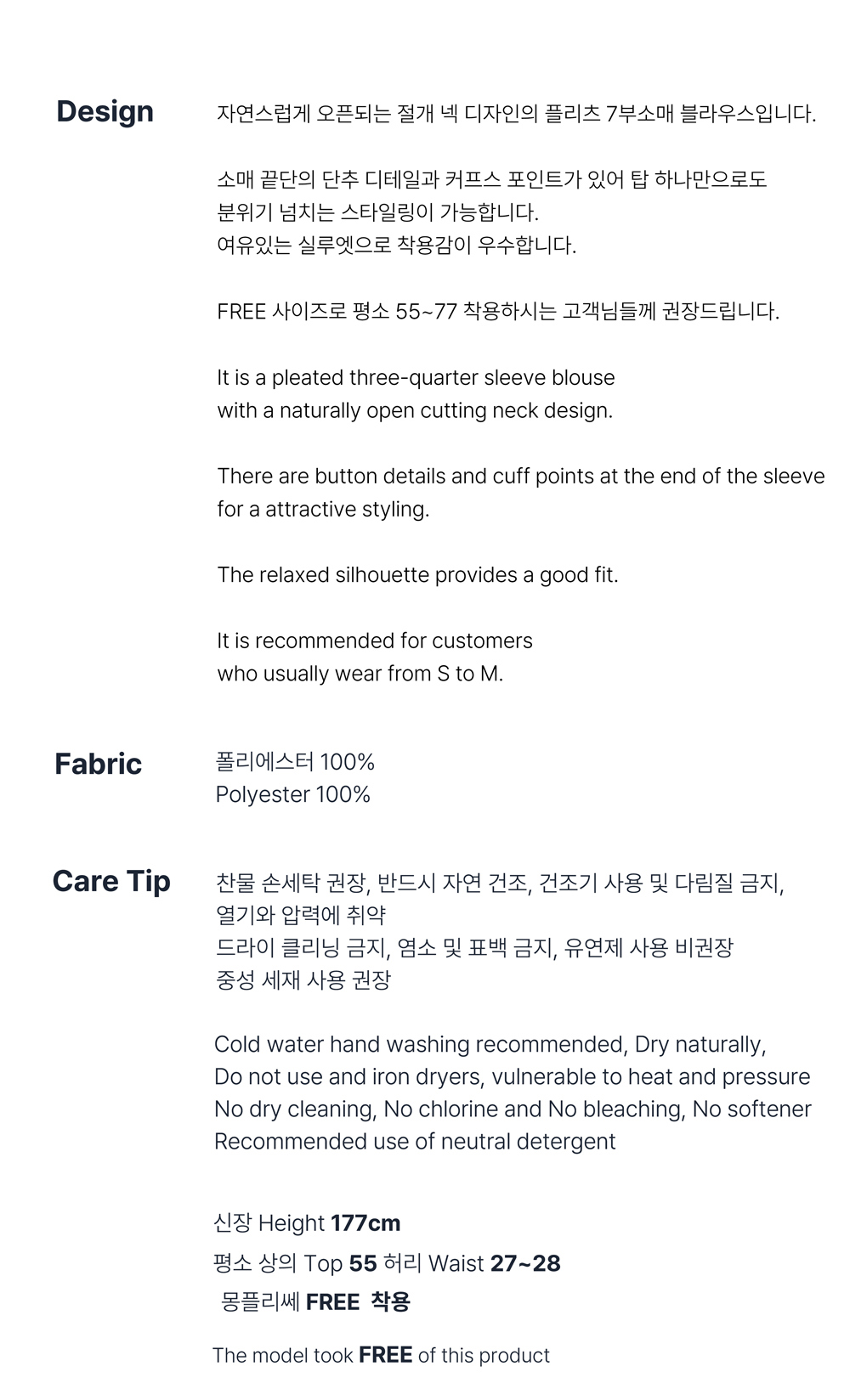몽플리쎄 여성 오픈 카라 7부 소매 플리츠 블라우스 블랙