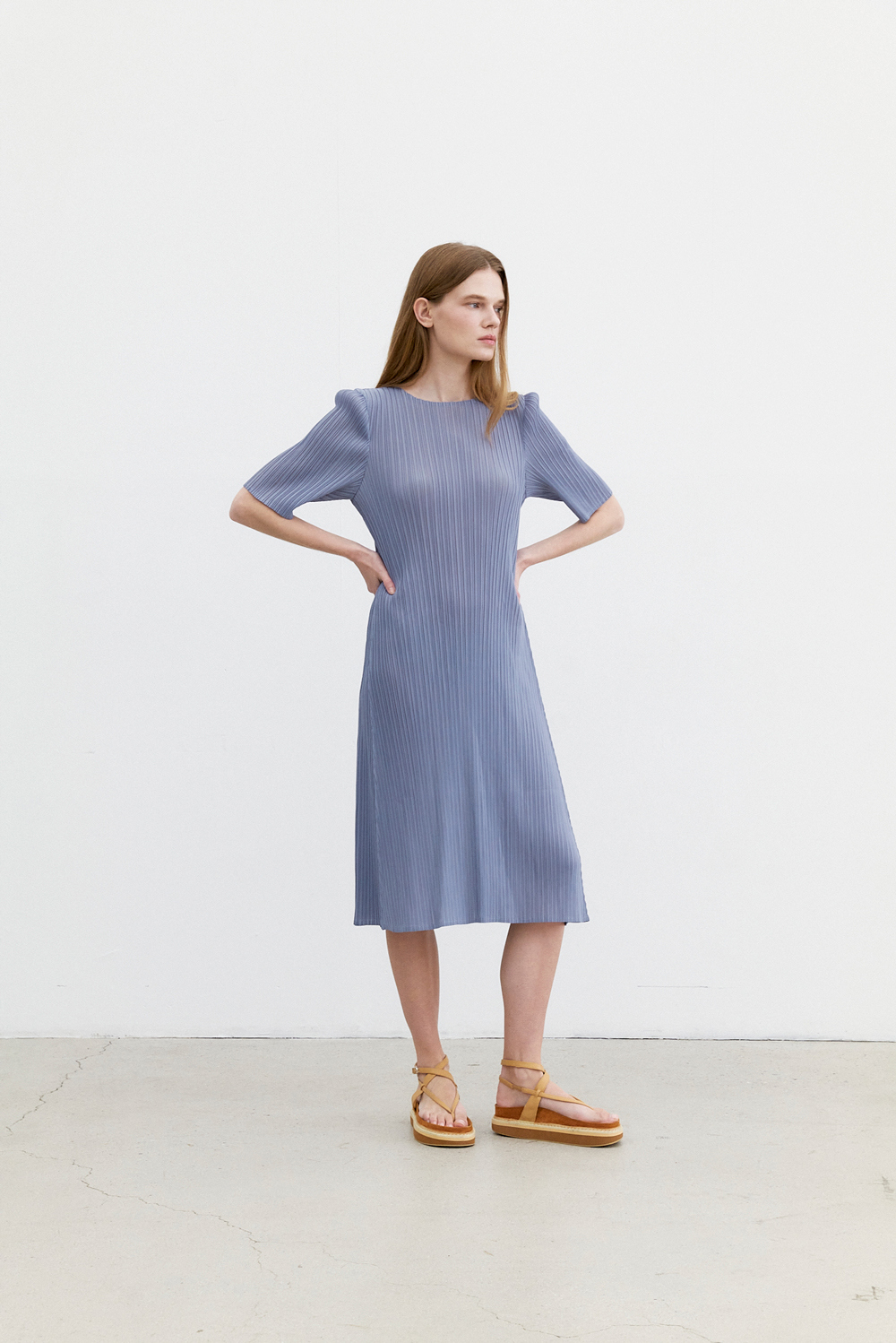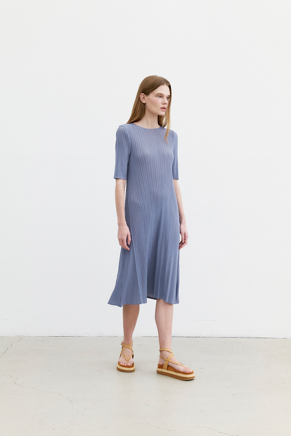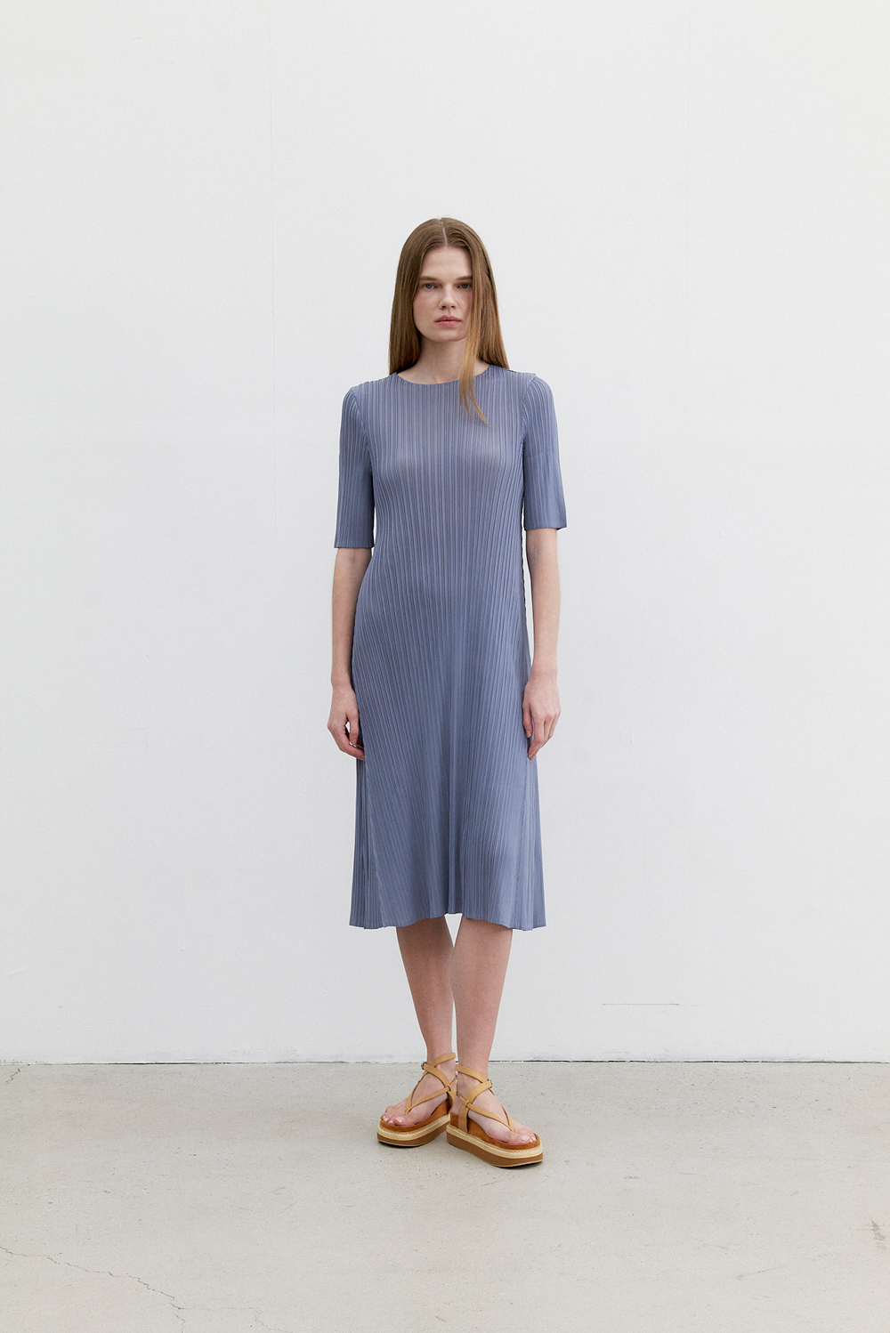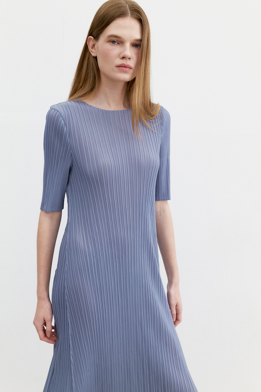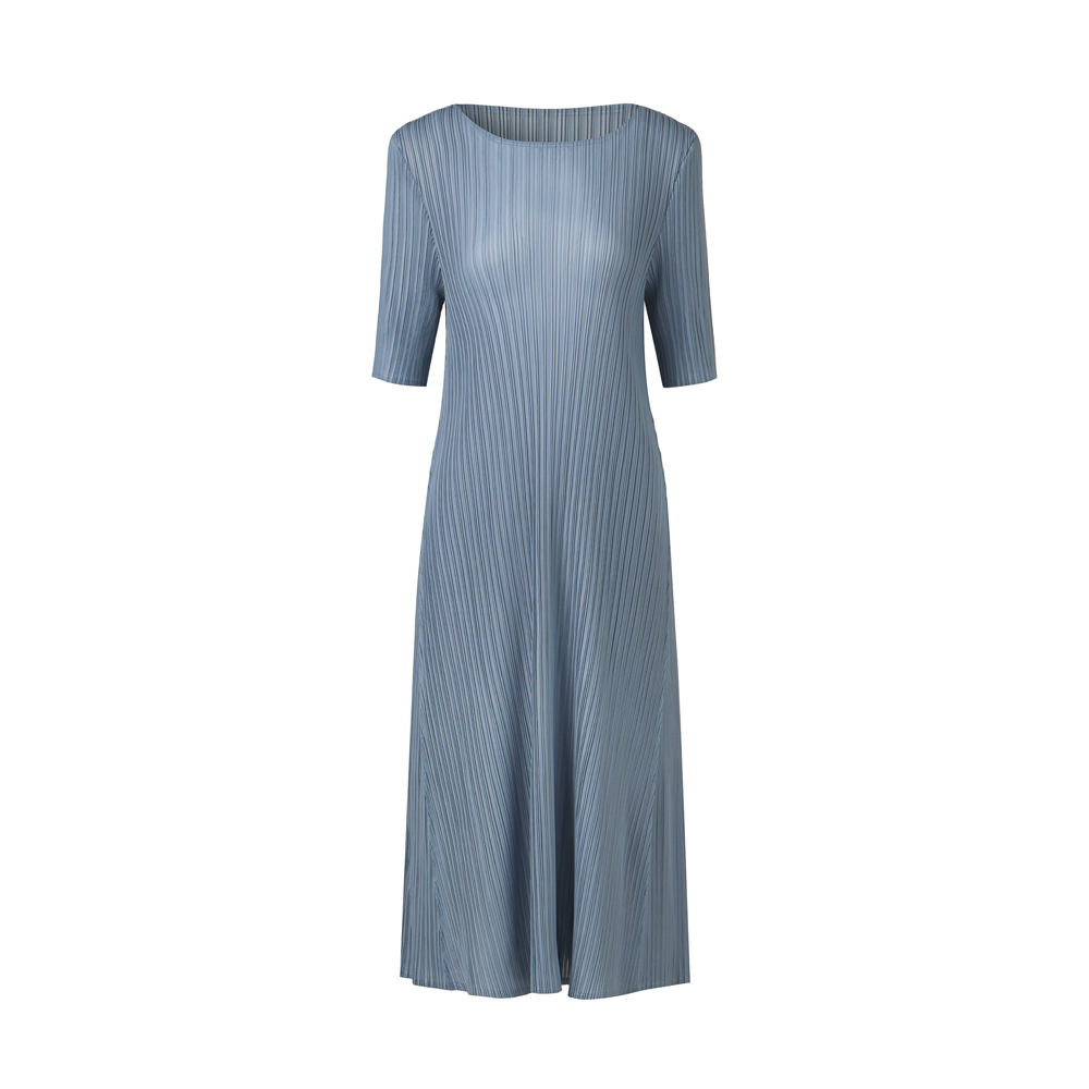 몽플리쎄 여성 반소매 라운드넥 플레어 플리츠 원피스 블루