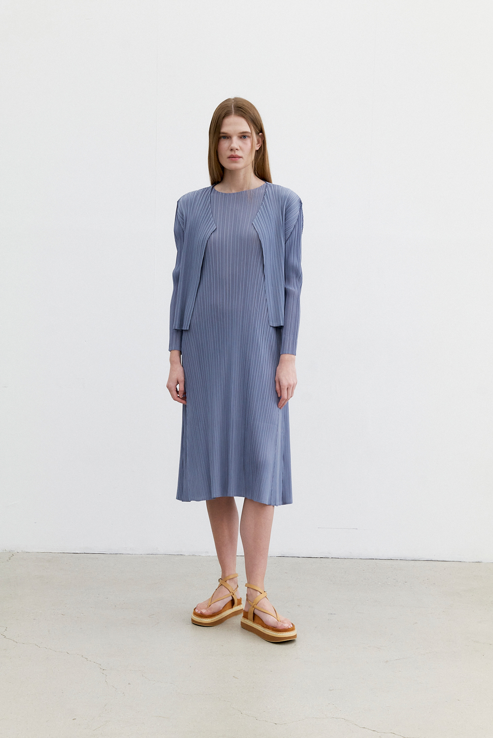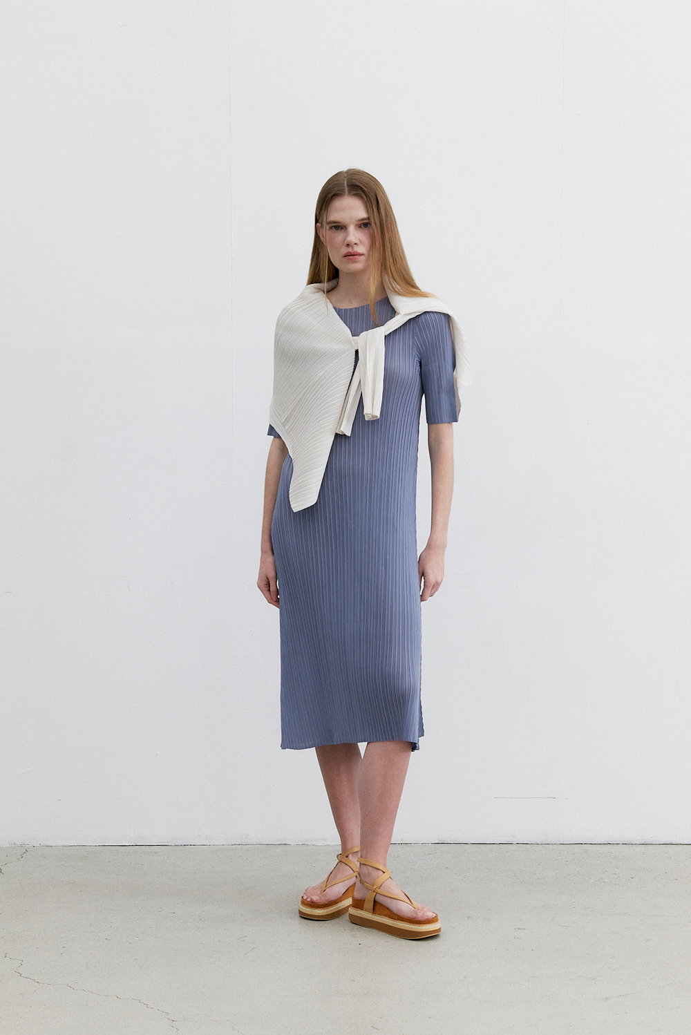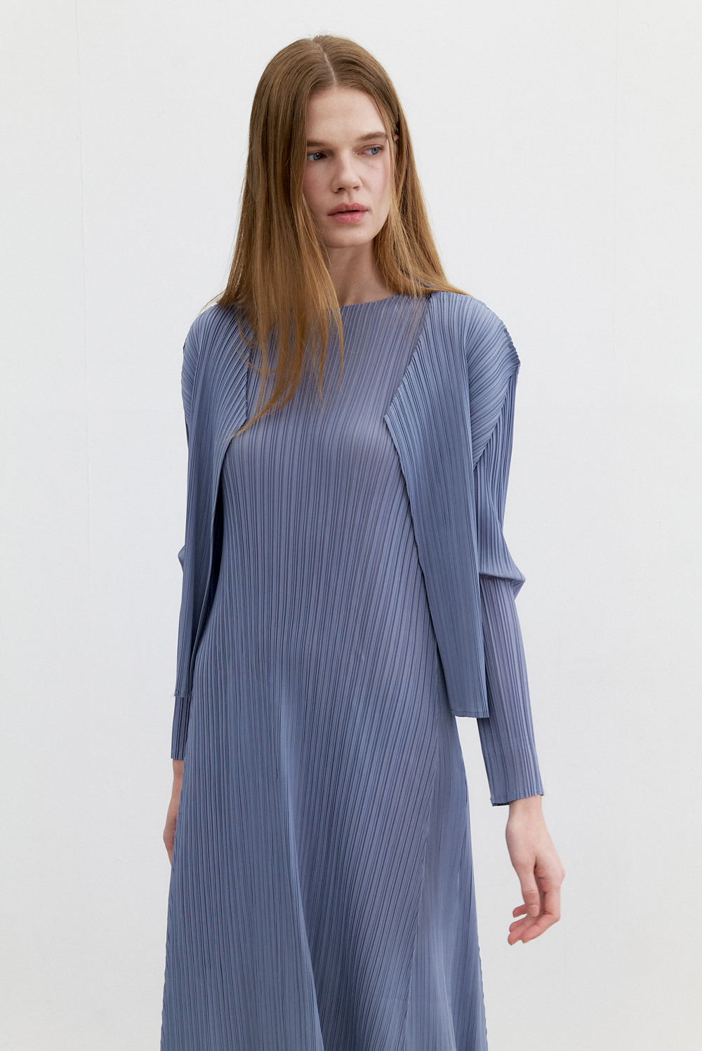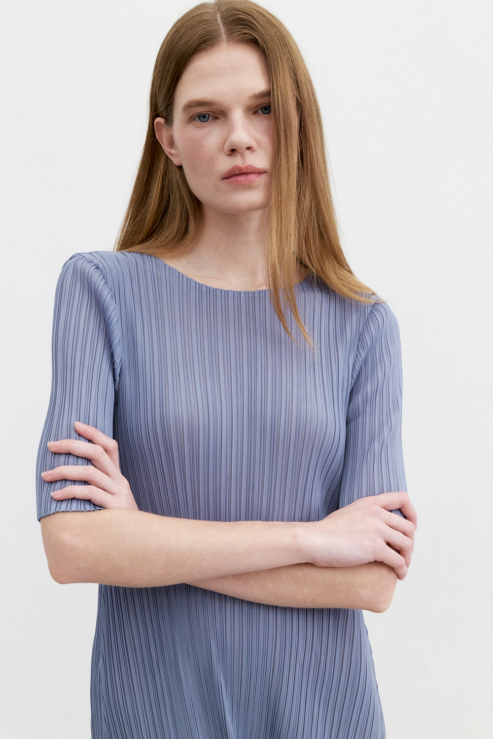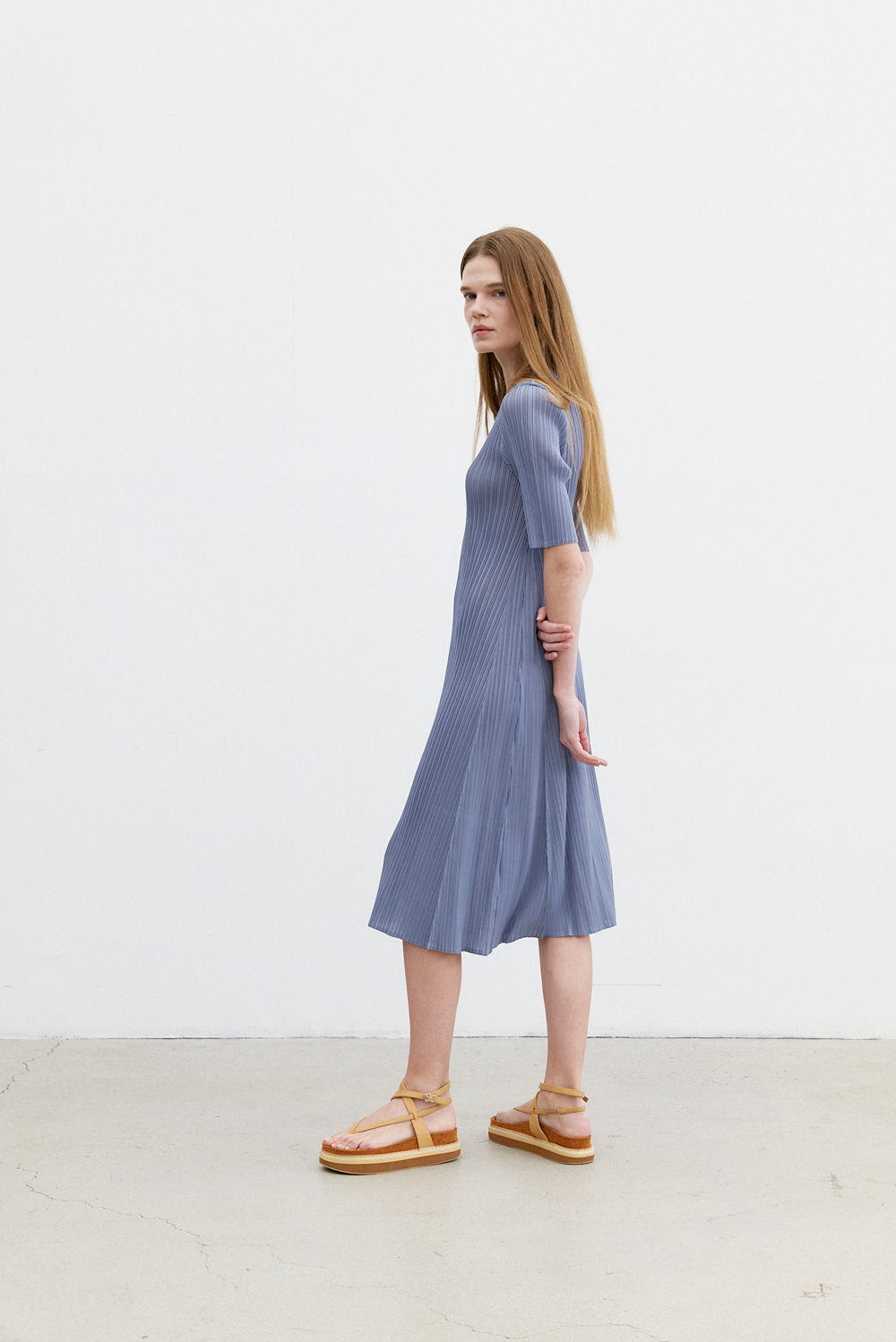 몽플리쎄 여성 반소매 라운드넥 플레어 플리츠 원피스 블루