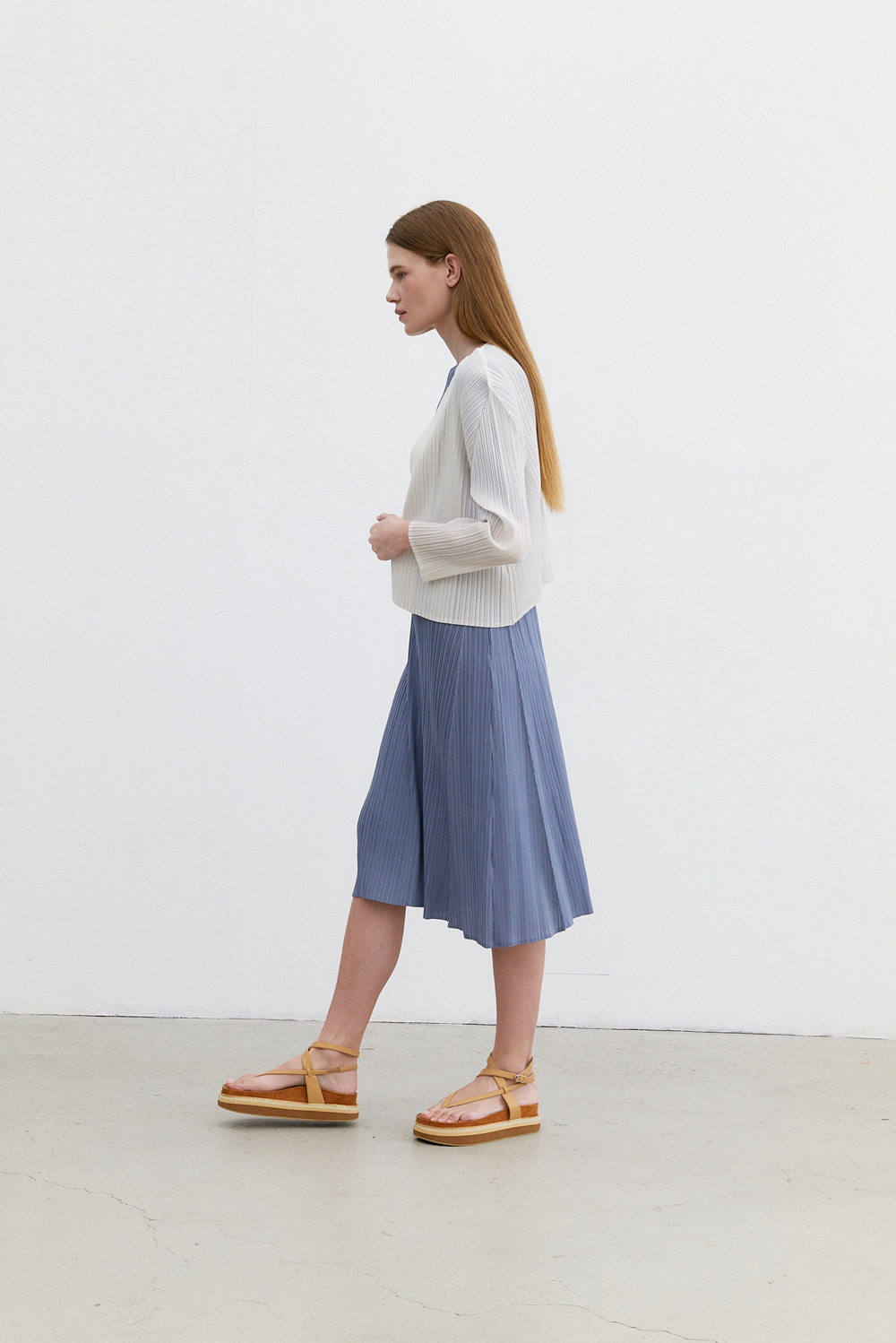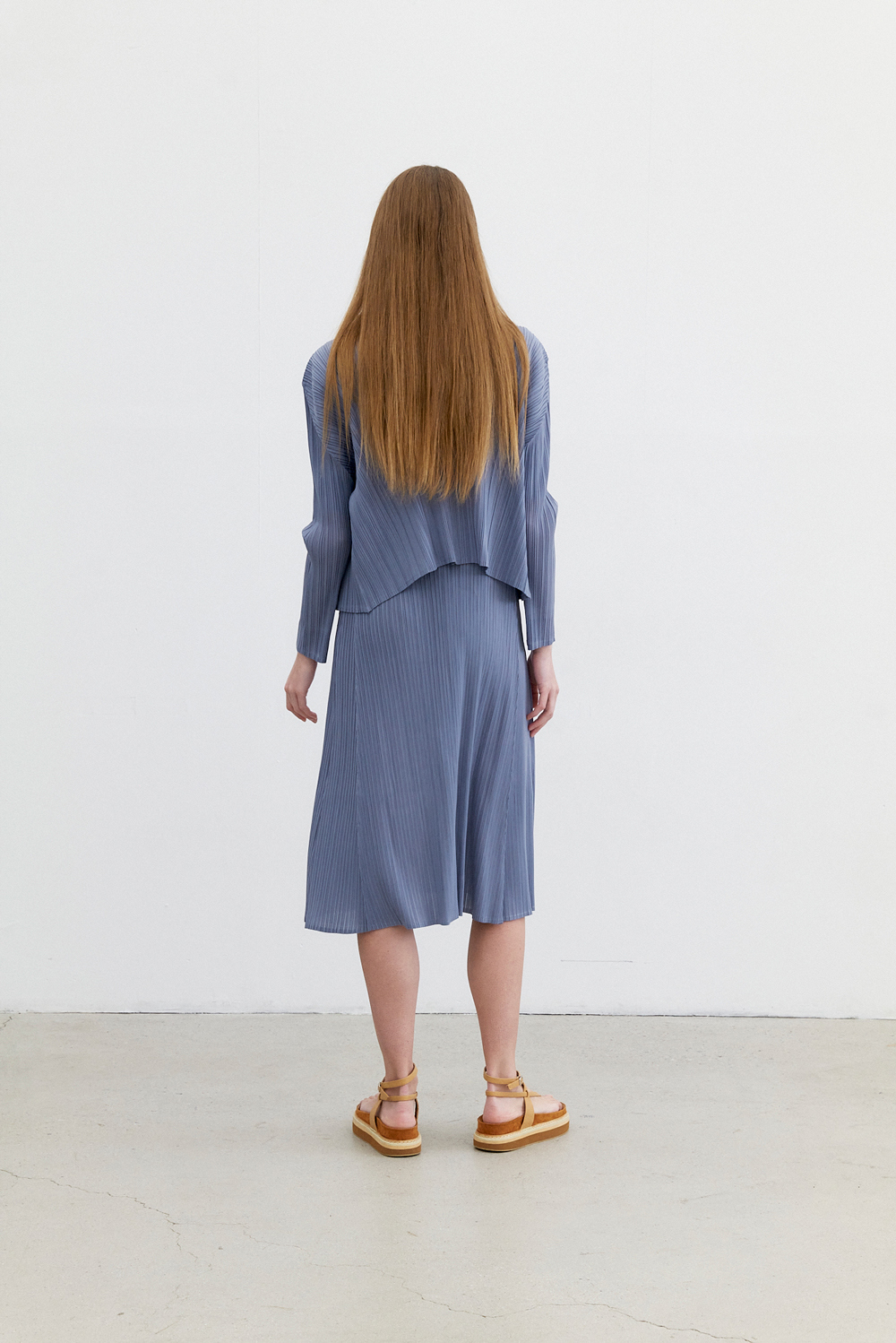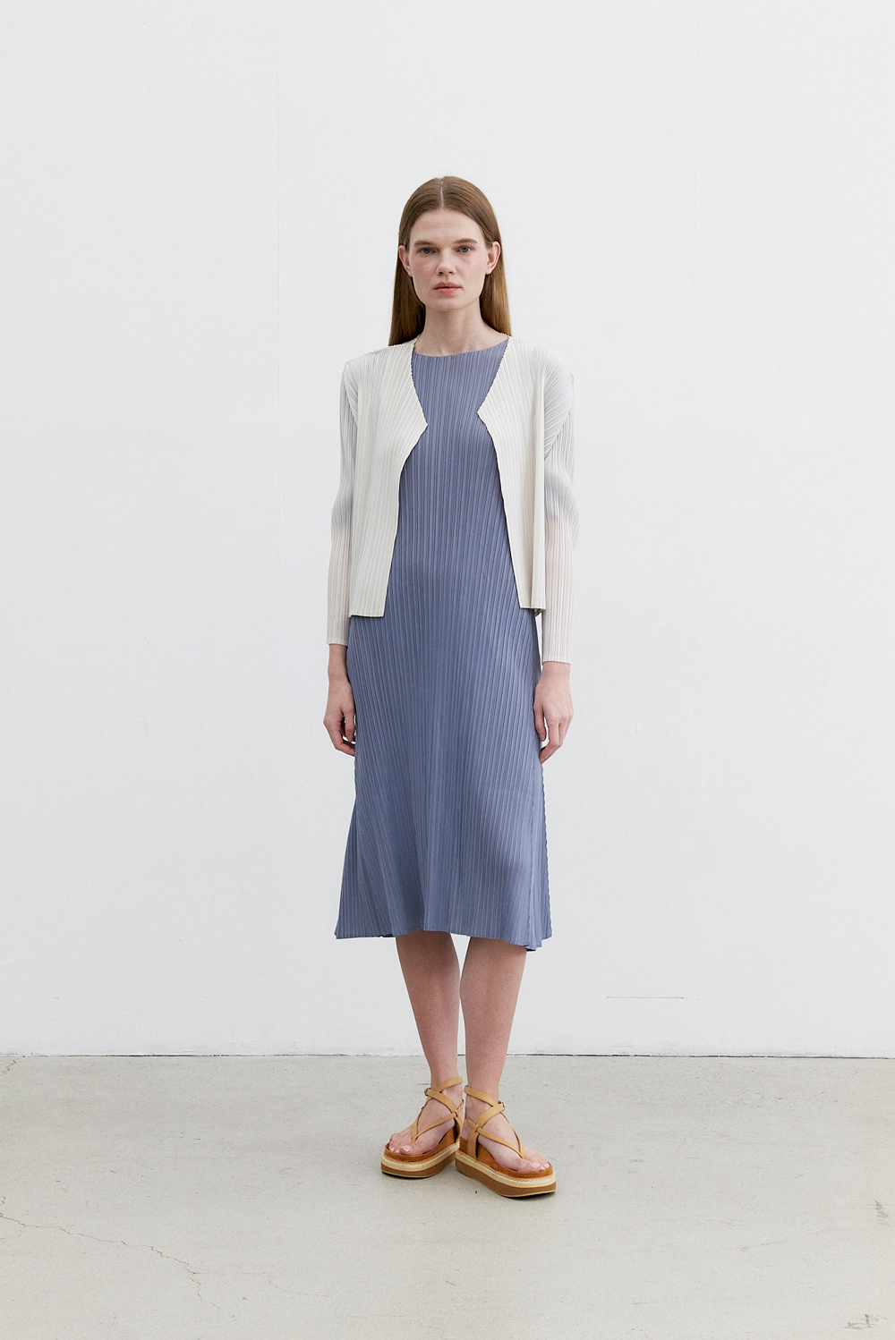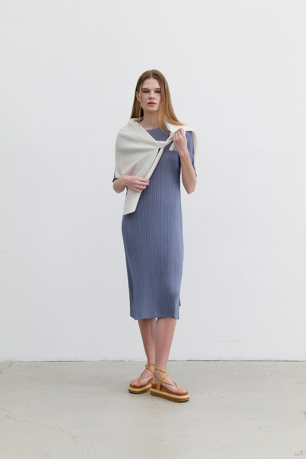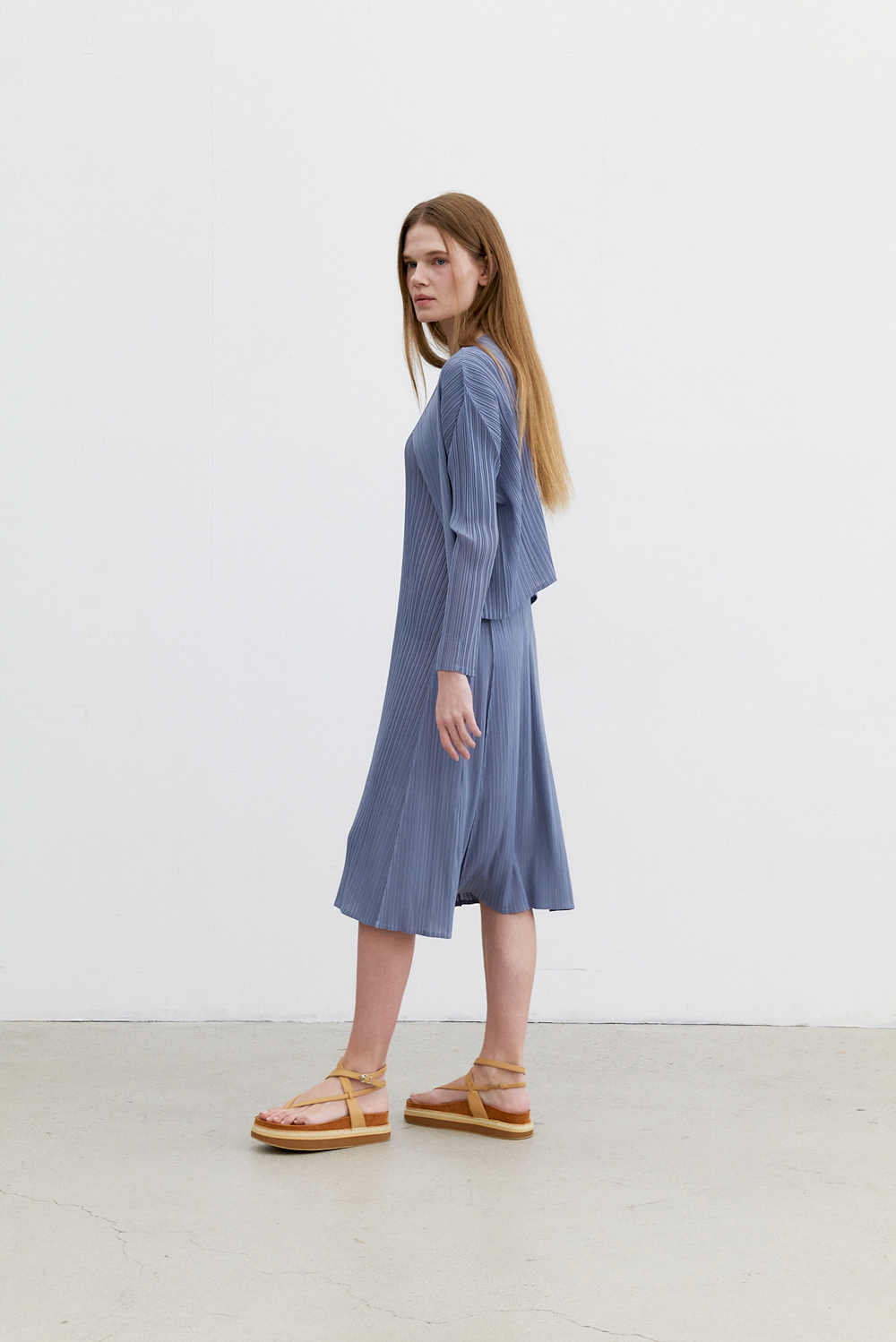 몽플리쎄 여성 반소매 라운드넥 플레어 플리츠 원피스 블루