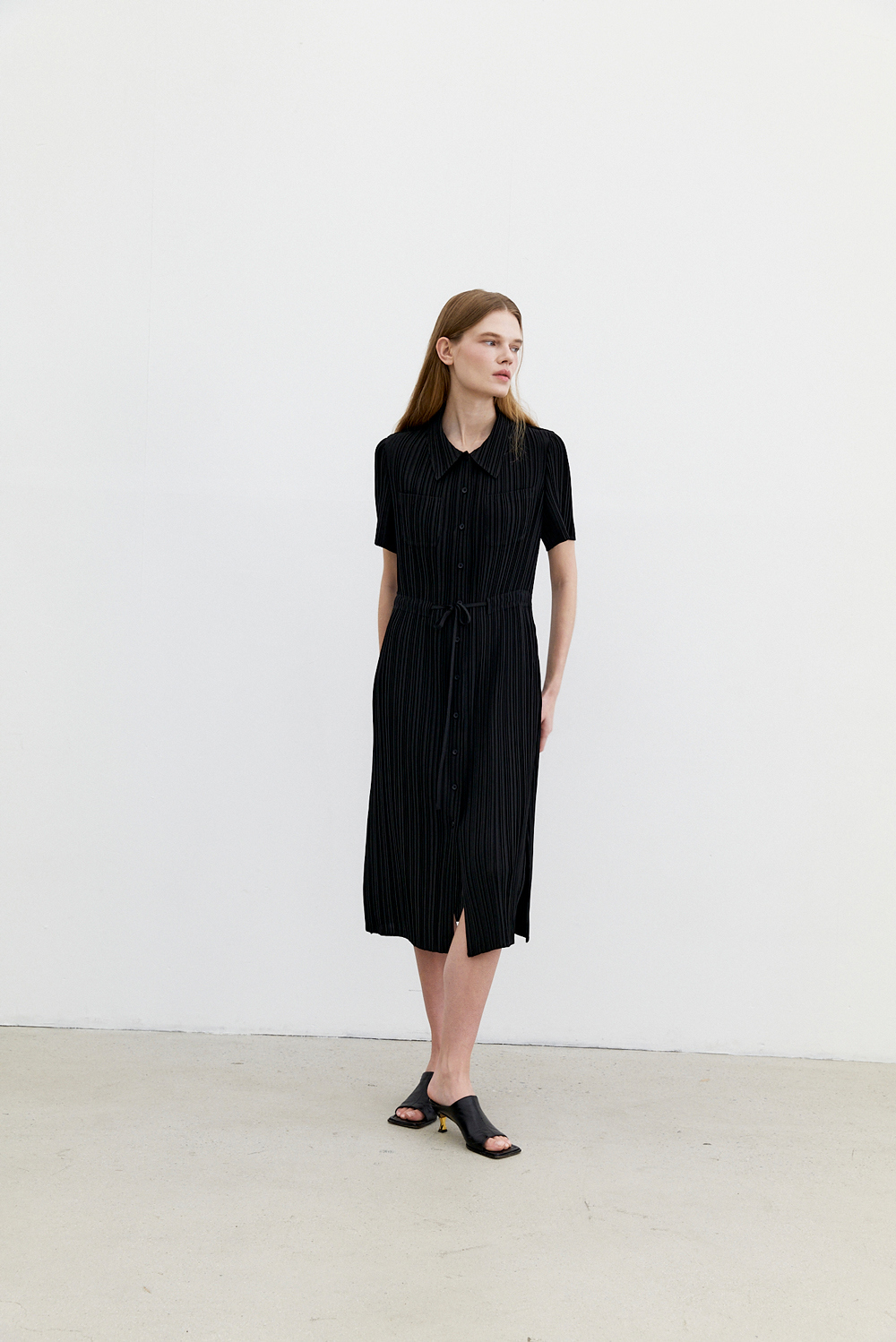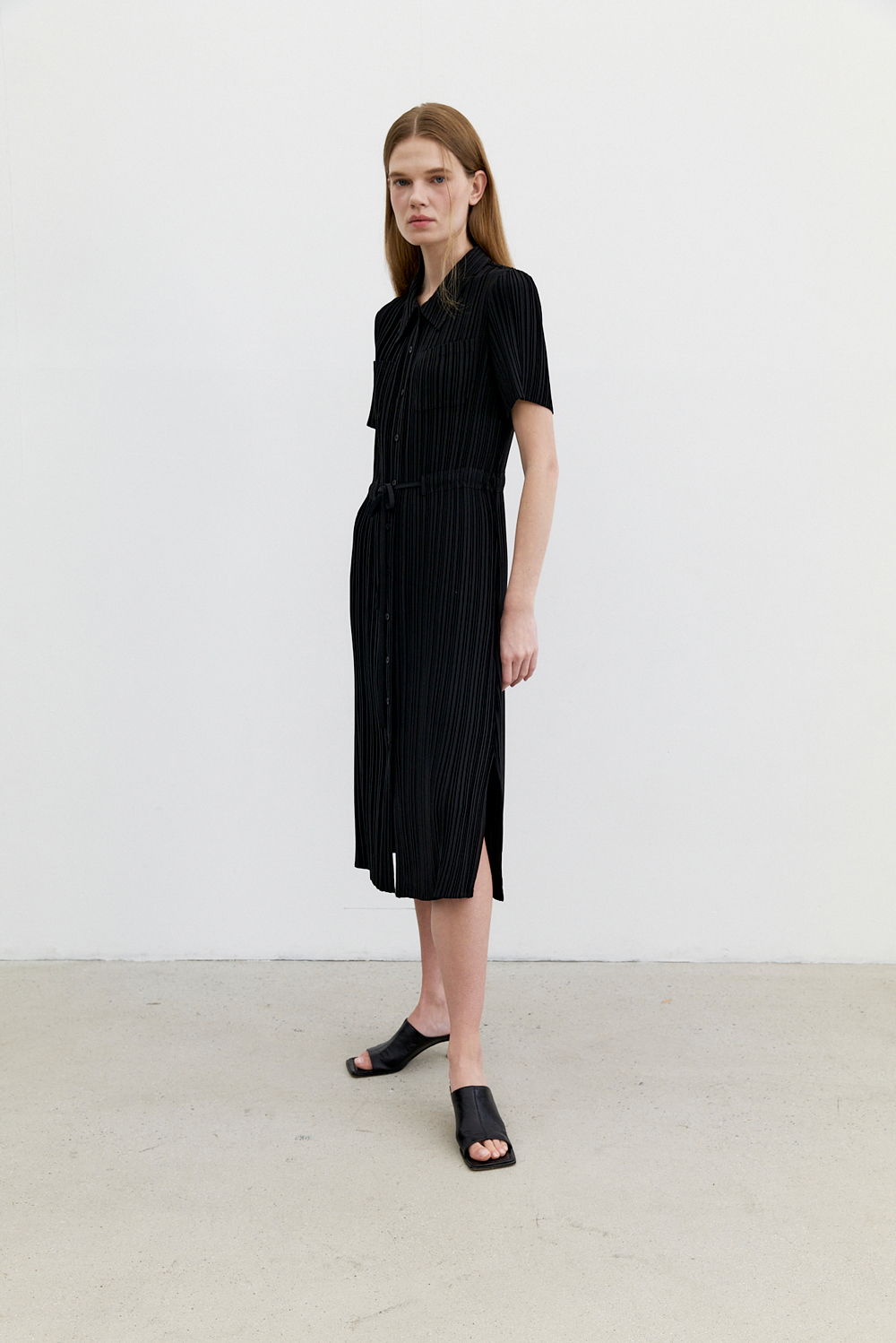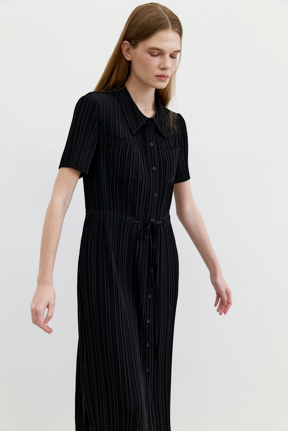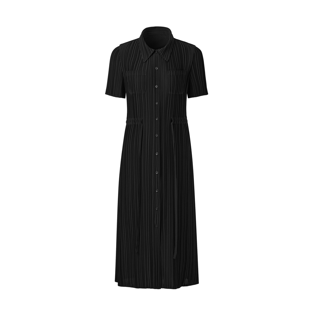 몽플리쎄 여성 카라넥 반소매 풀오픈타입 플리츠 롱 원피스 블랙