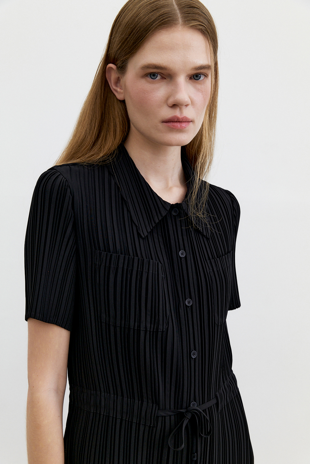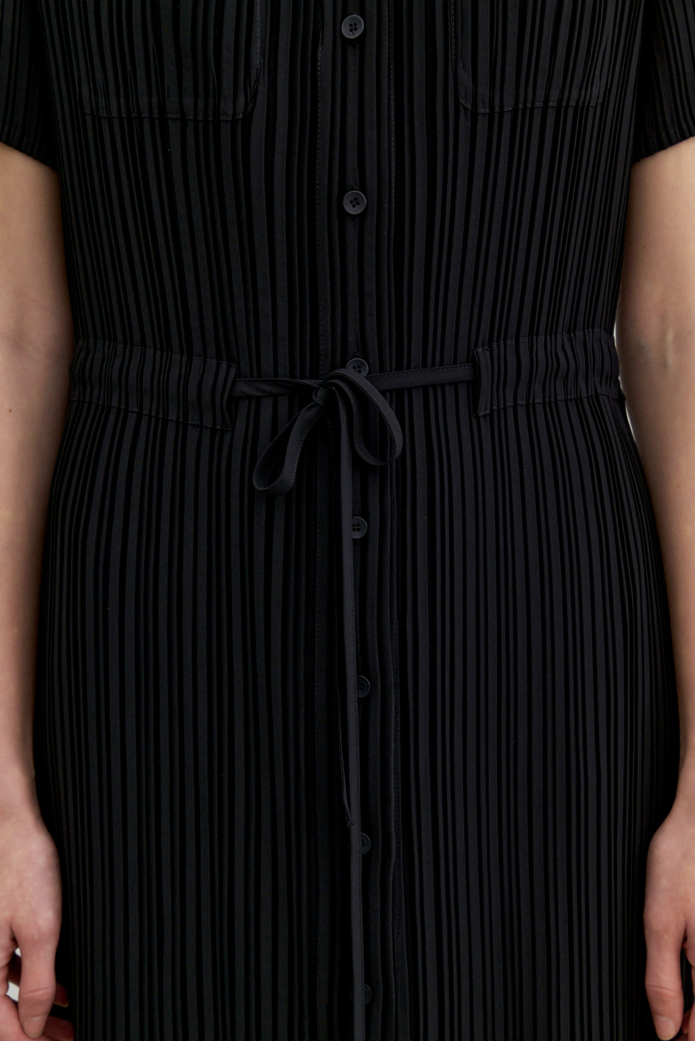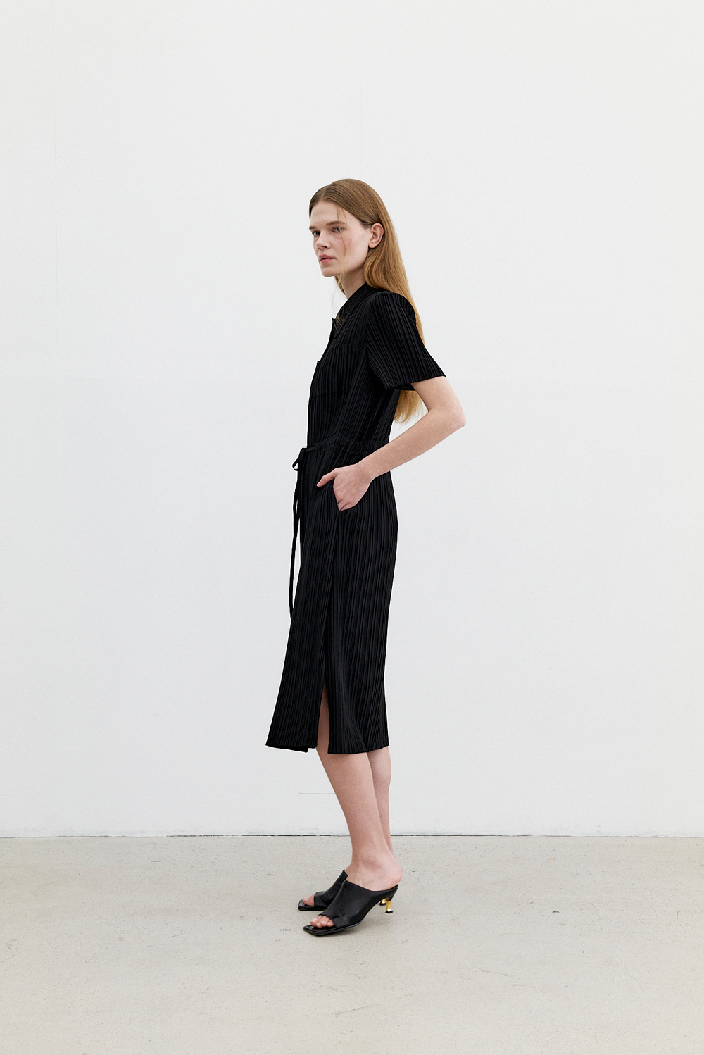 몽플리쎄 여성 카라넥 반소매 풀오픈타입 플리츠 롱 원피스 블랙