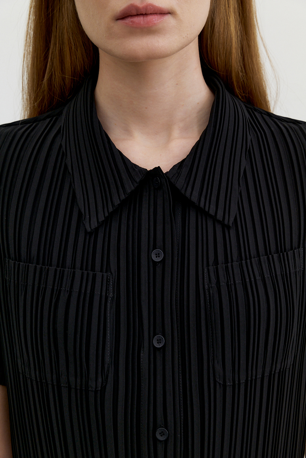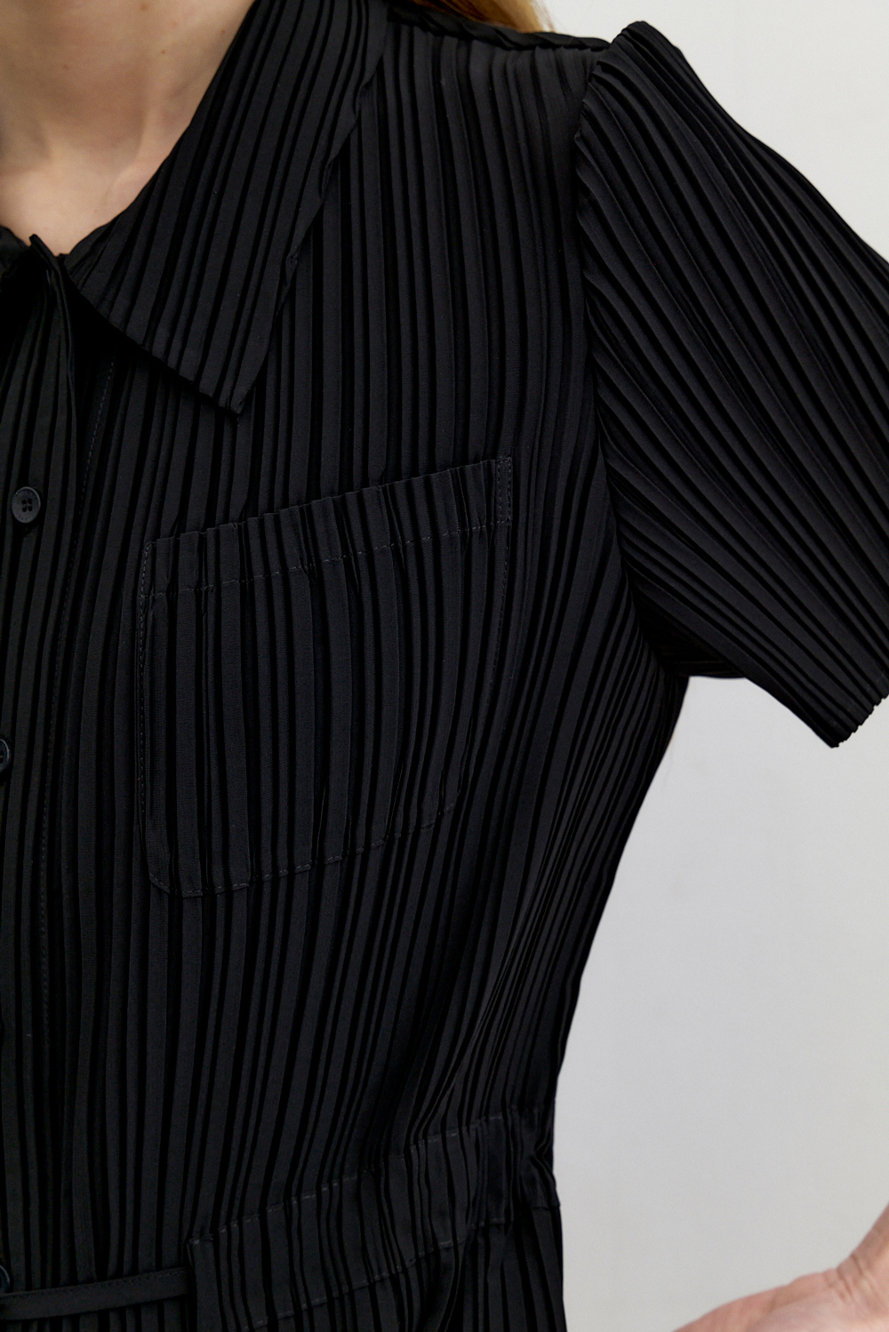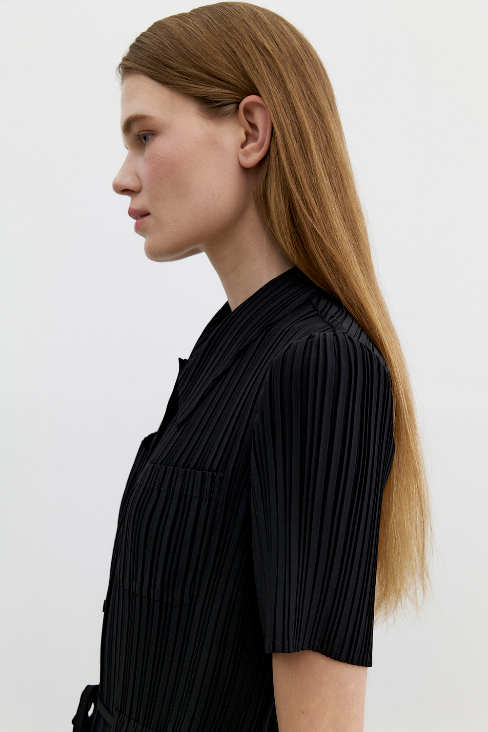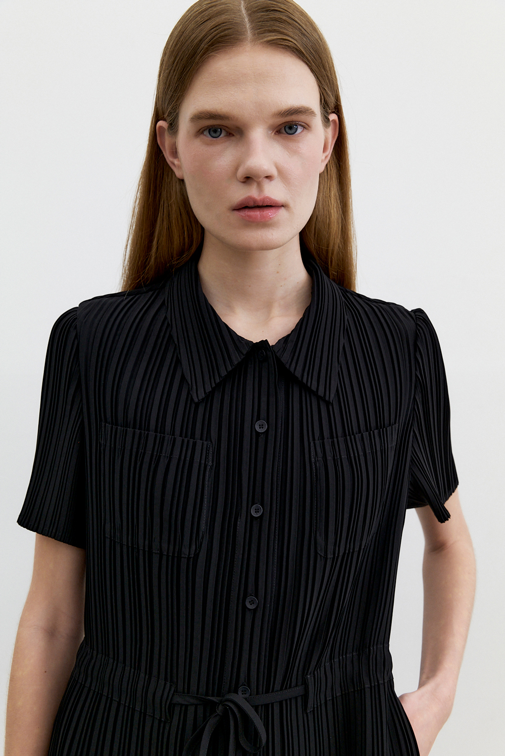 몽플리쎄 여성 카라넥 반소매 풀오픈타입 플리츠 롱 원피스 블랙