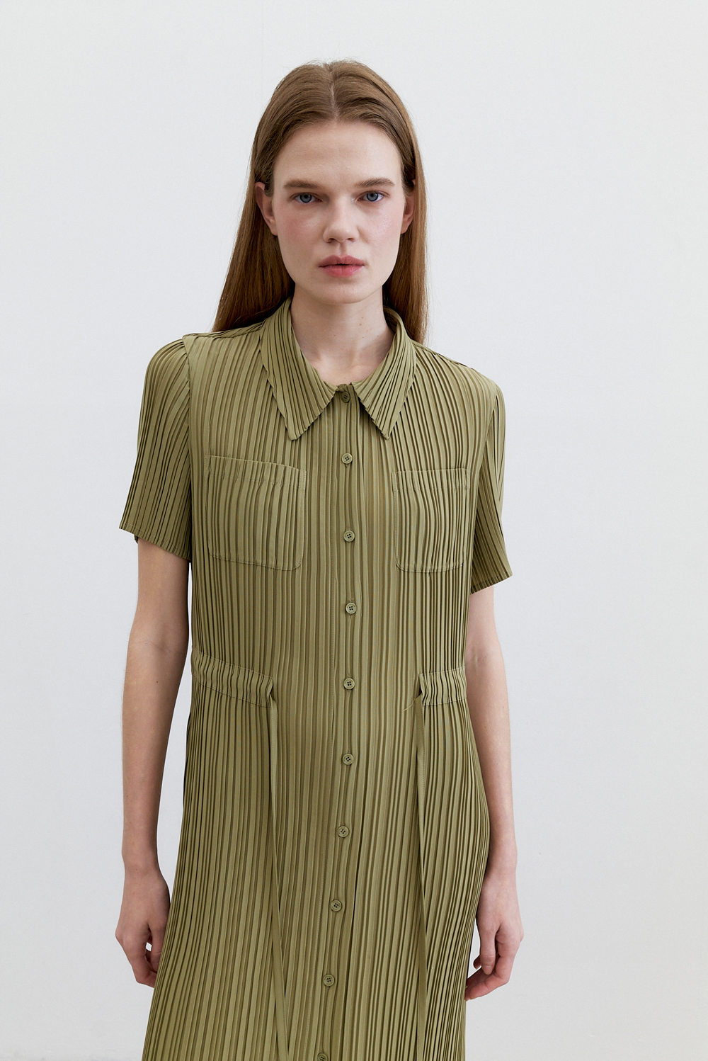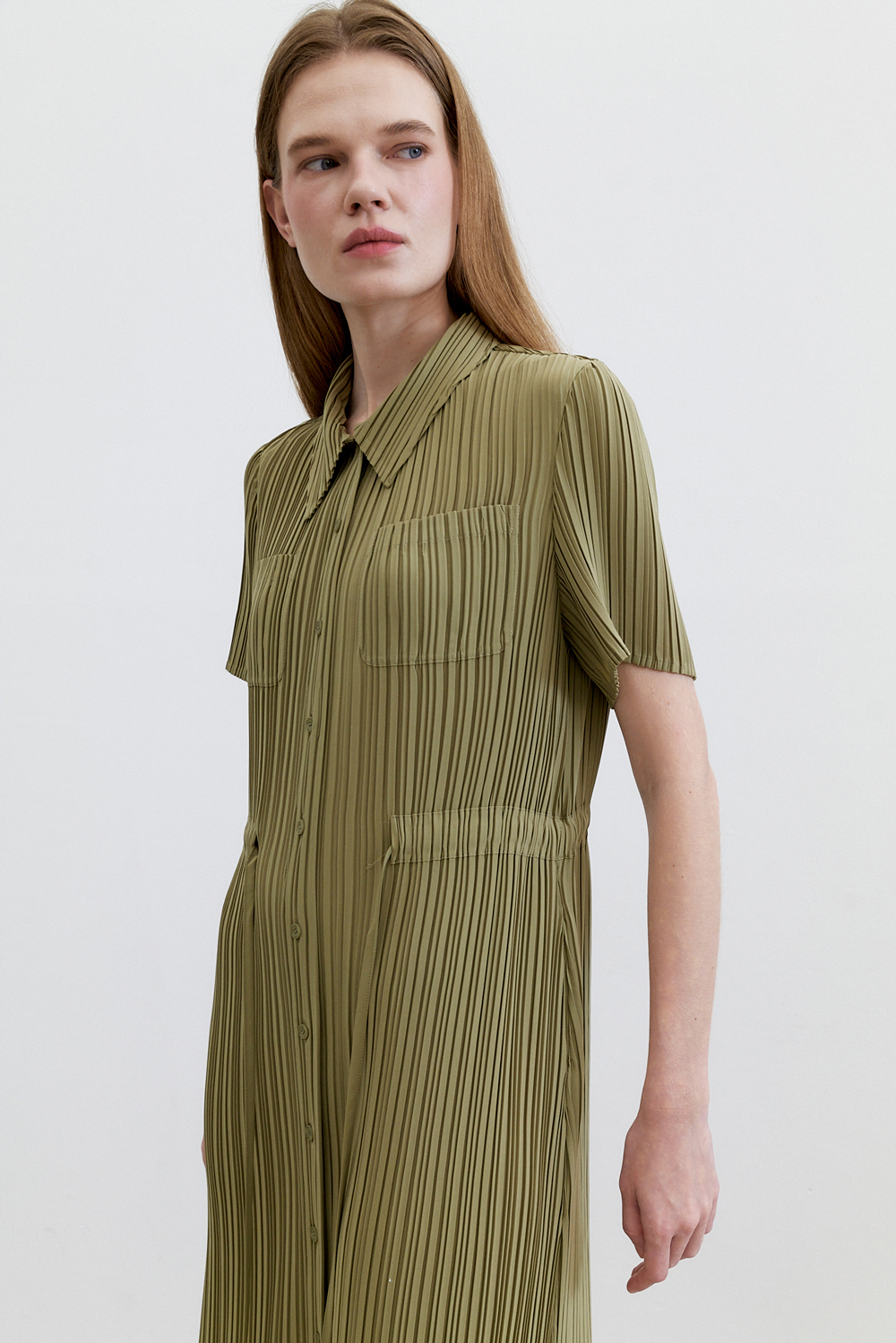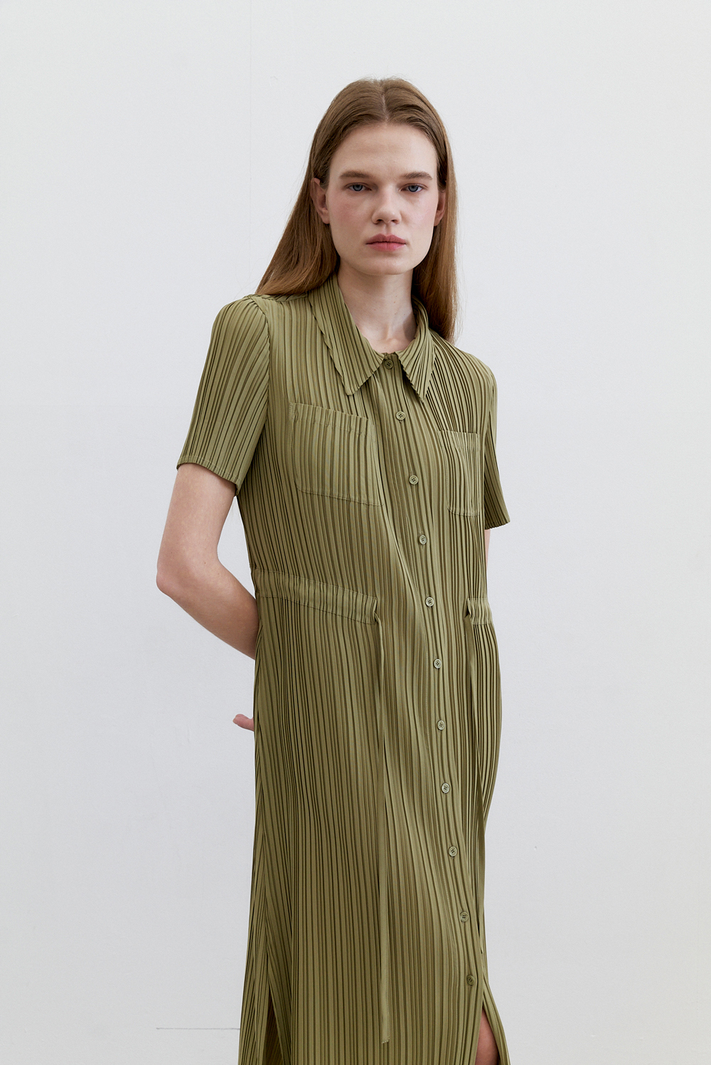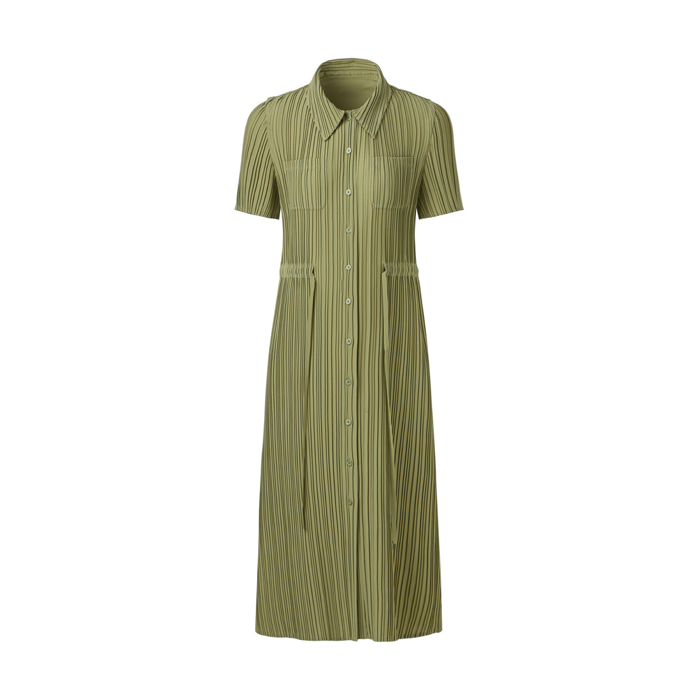 몽플리쎄 여성 카라넥 반소매 풀오픈타입 플리츠 롱 원피스 카키