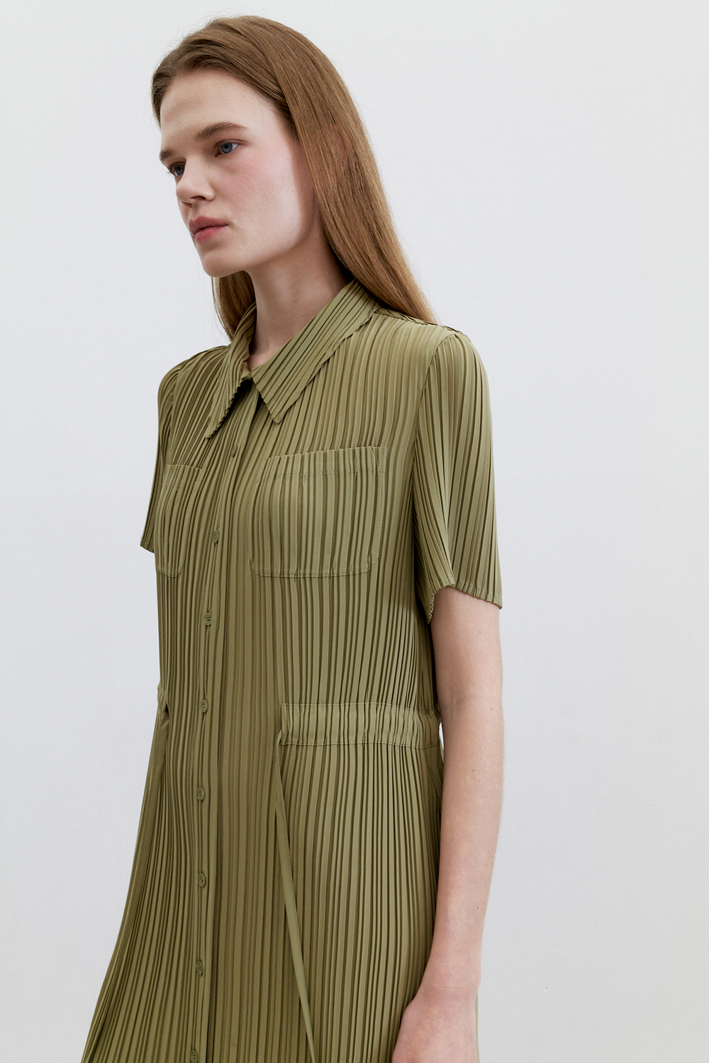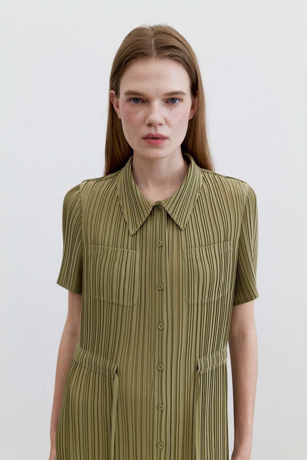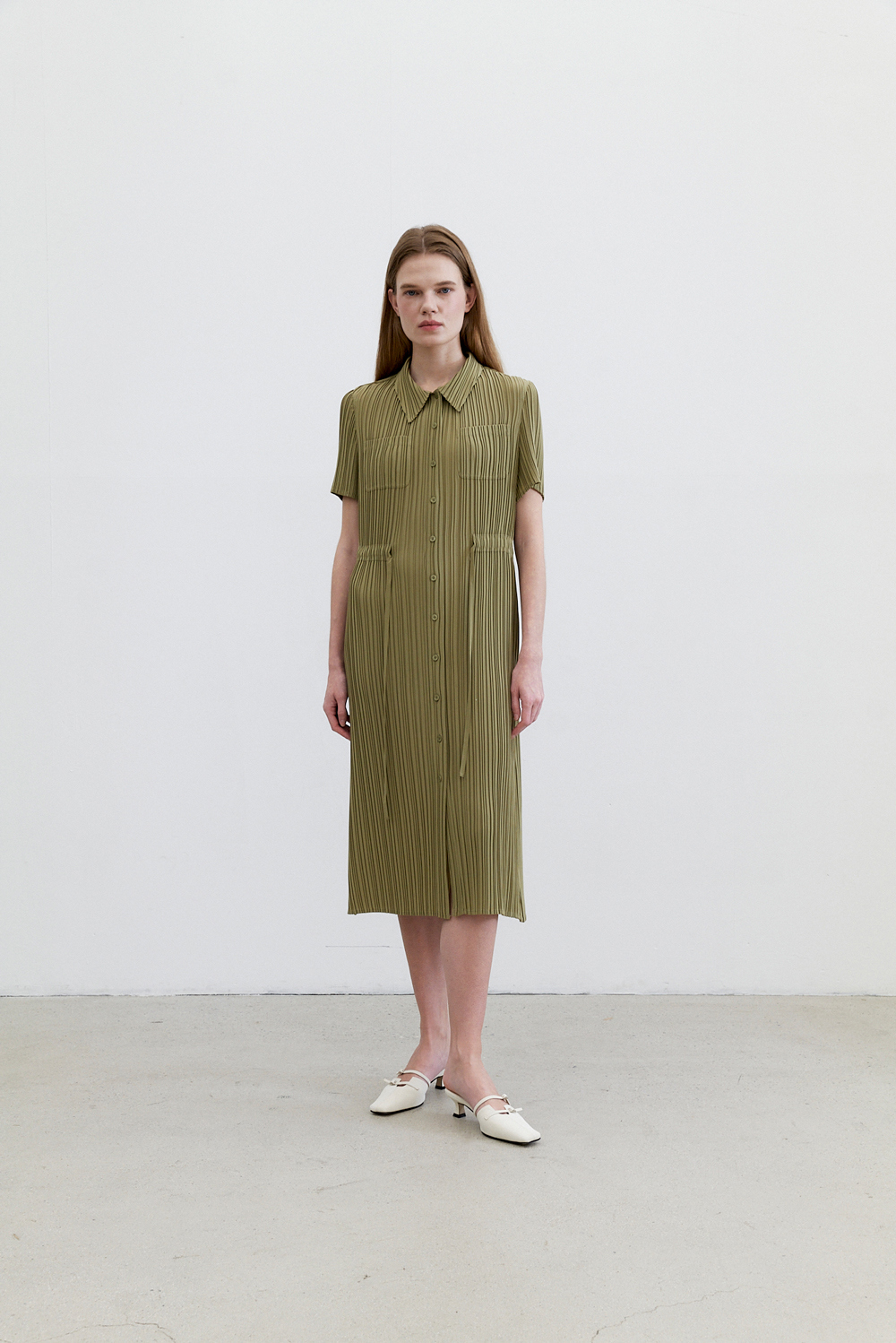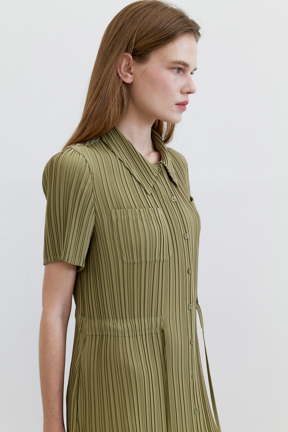 몽플리쎄 여성 카라넥 반소매 풀오픈타입 플리츠 롱 원피스 카키