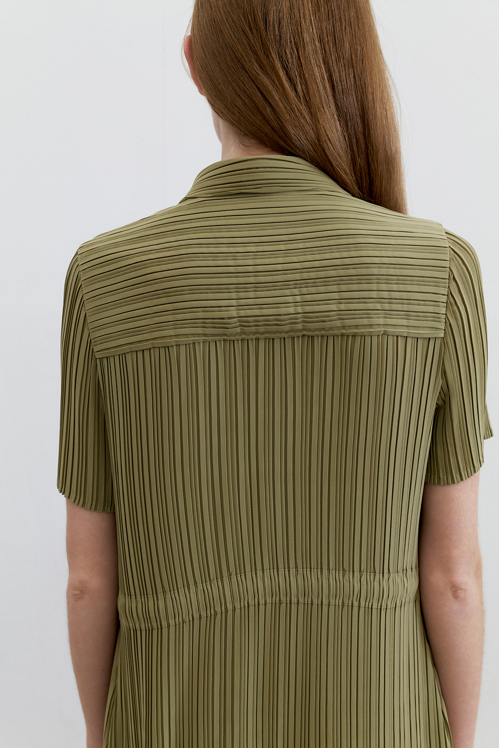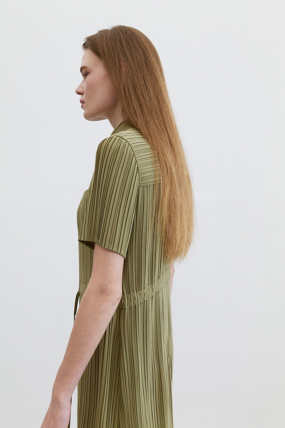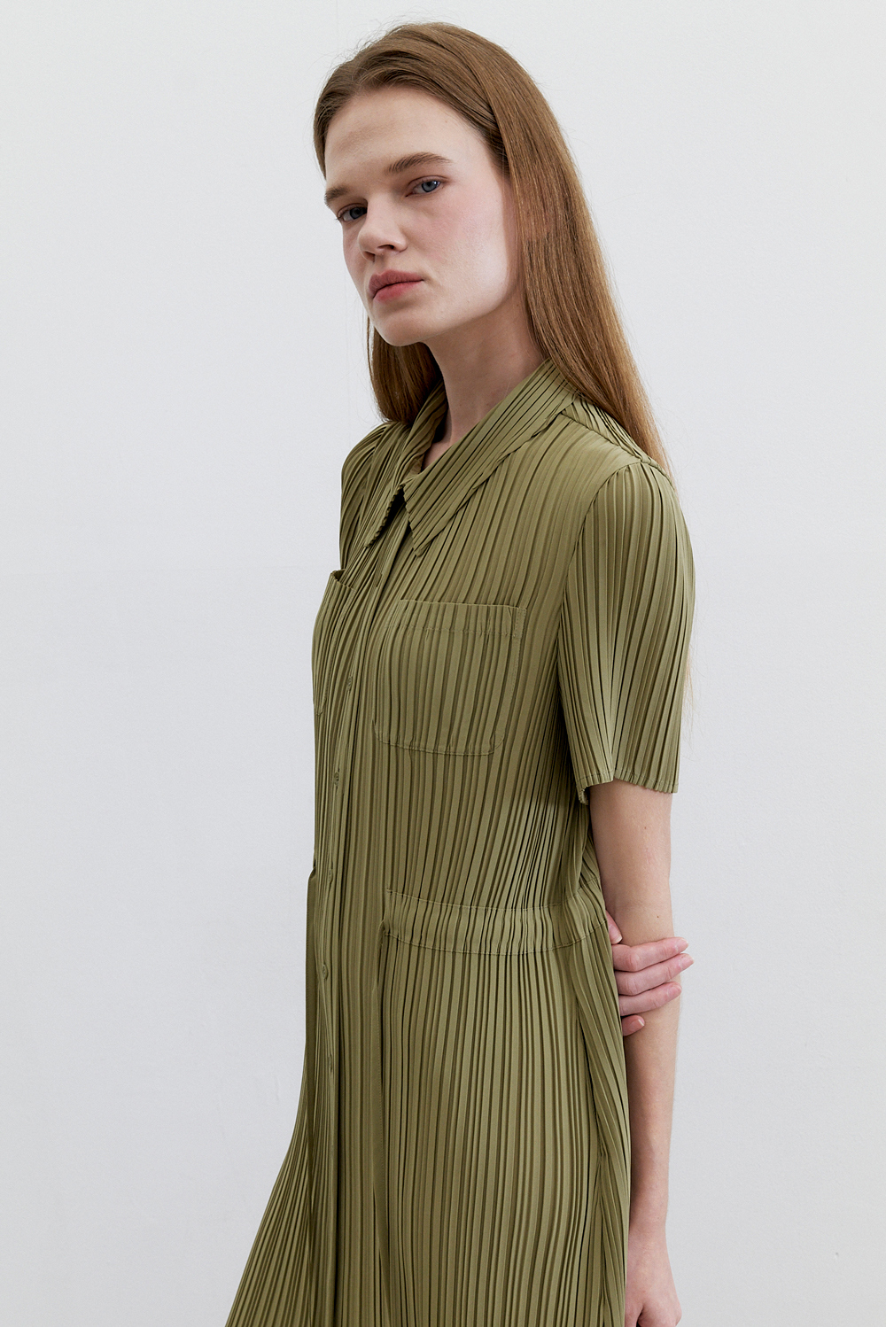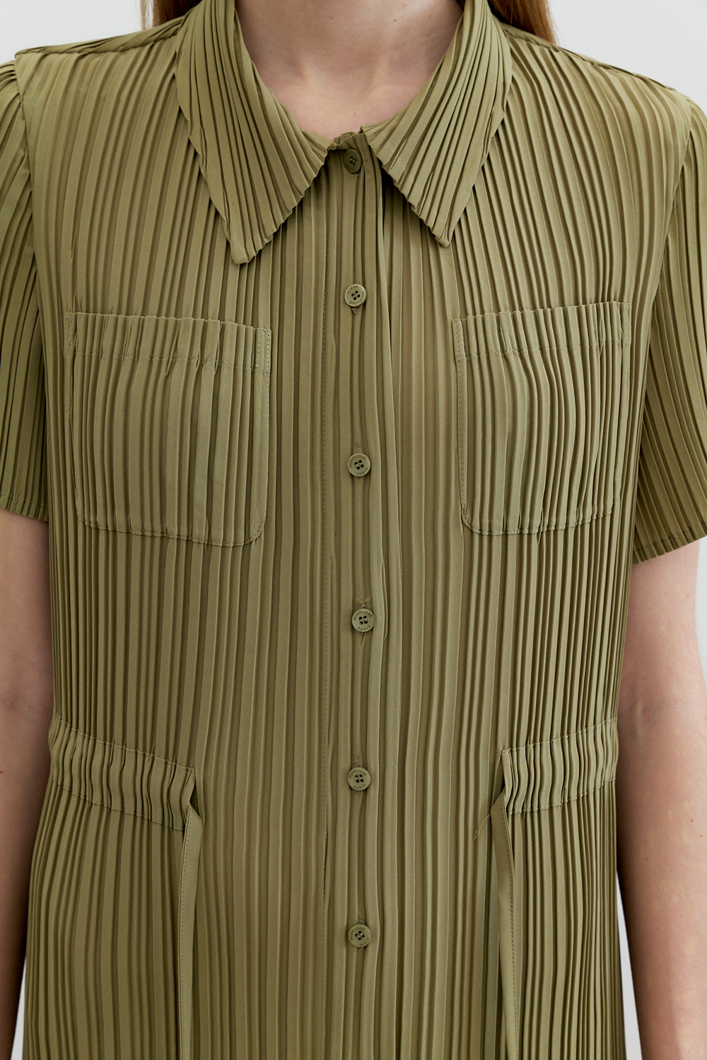 몽플리쎄 여성 카라넥 반소매 풀오픈타입 플리츠 롱 원피스 카키