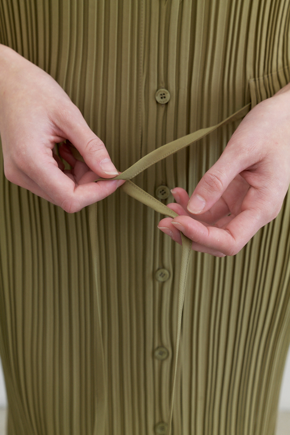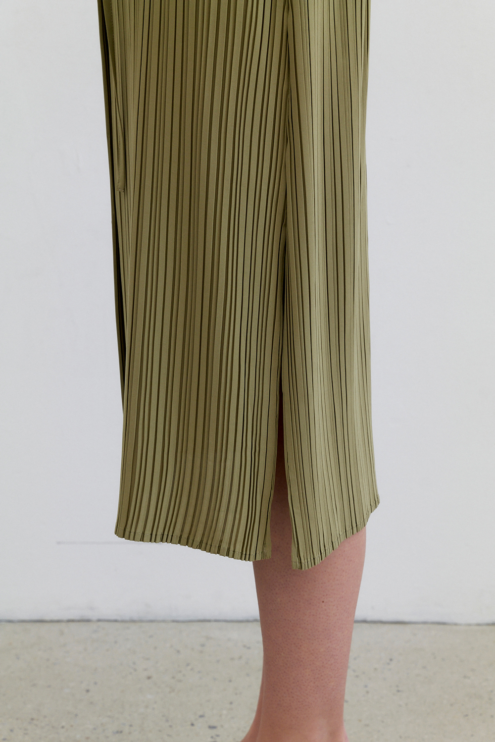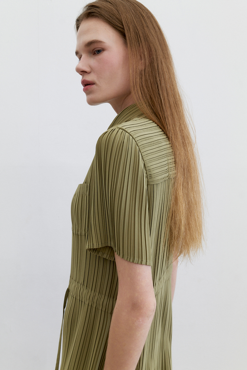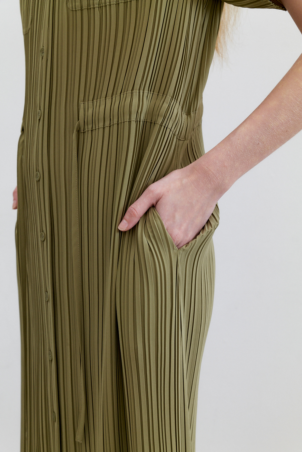 몽플리쎄 여성 카라넥 반소매 풀오픈타입 플리츠 롱 원피스 카키