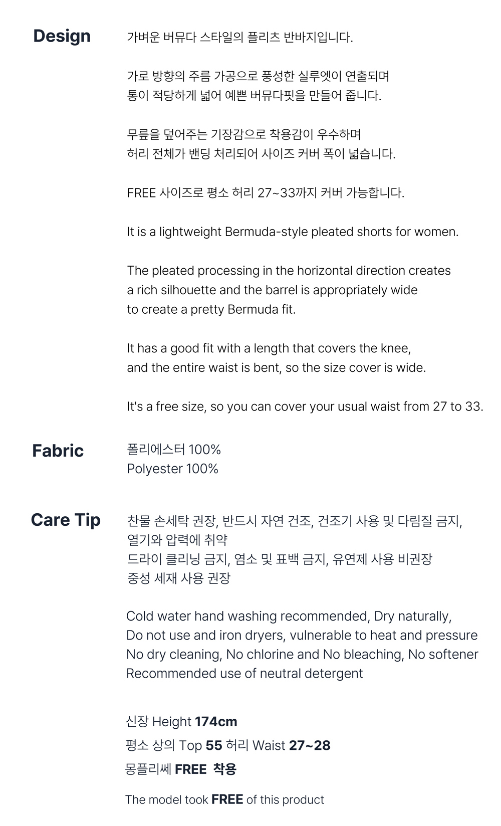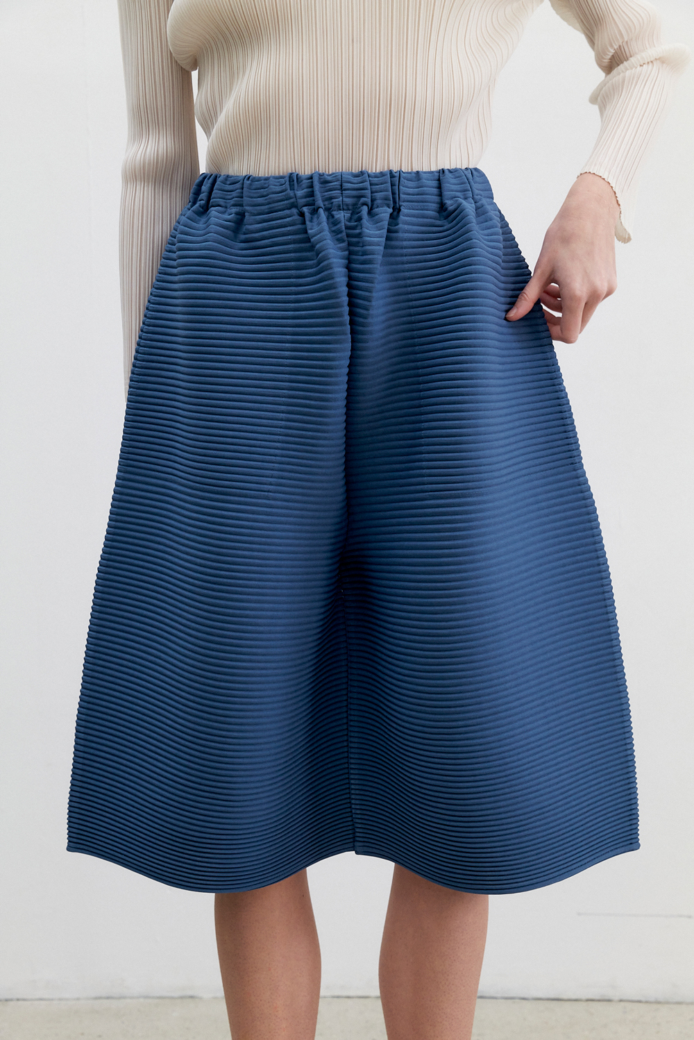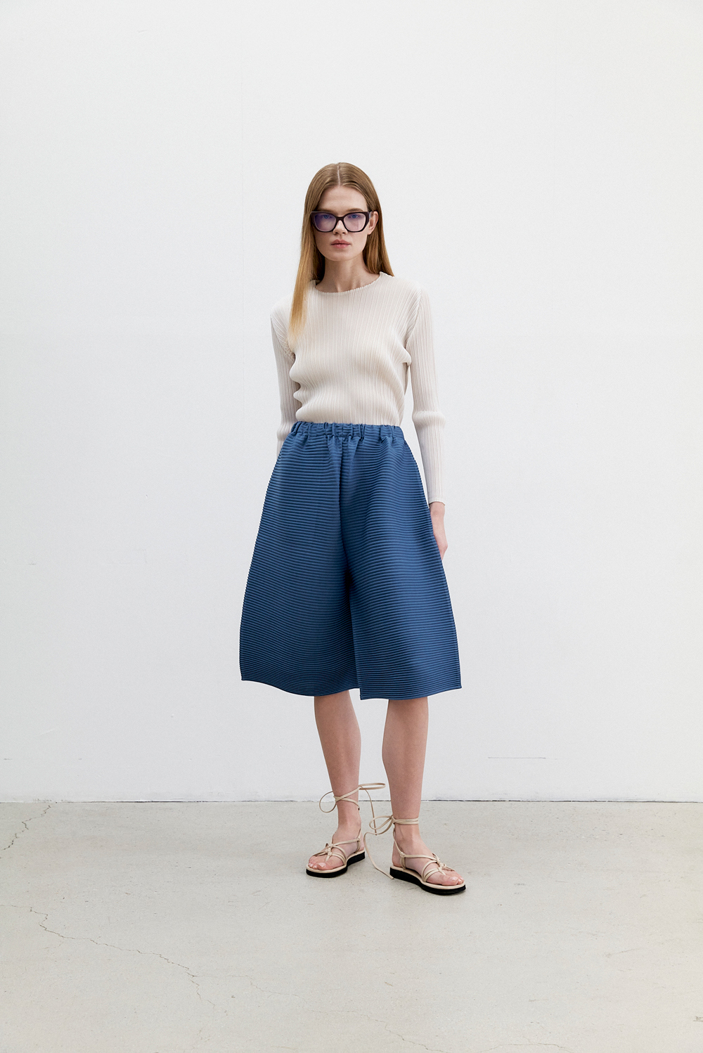 몽플리쎄 여성 가로 플리츠 버뮤다형 팬츠 블루