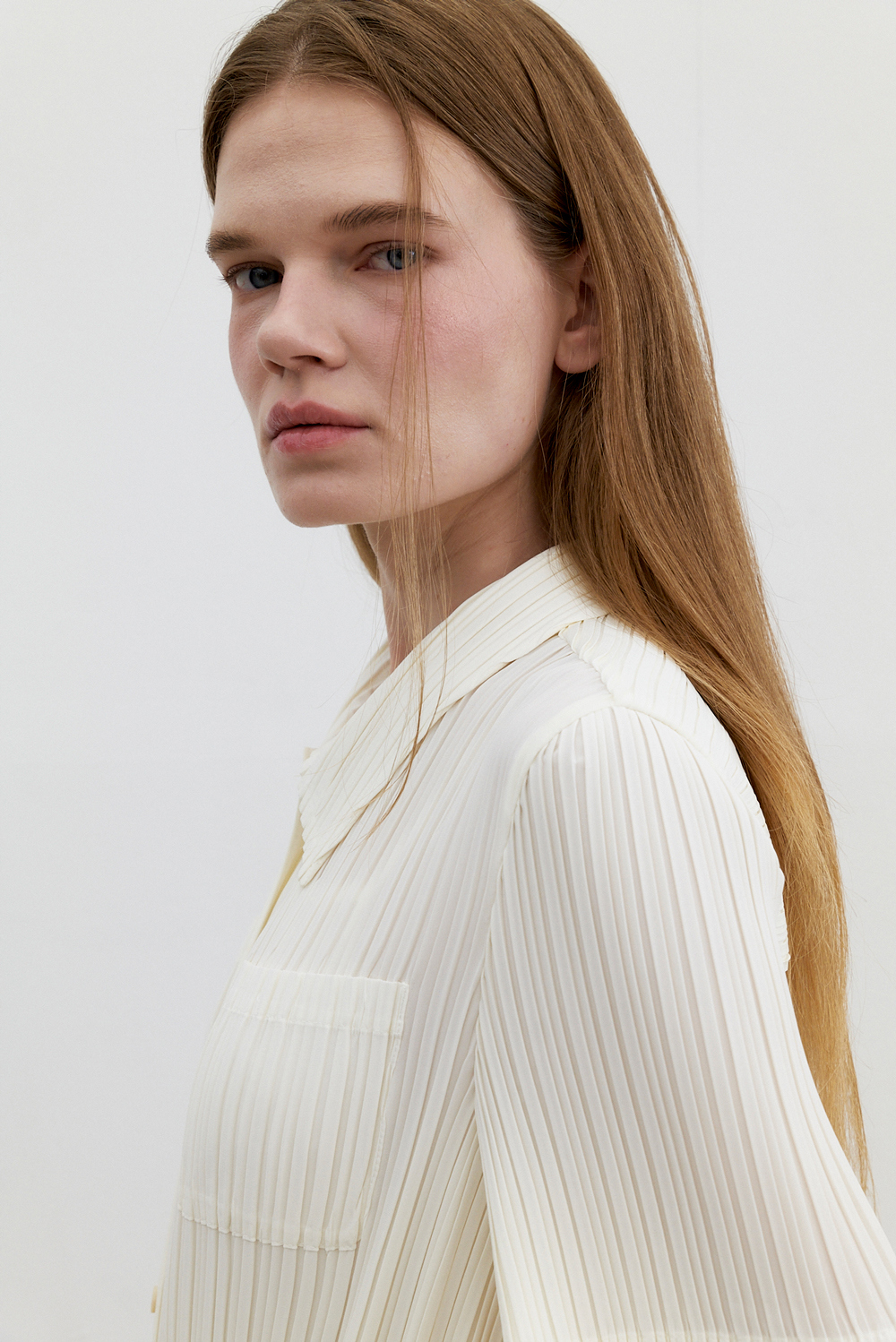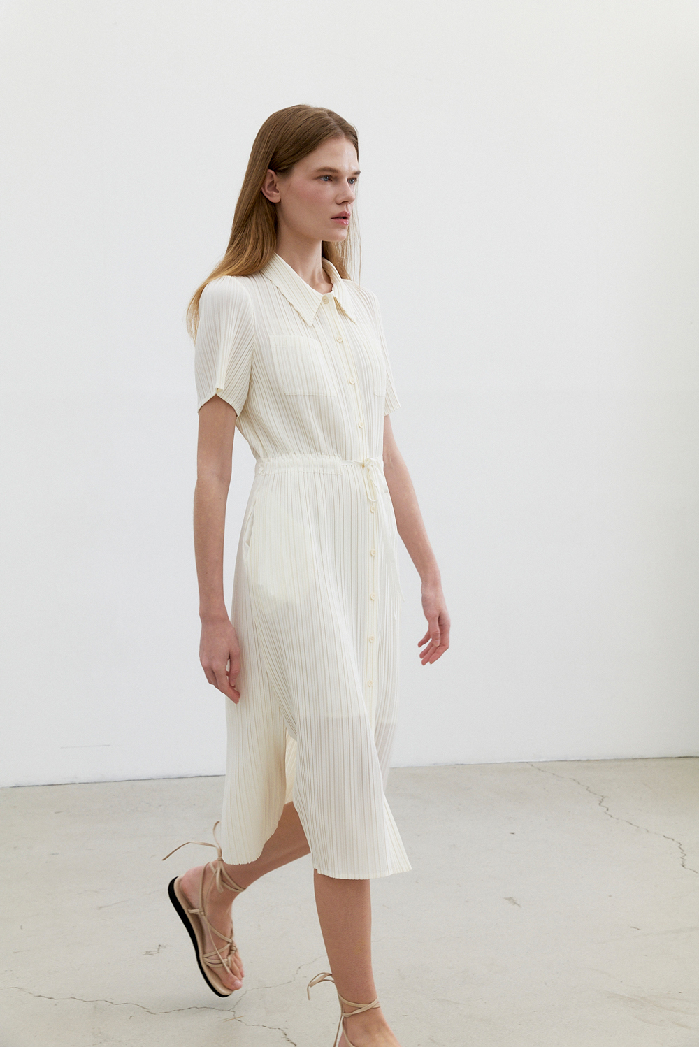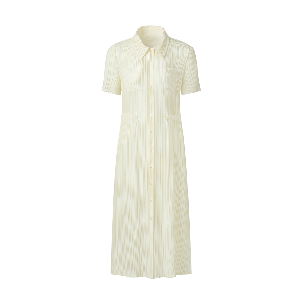 몽플리쎄 여성 카라넥 반소매 풀오픈타입 플리츠 롱 원피스 아이보리