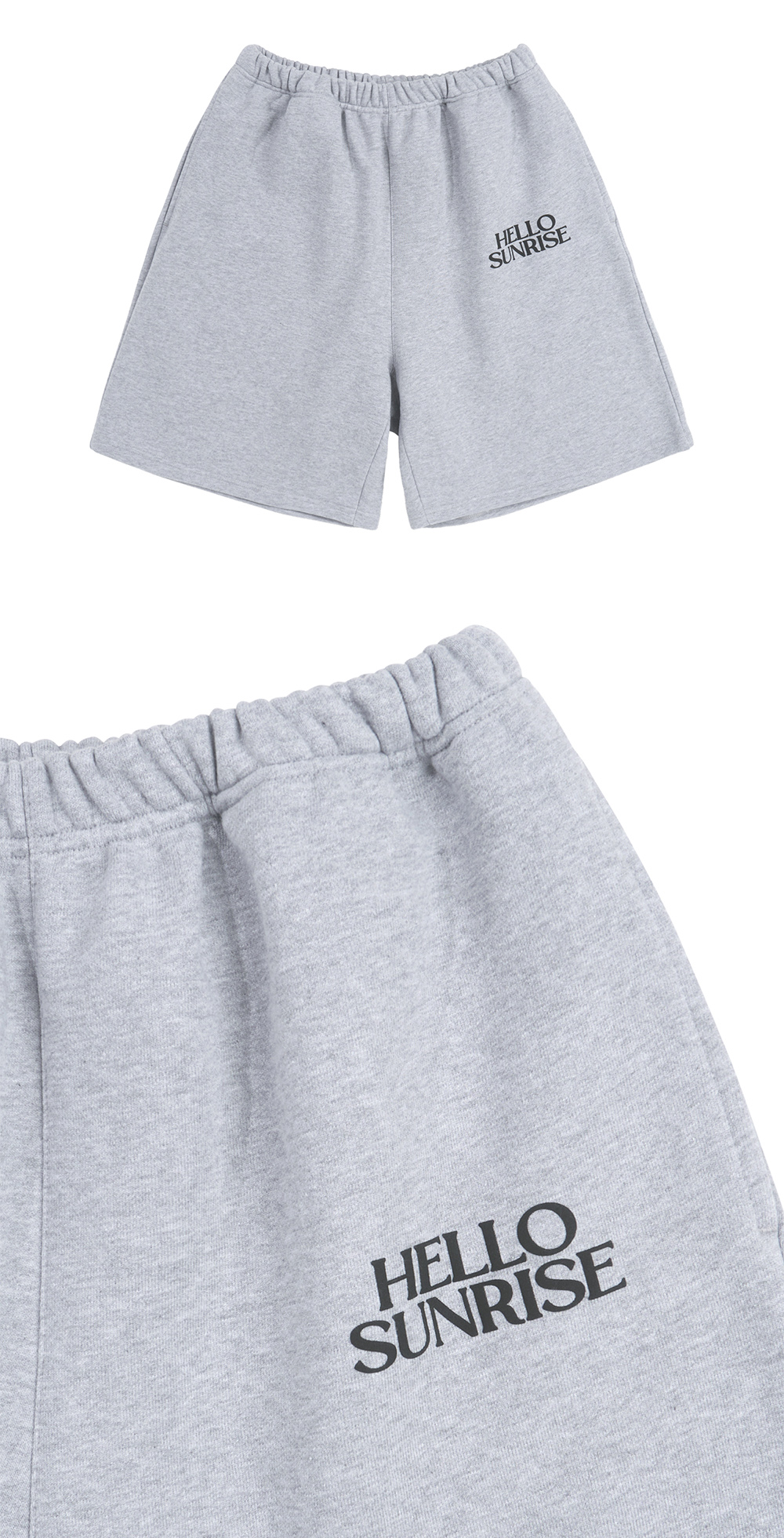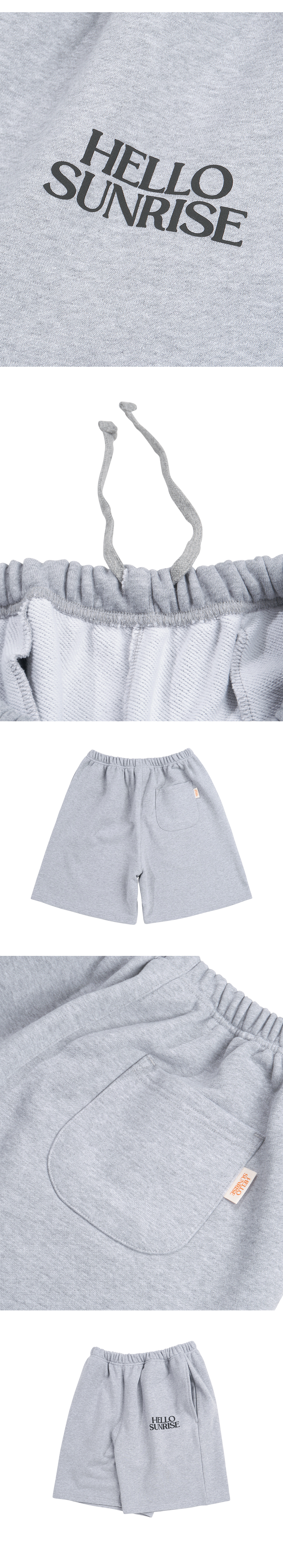 Hello Sunrise 스탠다드 핏의 남녀 공용의 하프 스웻 팬츠입니다. - 전면 헬로선라이즈 타이포 그래픽 - 전면 2개의 포켓 - 후면 1개의 아웃 포켓 - 허리 밴딩으로 사이즈 조절 용이 * 측정 기준에 따라 1-2cm의 차이가 있을 수 있습니다. * Cotton 100% Made in Korea