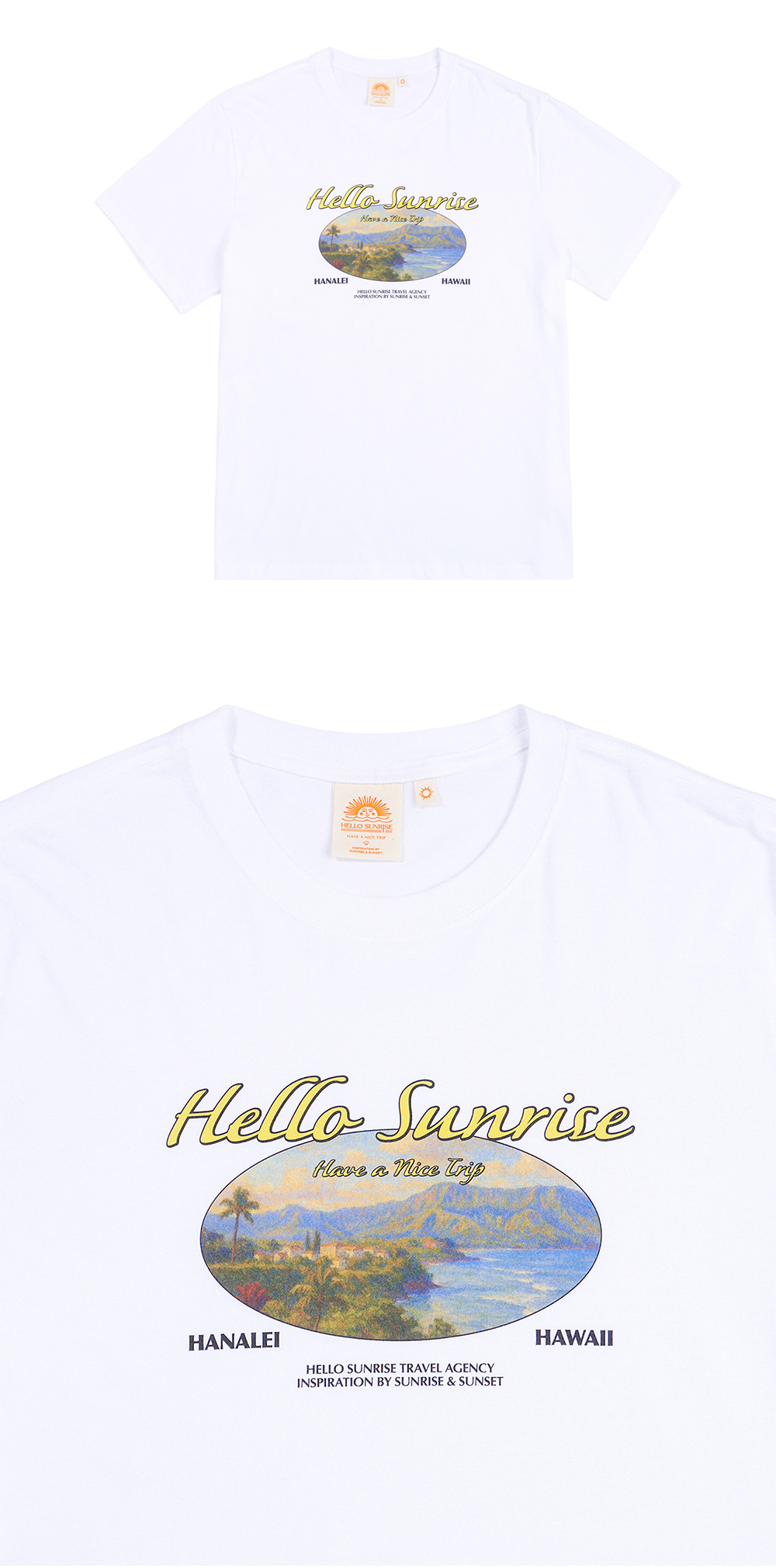Hello Sunrise 스탠다드 핏의 남녀 공용의 반팔 티셔츠입니다. - 전면 헬로선라이즈 Hanalei Bay 그래픽 - 후면 헬로선라이즈 심볼 그래픽 - 이전보다 여유로워진 사이즈와 착용감 * 측정 기준에 따라 1-2cm의 차이가 있을 수 있습니다. * Cotton 100% Made in Korea