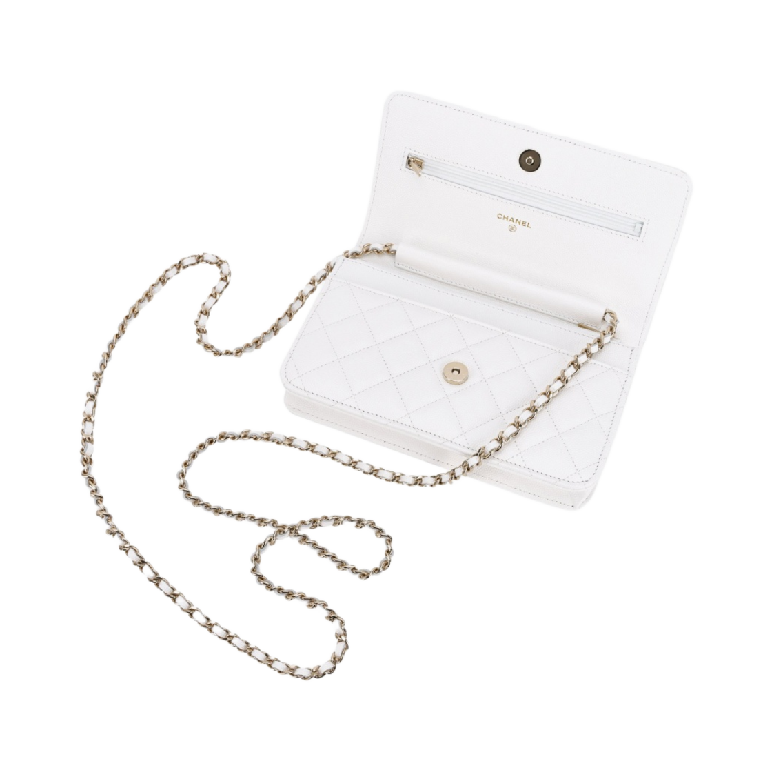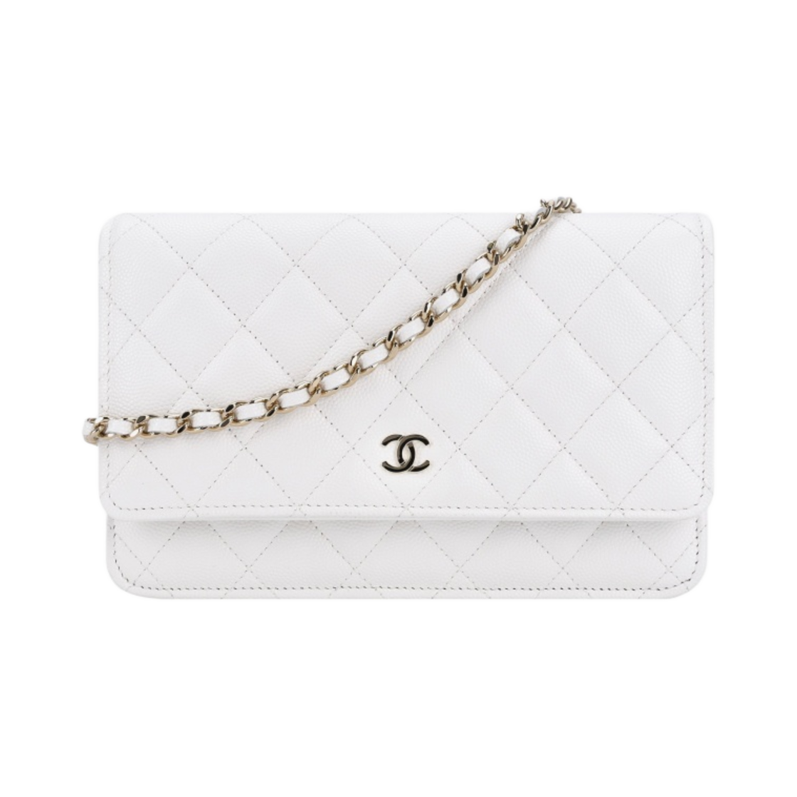 샤넬 클래식 체인 지갑 그레인드 카프스킨 & 골드 메탈 화이트