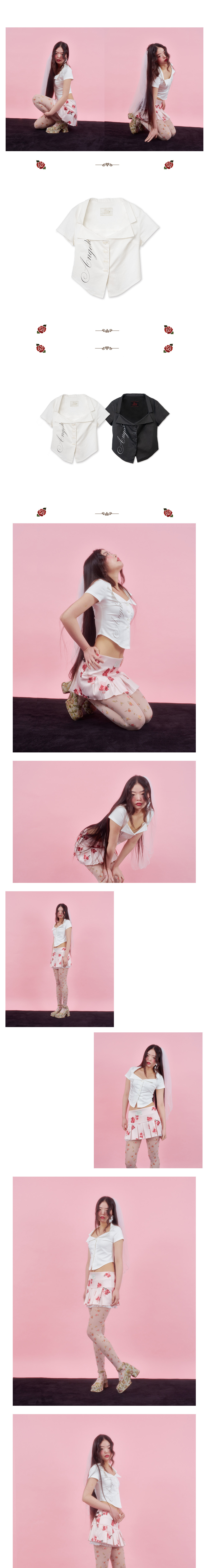 면 스판 소재로 신축성이 매우 뛰어난 소재, 더블 버튼, 독특한 넥 카라 형태, 깊은 옆 허리 파임으로 허리 얇아보이는 핏