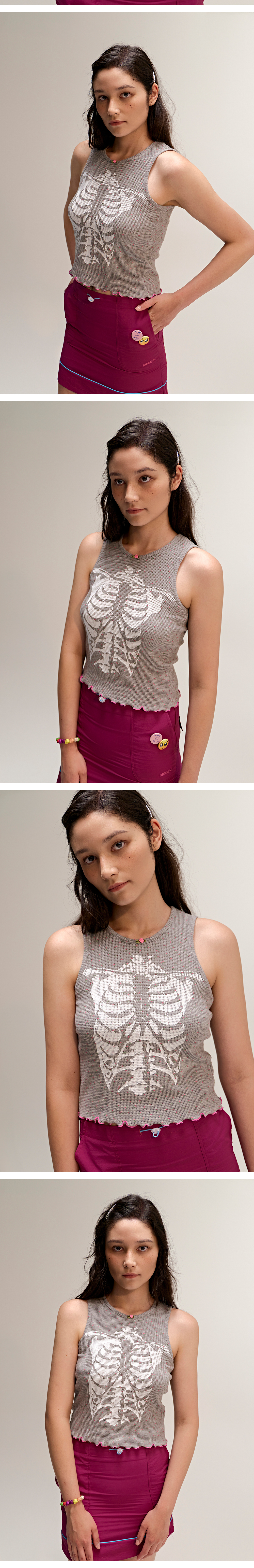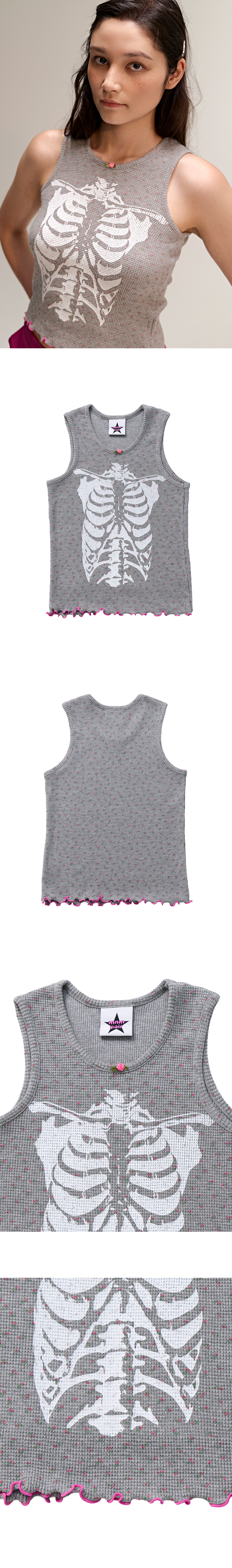 빈티지한 무드와 유니크한 디테일이 조화를 이루는 슬리브리스 탑입니다. 잔잔한 플라워 패턴의 100% 코튼 와플 조직 원단을 사용하여 가볍고 통기성이 좋으며, 여름철 단독 착용에 적합한 텍스처를 제공합니다. 전면에는 디지털 프린트 방식으로 구현한 Bone 그래픽이 강한 시각적 임팩트를 주며, 넥라인에는 장미 데코 부자재를 더해 위트 있는 포인트를 완성했습니다. 밑단에는 셀마처리(Lettuce Hem) 기법을 적용해 은은한 볼륨감과 함께 러플처럼 연출되는 마감이 특징입니다. 컬러 스티치로 마무리되어 Y2K 감성을 더합니다. 독특한 소재감과 그래픽, 디테일을 모두 담은 시즌 포인트 아이템입니다.