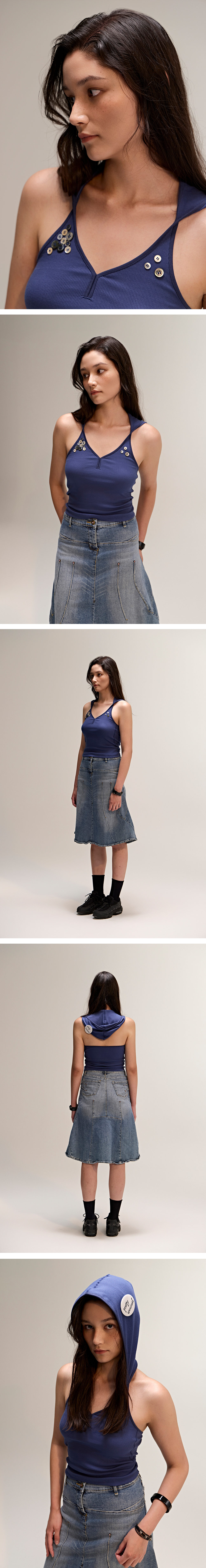 유니크한 실루엣과 디테일이 돋보이는 후드 홀터넥 슬리브리스입니다. 후드를 더한 디자인으로 스포티하면서도 개성 있는 무드를 연출하며, 절개 라인과 바디 핏이 시각적으로 슬림한 실루엣을 완성해줍니다. 프론트 상단에는 다양한 플라스틱 버튼과 자개 버튼을 믹스해 장식하여 심플한 디자인에 절개 포인트를 더했고, 입체적인 스타일링을 완성해주는 디테일입니다. Cotton 60% + Poly 35% + Span 5% 혼용 원단을 사용하여 가볍고 유연한 착용감을 제공하며, 통기성이 좋아 한여름 시즌에도 쾌적하게 착용할 수 있습니다. 단독 착용은 물론, 여행이나 바캉스 룩으로도 활용도 높은 아이템입니다.