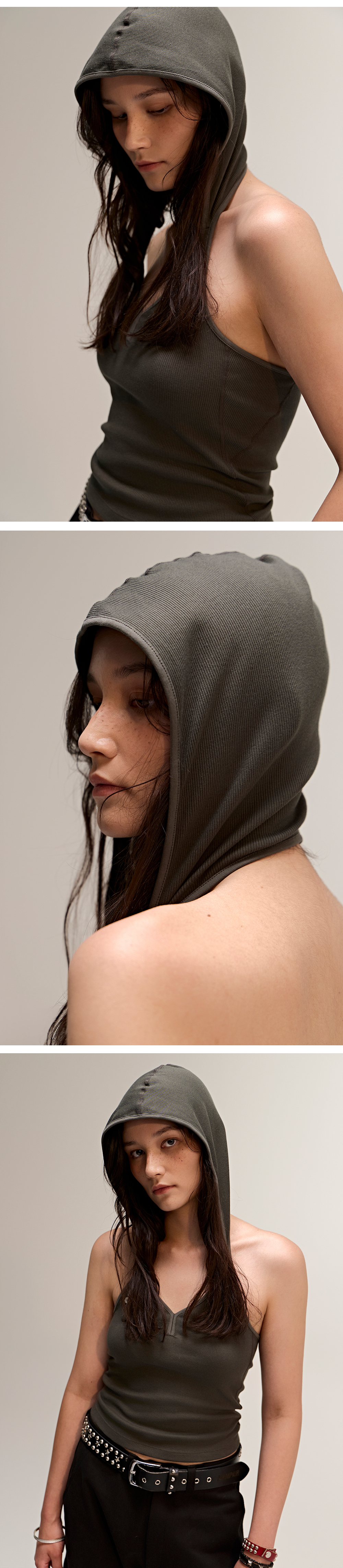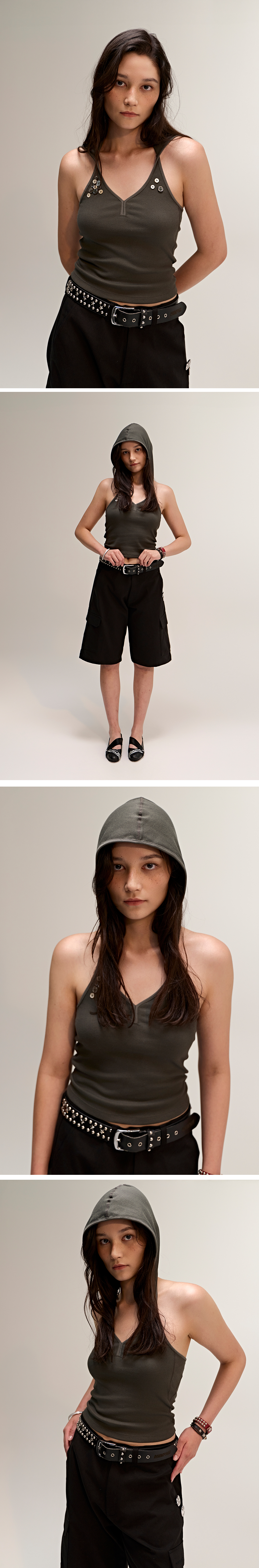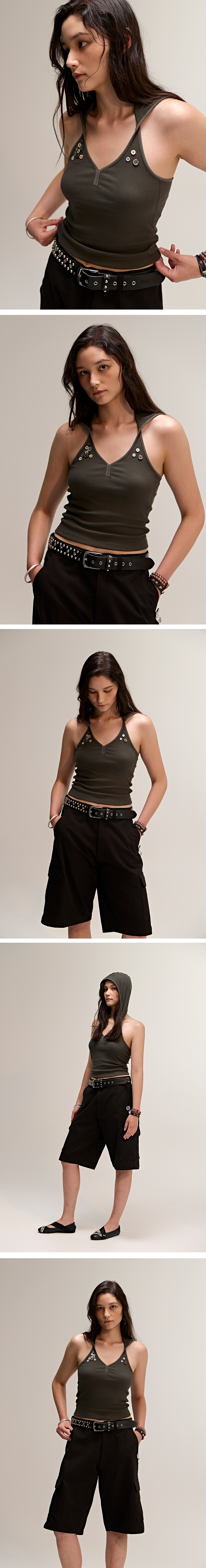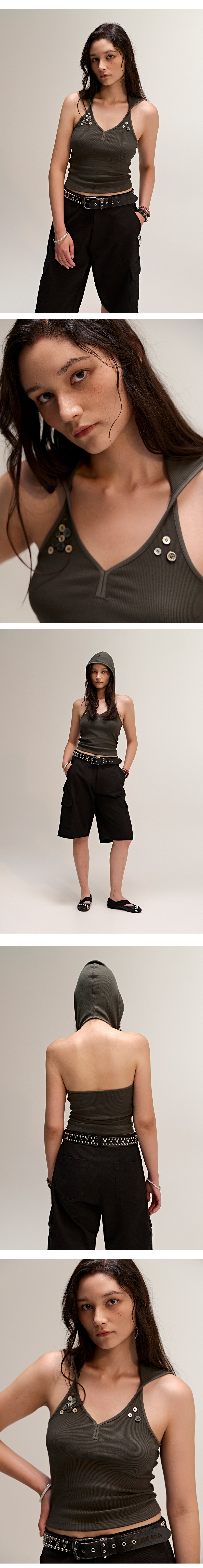 유니크한 실루엣과 디테일이 돋보이는 후드 홀터넥 슬리브리스입니다. 후드를 더한 디자인으로 스포티하면서도 개성 있는 무드를 연출하며, 절개 라인과 바디 핏이 시각적으로 슬림한 실루엣을 완성해줍니다. 프론트 상단에는 다양한 플라스틱 버튼과 자개 버튼을 믹스해 장식하여 심플한 디자인에 절개 포인트를 더했고, 입체적인 스타일링을 완성해주는 디테일입니다. Cotton 60% + Poly 35% + Span 5% 혼용 원단을 사용하여 가볍고 유연한 착용감을 제공하며, 통기성이 좋아 한여름 시즌에도 쾌적하게 착용할 수 있습니다. 단독 착용은 물론, 여행이나 바캉스 룩으로도 활용도 높은 아이템입니다.