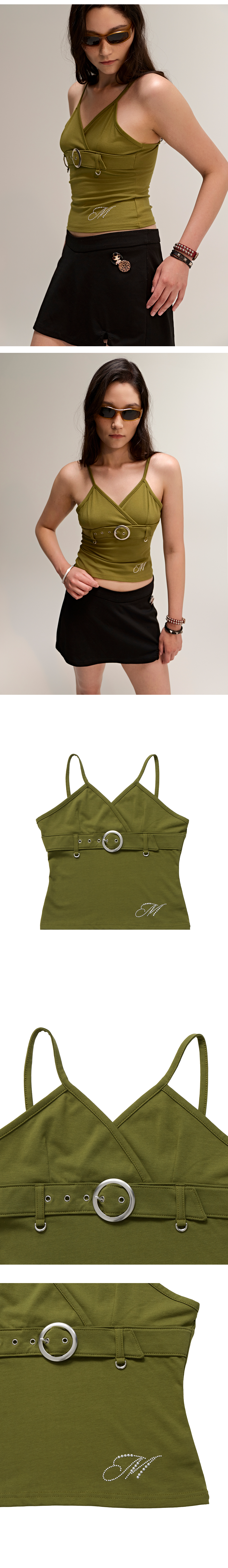 슬림한 실루엣과 구조적인 벨트 디테일이 돋보이는 스트랩 탑입니다. 바스트 라인을 따라 자연스럽게 교차되는 컷팅과 얇은 숄더 스트랩이 세련된 분위기를 연출하며, 바디를 안정감 있게 잡아주는 와이드 벨트가 전체적인 비율을 조화롭게 정돈해줍니다. 소재는 Cotton 95% + Span 5% 혼용으로 부드러운 터치감과 유연한 신축성을 동시에 갖추었으며, 움직임에 따라 자연스럽게 늘어나 편안한 착용감을 제공합니다. 프론트 벨트의 메탈 버클과 실버 아이렛, 밑단의 크리스탈 핫픽스 'M' 로고가 포인트 디테일로 더해져 심플한 디자인 안에서도 감각적인 무드를 더해줍니다.