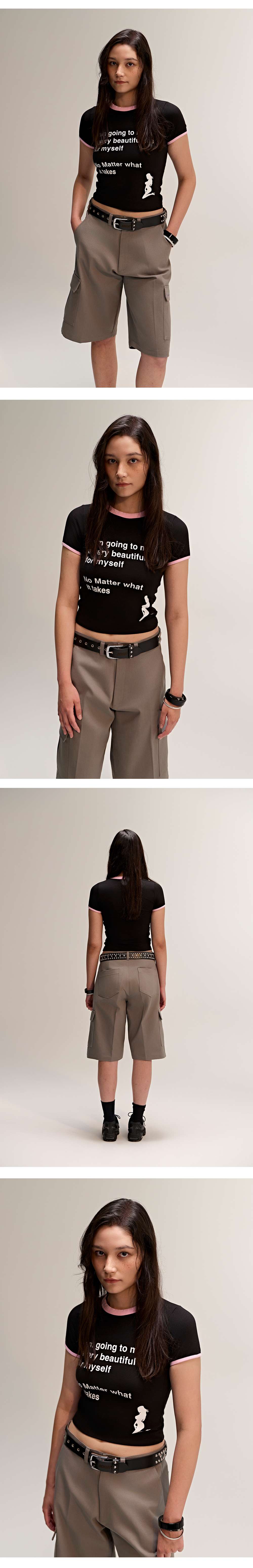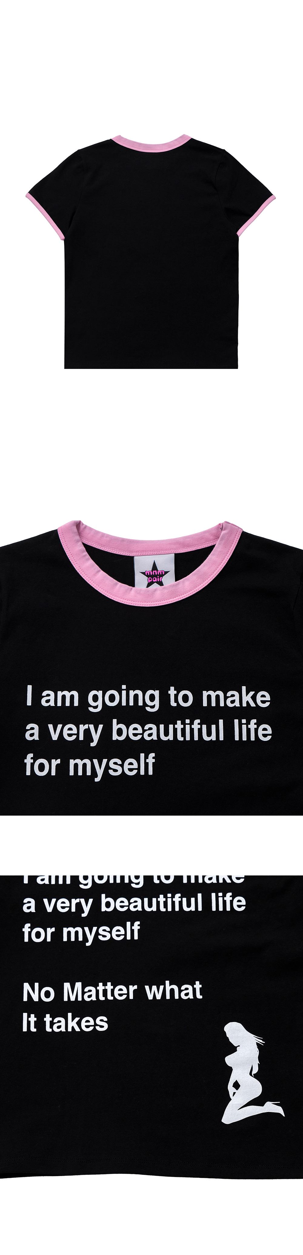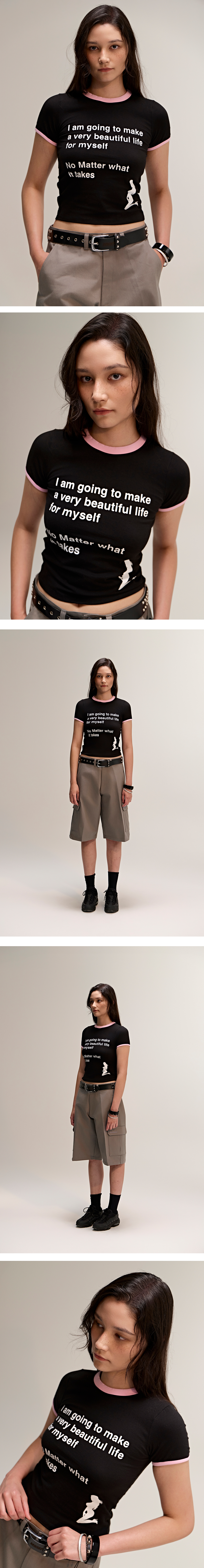 강한 자기 확신과 주체적인 삶에 대한 메시지를 담은 크롭 링거 티셔츠입니다. "I am going to make a very beautiful life for myself. No matter what it takes." 직관적인 레터링과 실루엣 그래픽을 통해 섹시하면서도 독립적인 여성의 태도를 시각화했습니다. 특히 문구 중 ‘No’의 대문자 표기는 강조된 결심과 의지를 표현하기 위한 의도적인 디테일입니다. Combed Cotton 96% + Span 4% 소재를 사용하여 부드러운 촉감과 유연한 신축성을 동시에 갖췄으며, 활동량이 많은 일상 속에서도 편안한 착용감을 제공합니다. 바디에 밀착되는 슬림 핏과 짧은 기장감으로 시그니처 룩을 연출할 수 있는 아이템입니다. 넥 라인과 소매 끝의 배색 디테일로 링거 스타일 특유의 레트로 무드를 더했습니다.