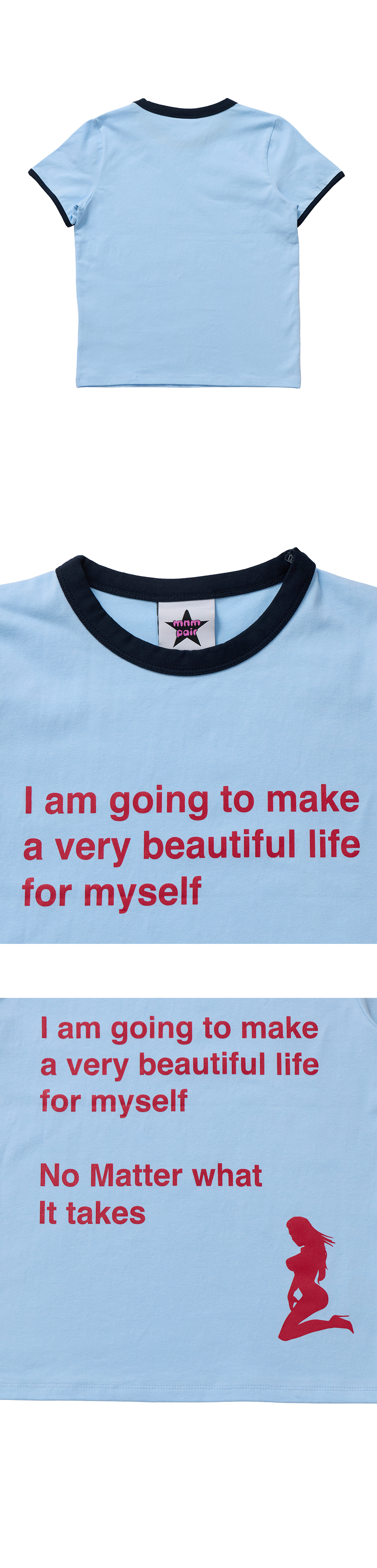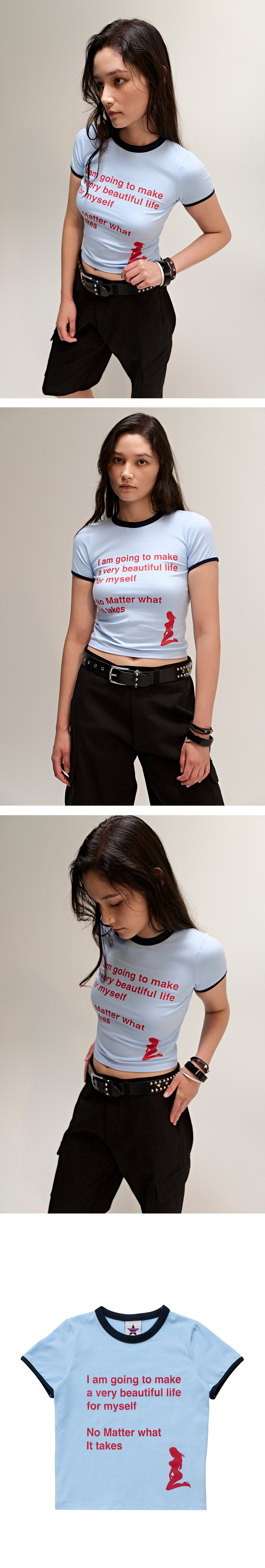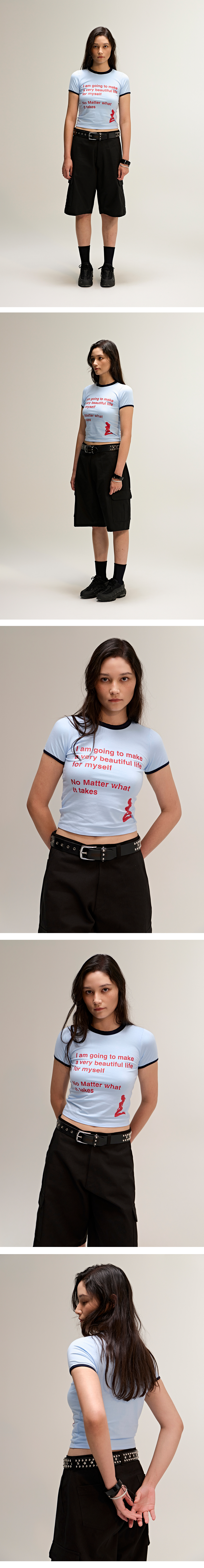 강한 자기 확신과 주체적인 삶에 대한 메시지를 담은 크롭 링거 티셔츠입니다. "I am going to make a very beautiful life for myself. No matter what it takes." 직관적인 레터링과 실루엣 그래픽을 통해 섹시하면서도 독립적인 여성의 태도를 시각화했습니다. 특히 문구 중 ‘No’의 대문자 표기는 강조된 결심과 의지를 표현하기 위한 의도적인 디테일입니다. Combed Cotton 96% + Span 4% 소재를 사용하여 부드러운 촉감과 유연한 신축성을 동시에 갖췄으며, 활동량이 많은 일상 속에서도 편안한 착용감을 제공합니다. 바디에 밀착되는 슬림 핏과 짧은 기장감으로 시그니처 룩을 연출할 수 있는 아이템입니다. 넥 라인과 소매 끝의 배색 디테일로 링거 스타일 특유의 레트로 무드를 더했습니다.
