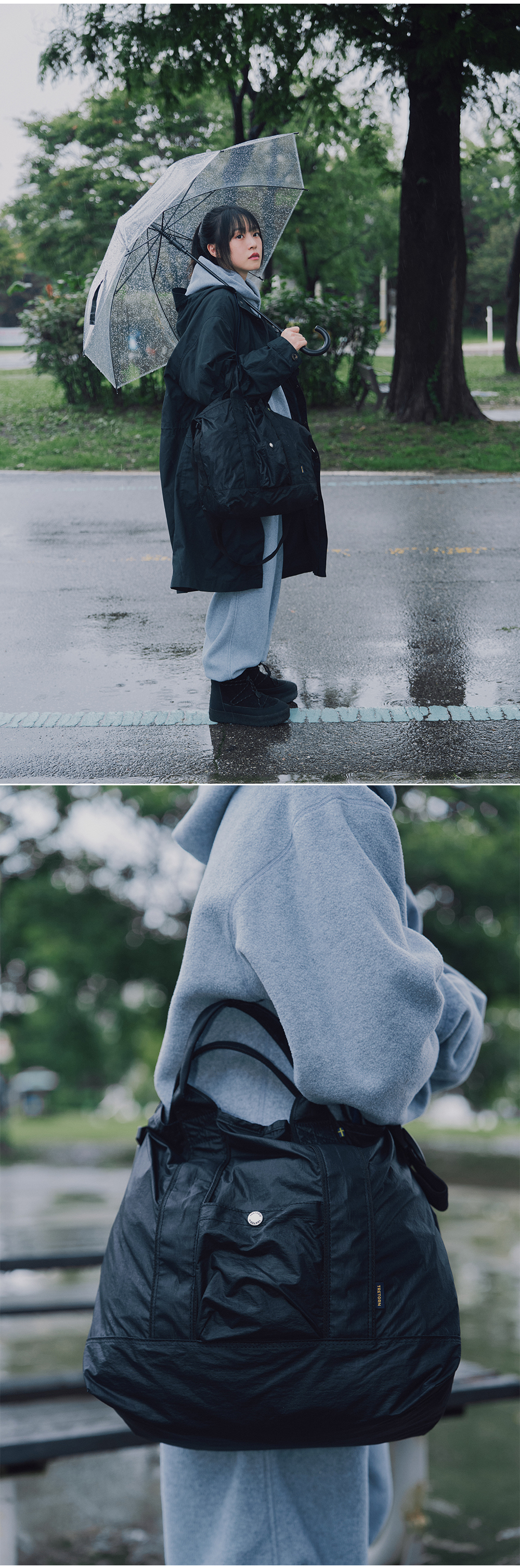나일론 립 토트백은 가벼우면서도 탄탄하고 강한 내구성을 가진 립스탑 소재를 사용하였으며, 전면의 작은 포켓이 포인트로 있으며 사이드에 카라비너로 추가적인 악세서리를 부착할 수 있어 일상용 뿐만 아니라 여행 및 아웃도어 활동에도 적합한 가방입니다.