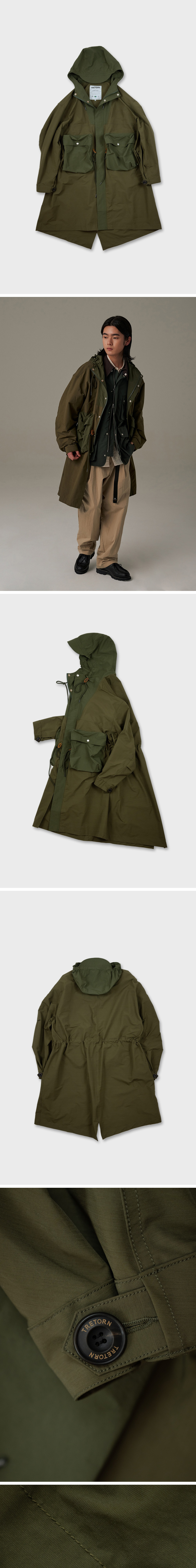 나일론 피쉬테일 후디 파카는 소재 믹스와 플랫 포켓이 디자인적 요소를 강조했으며, 방수 기능을 갖춰 일상은 물론 우천 시에도 활용할 수 있는 아우터입니다.