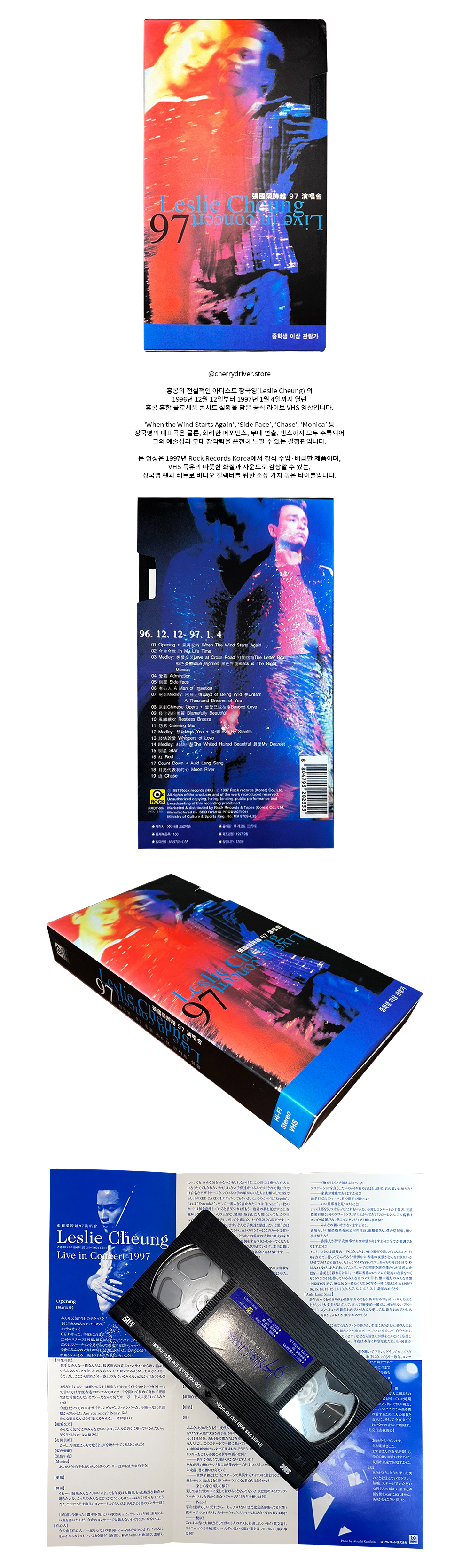 @cherrydriver.store 홍콩의 전설적인 아티스트 장국영(Leslie Cheung) 의 1996년 12월 12일부터 1997년 1월 4일까지 열린 홍콩 홍함 콜로세움 콘서트 실황을 담은 공식 라이브 VHS 영상입니다. ‘When the Wind Starts Again’, ‘Side Face’, ‘Chase’, ‘Monica’ 등 장국영의 대표곡은 물론, 화려한 퍼포먼스, 무대 연출, 댄스까지 모두 수록되어 그의 예술성과 무대 장악력을 온전히 느낄 수 있는 결정판입니다. 본 영상은 1997년 Rock Records Korea에서 정식 수입·배급한 제품이며, VHS 특유의 따뜻한 화질과 사운드로 감상할 수 있는, 장국영 팬과 레트로 비디오 컬렉터를 위한 소장 가치 높은 타이틀입니다.