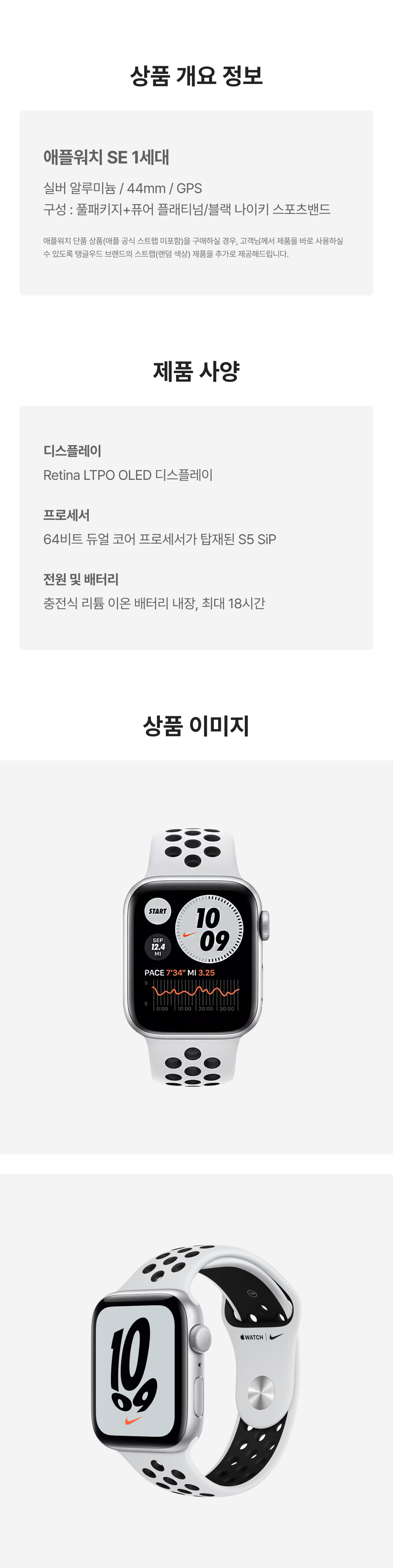 [B등급] 리퍼비시 애플 워치 SE 44mm GPS 실버 알루미늄 케이스 나이키 스포츠 밴드 퓨어 플래티넘 블랙