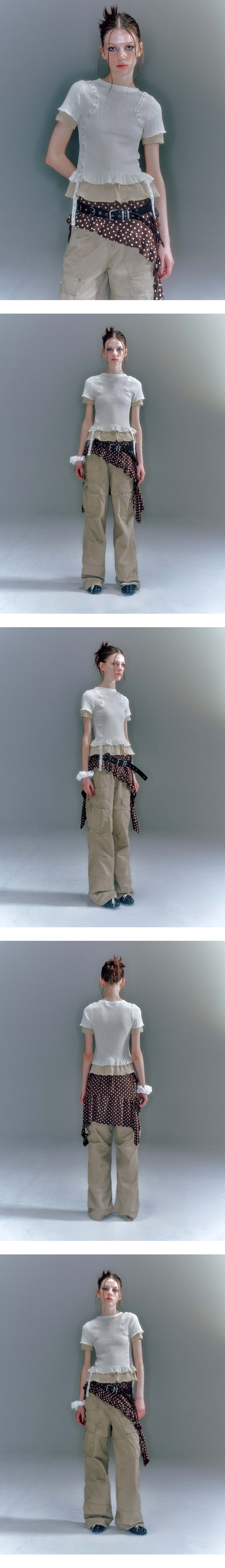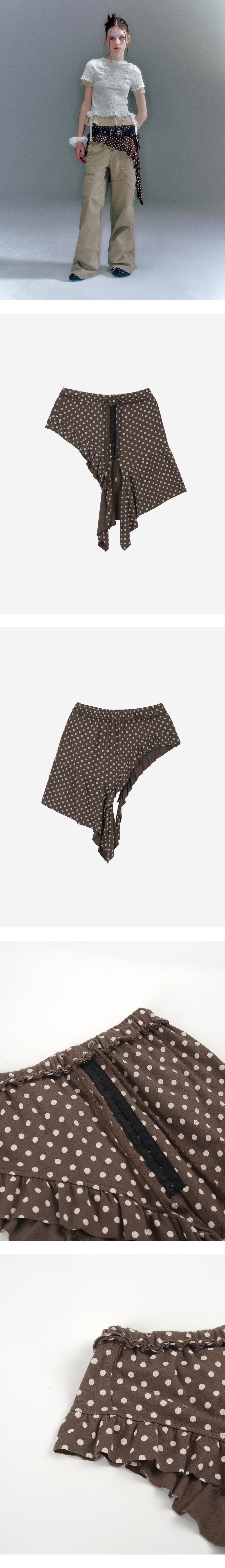 - 도트 무늬 면 원단으로 제작된 레이어드 스커트 - 허리 밴딩으로 허리 사이즈 조절 가능 - 언발란스한 기장감으로 유니크한 무드 연출 가능 - 후크 테이프, 구슬 장식 디테일