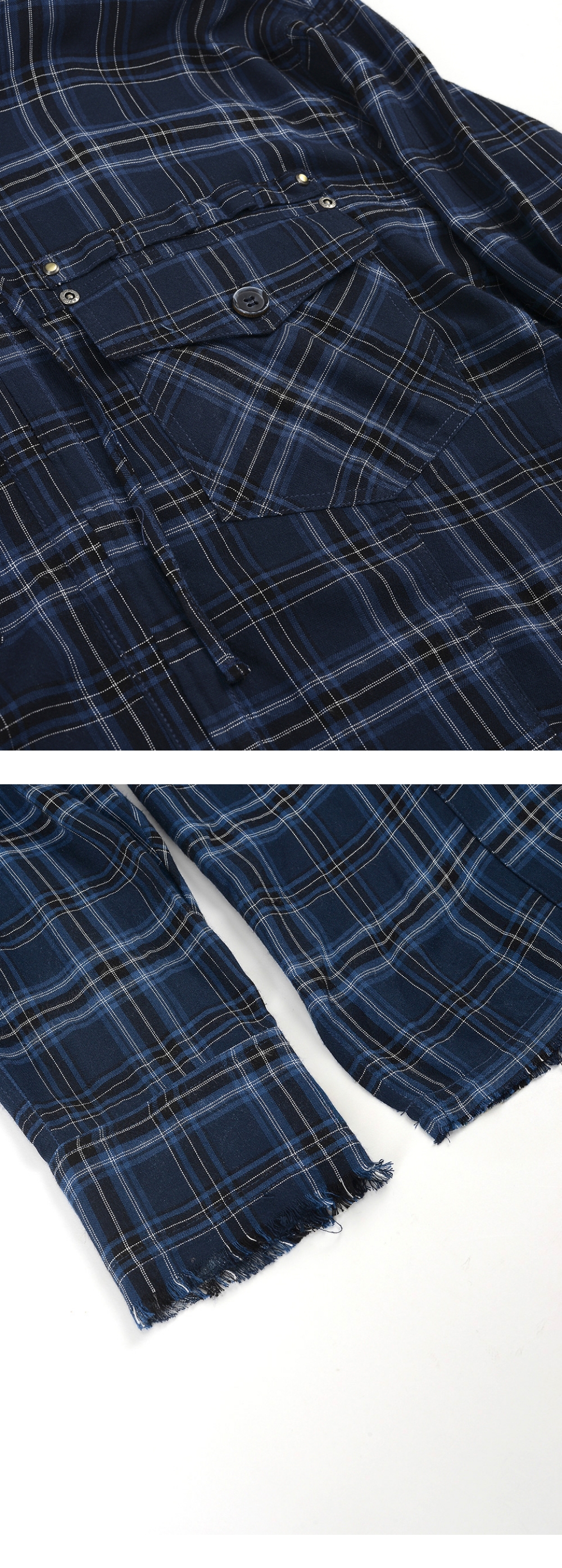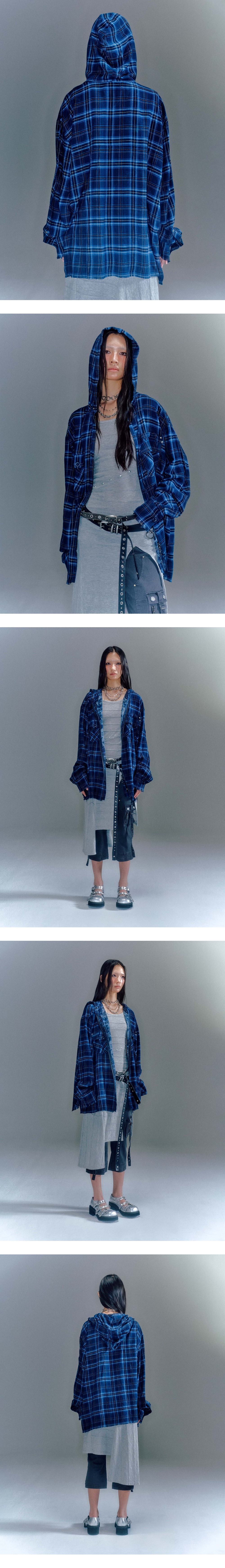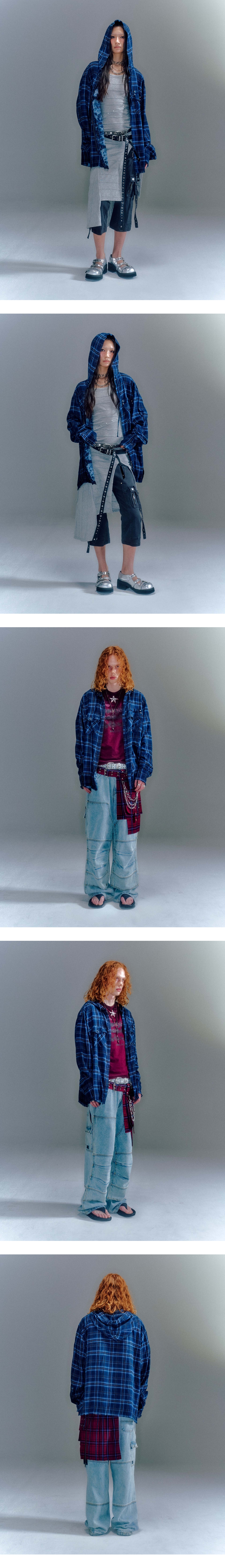 - 와이드 실루엣의 체크 후드 셔츠 - 얇은 두께감에 흐르는 실루엣 - 안쪽에 나염 가공이 들어간 소재 사용 - 내추럴한 밑단 컷팅 가공 디테일 - 베이컨트 제작 리벳 사용