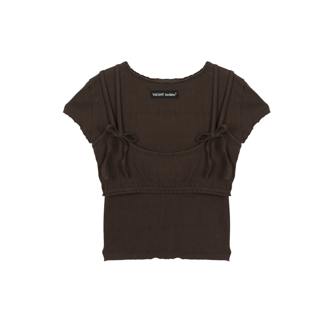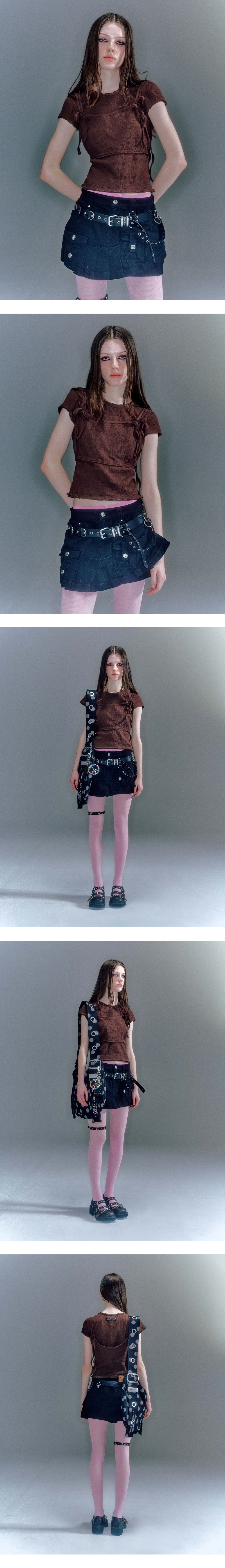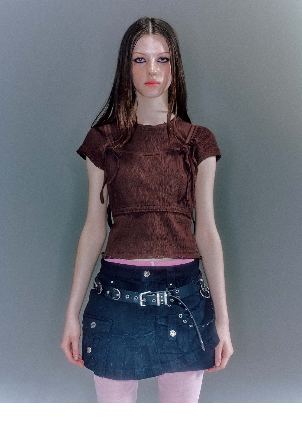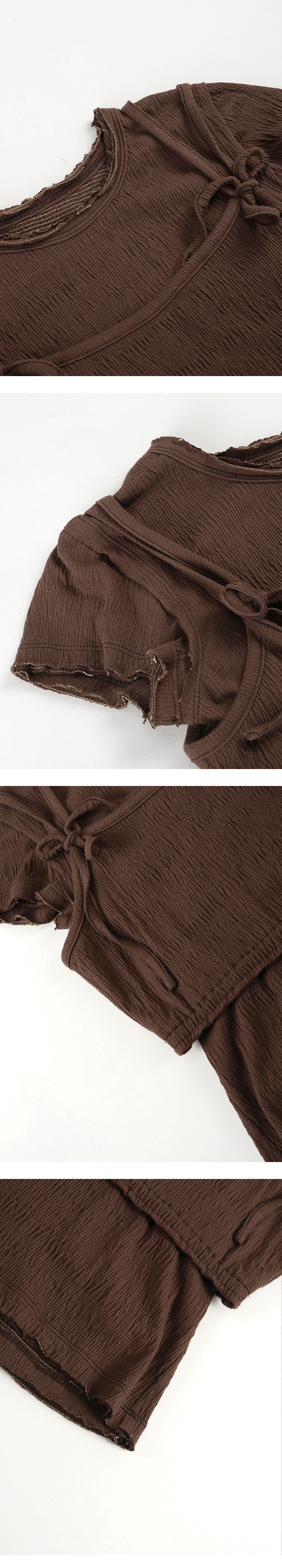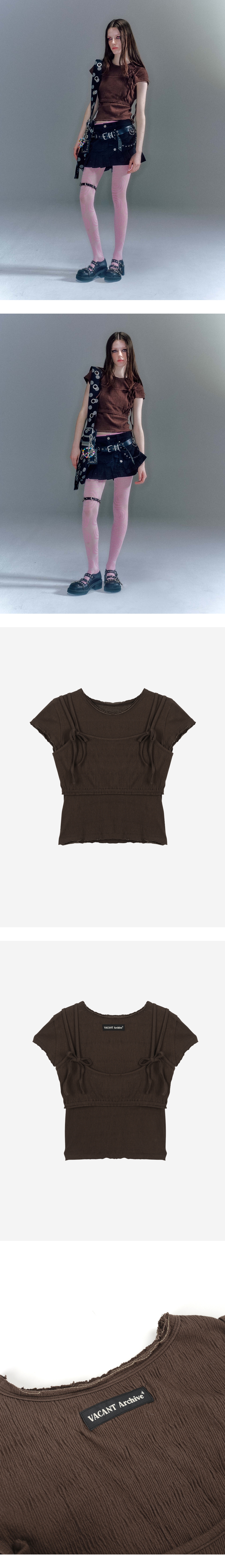 - 뷔스티에 & 반팔 티셔츠 세트 구성 - 링클 가공된 원단 사용하여 편안한 신축성 - 넥과 소매 부분 레이어드 데끼 디테일 - 뷔스티에 어깨끈 리본 매듭 포인트