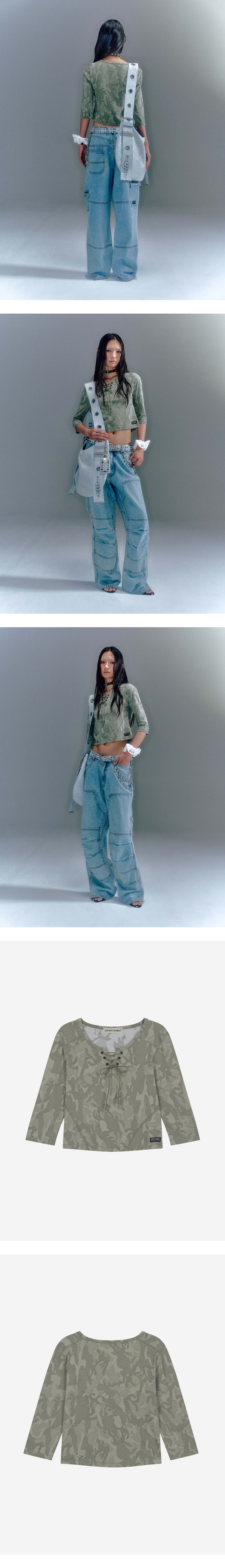 - 슬림핏 7부 소매 티셔츠 - 앞판 레이스업 디테일 포인트 - 웨이스트 라인을 따라 들어간 오드람프 절개선 포인트 - 빈티지한 카모 플라쥬 패턴으로 빈티지하고 스트리한 감성 연출