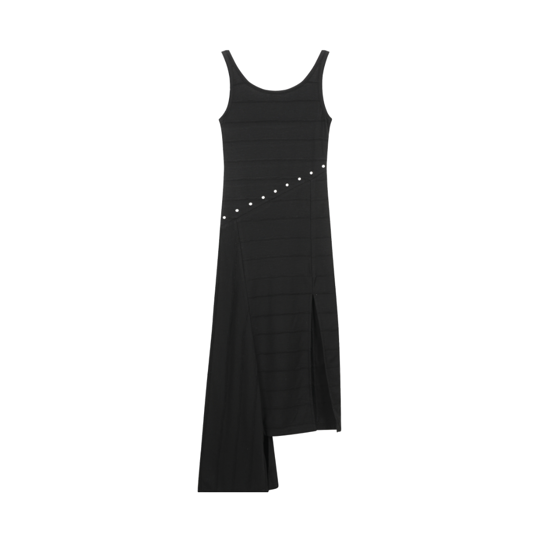 - 바디라인을 따라 떨어지는 슬림핏 롱 원피스 - 언밸런스 컷& 사이드 슬릿으로 레이어드 코디에 활용 - 앞쪽 사선 절개선과 핫픽스 디테일 - 앞뒤 네크라인의 변형과 짧은 암홀로 깔끔한 상체 핏 연출